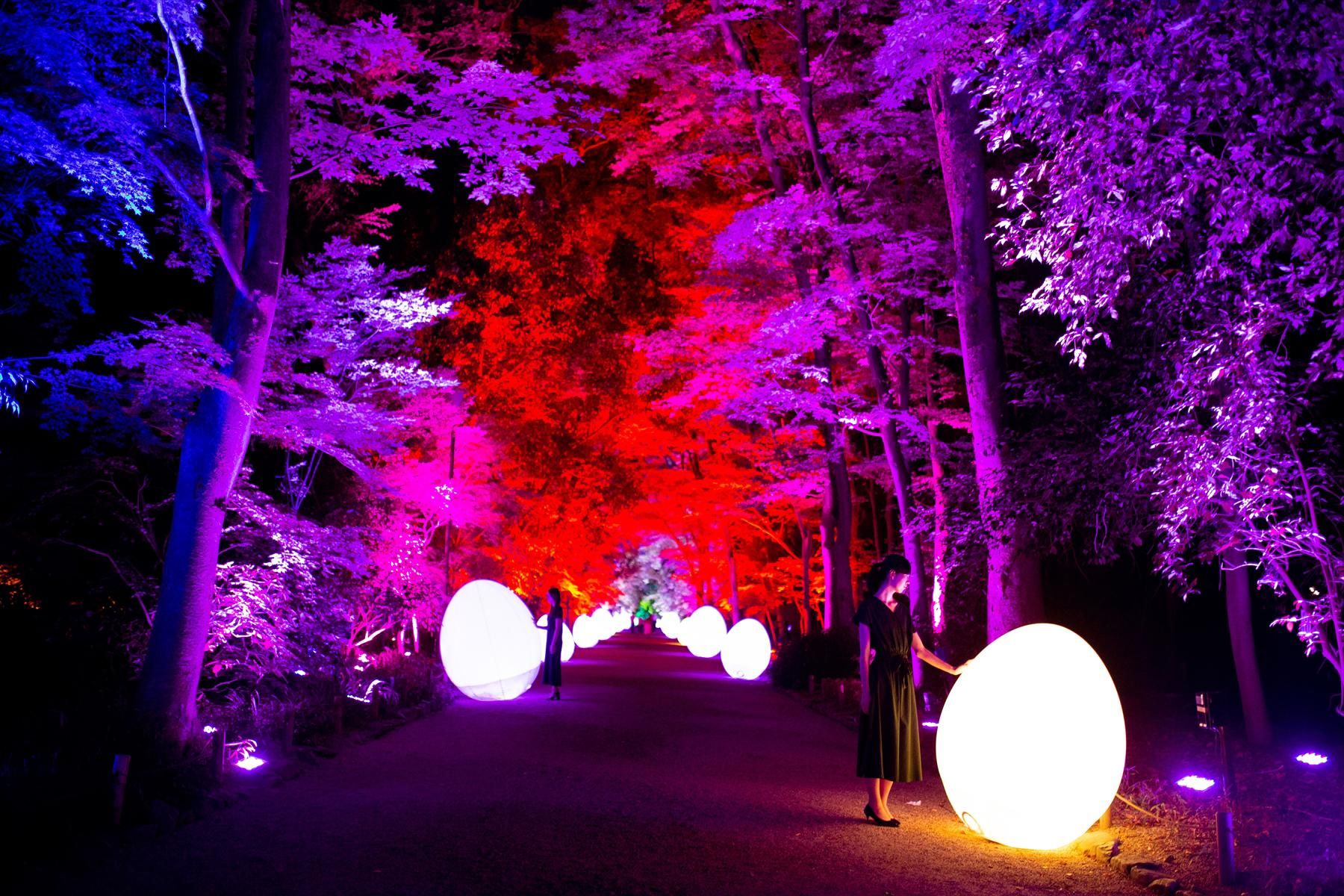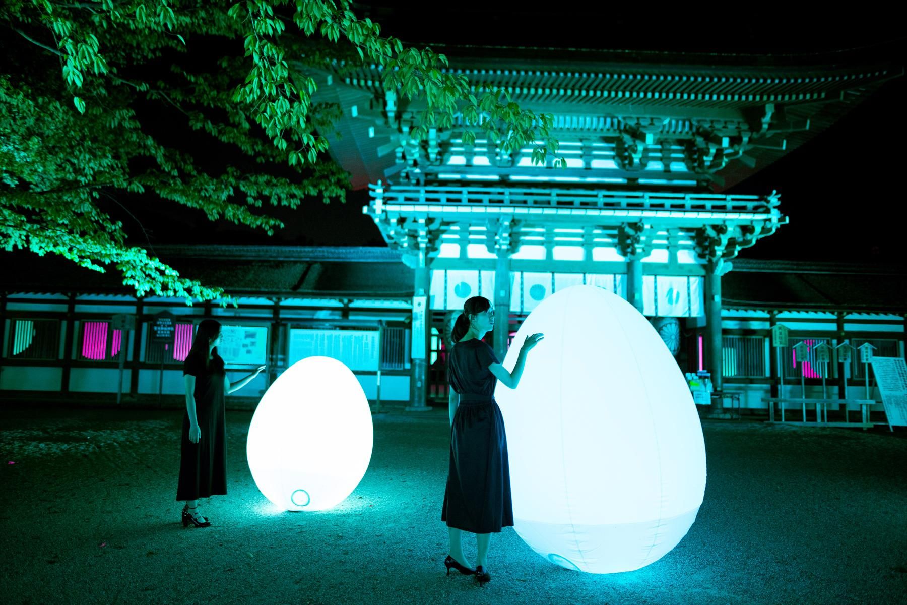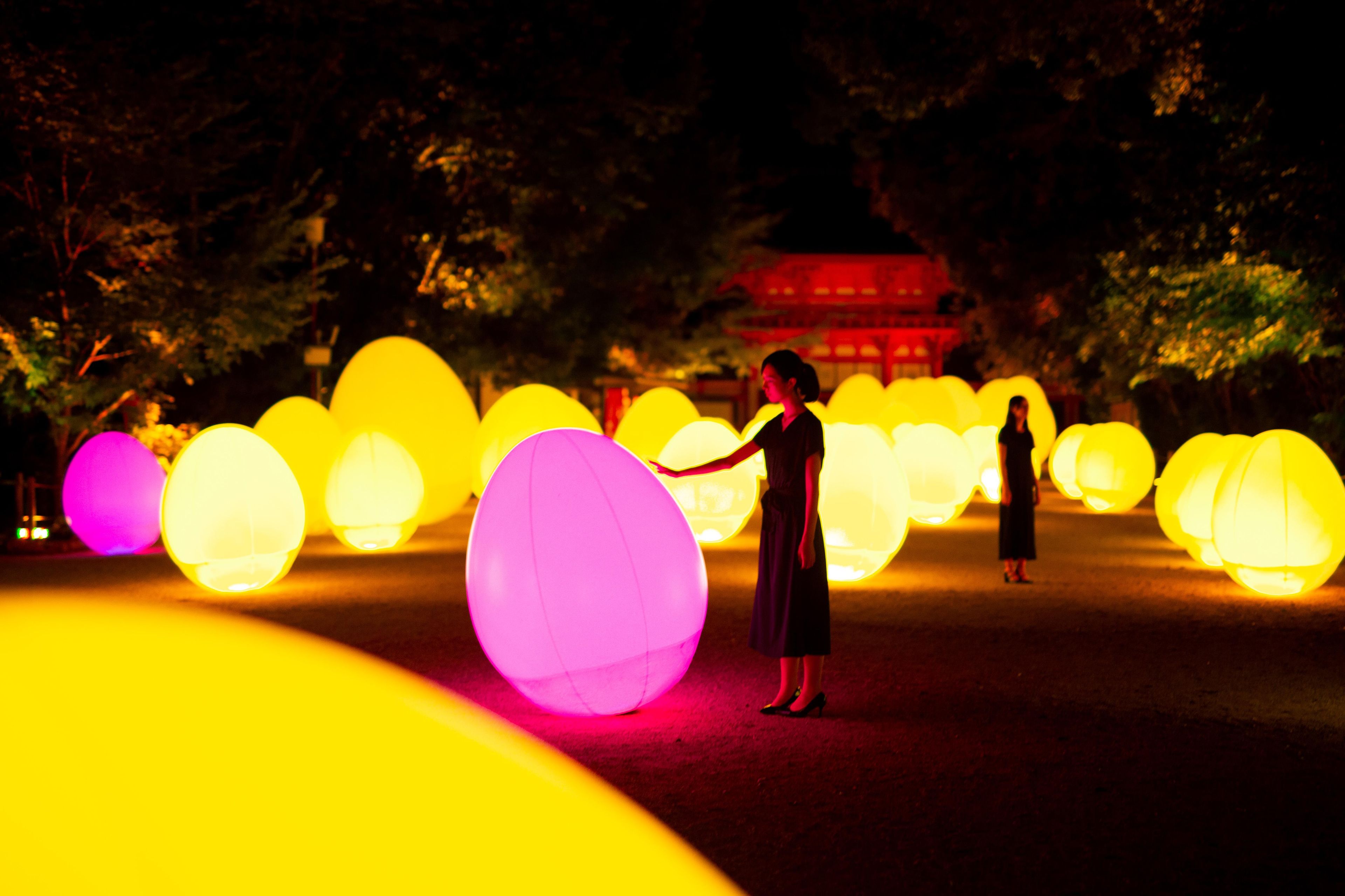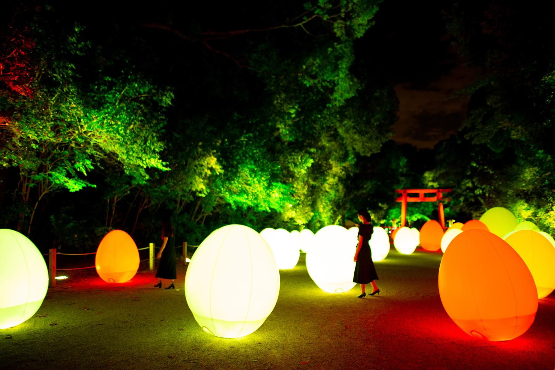 Tadasu Forest has been turned into an art space with the installations Resisting and Resonating Ovoids and Forest and Floating, Resonating Spheres – Shimogamo Shrine, the road approaching Shimogamo shrine and the tower gate become light artworks that are changed by people’s presence.
