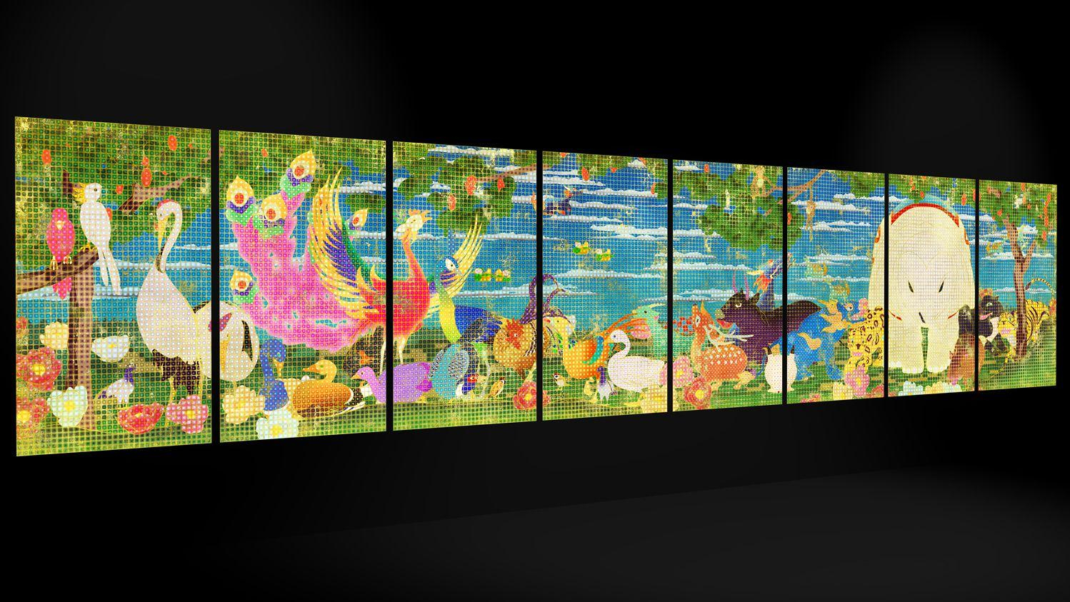 Seen as a whole from a distance the colors of Nirvana shine brilliantly due to visual mixing, and moves on a slow time axis. When viewed closer the color that is created by the pattern of the animals and plants moves rapidly, but the squares on the screen do not move and the result is a world that changes on a fast time axis. The combined result is a new visual expression of an overwhelming amount of information, the animation of the animals and the images of the squares with two time axes coexisting.