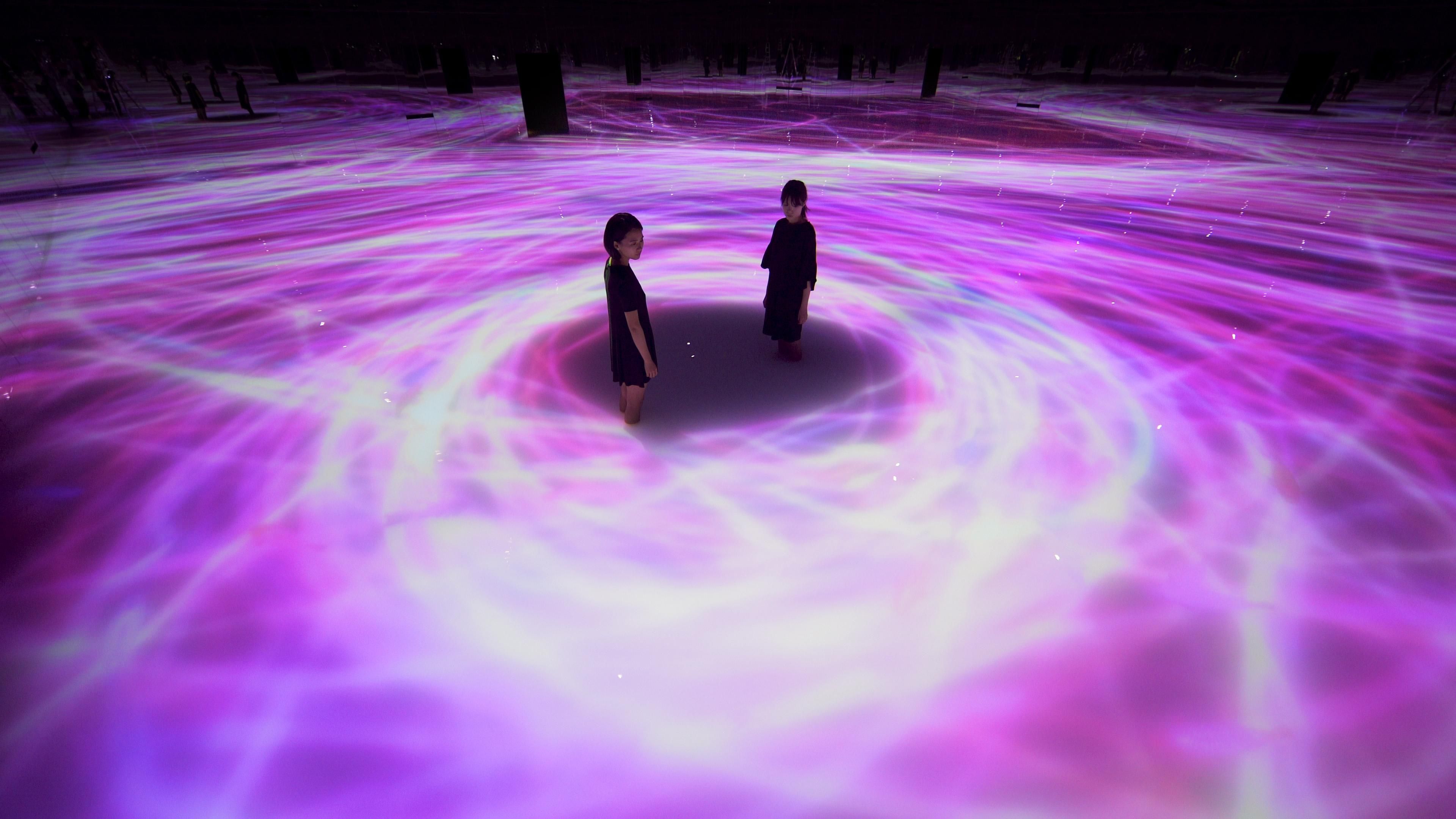 무한히 펼쳐지는 수면 위로 잉어가 헤엄치고 있다. 사람들은 물속으로 걸어 들어간다.