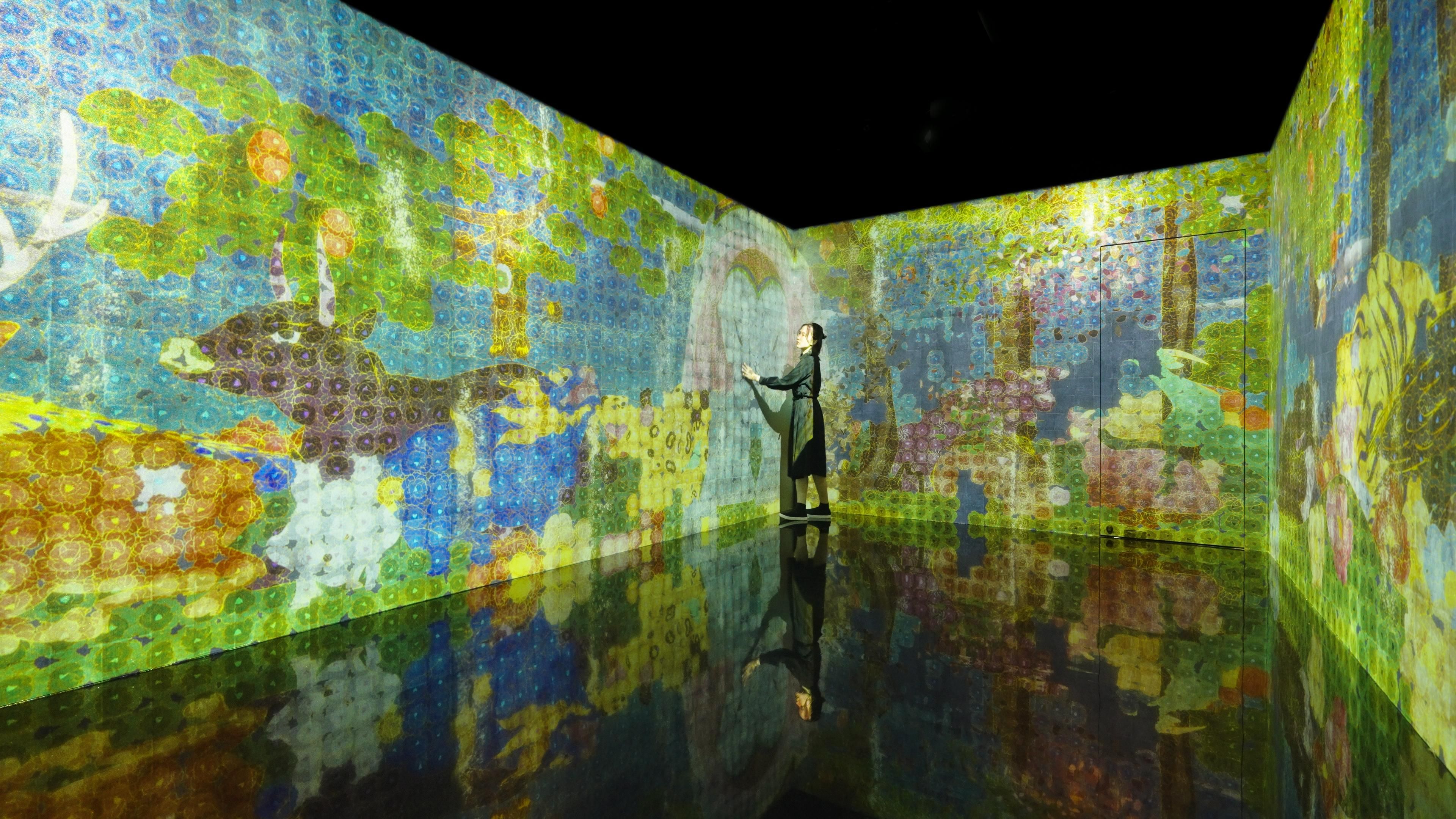 이토 자쿠추(伊藤若冲, 1716 - 1800)는 근세 일본의 화가 중 한 명으로 에도 시대 중기 교토에서 활동했다. 자쿠추는 화면 전체를 수만 개의 격자 모양으로 나누어 격자마다 채색하는 '격자화(升目画)'라는 특이한 표현 기법을 남겼다. 본 작품은 '조수화목도병풍(鳥獣花木圖屏風)'과 '수화조수도병풍(樹花鳥獣圖屏風)'을 모티브로 하고 있다.
