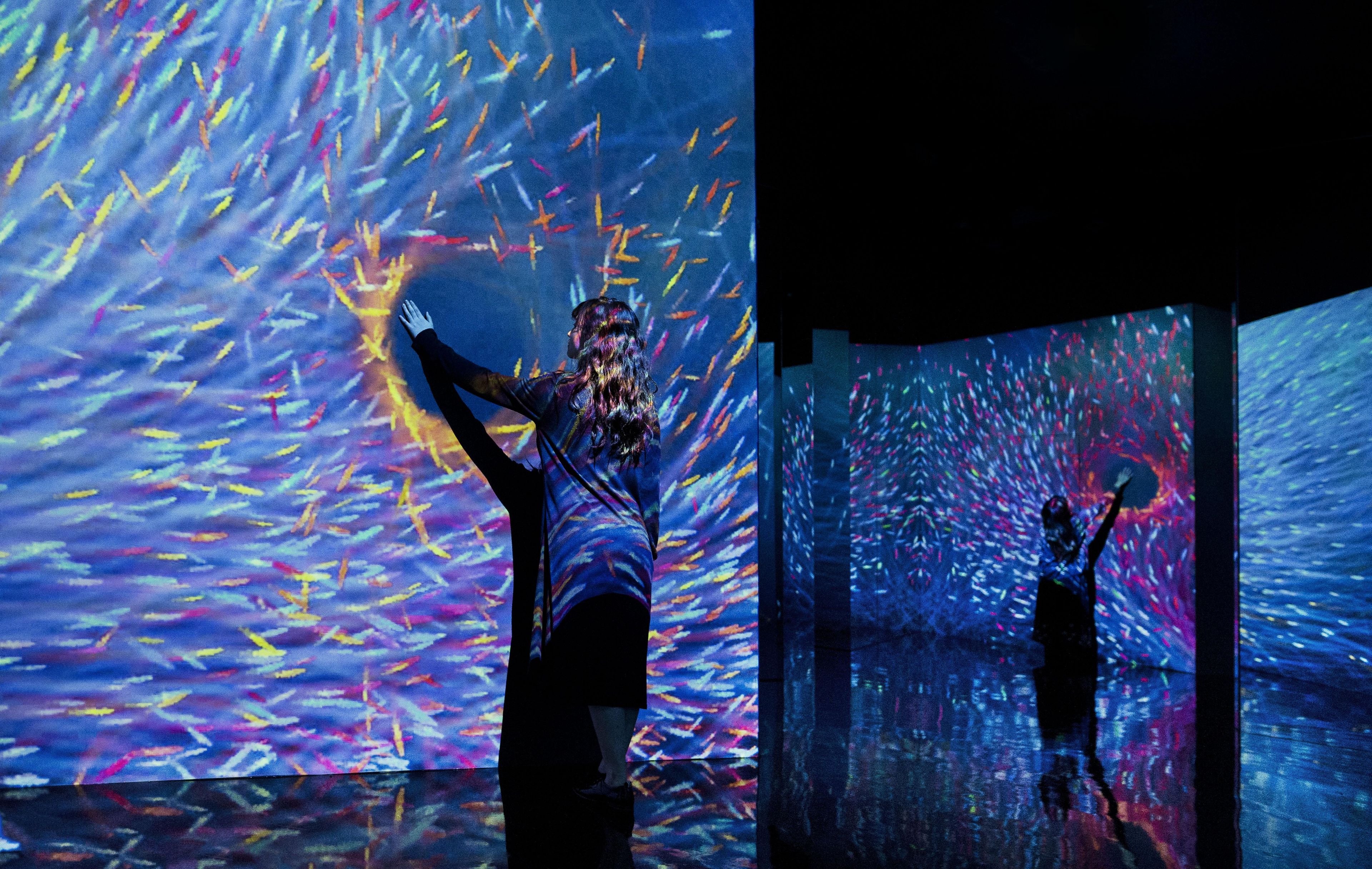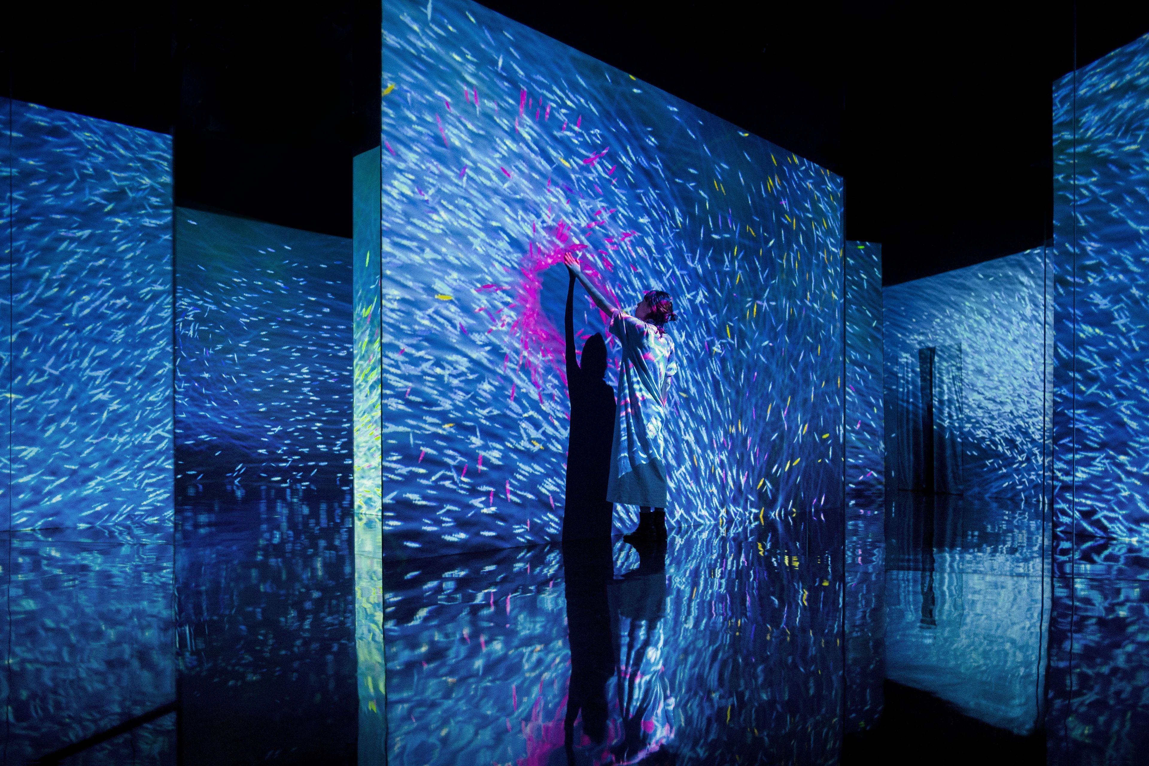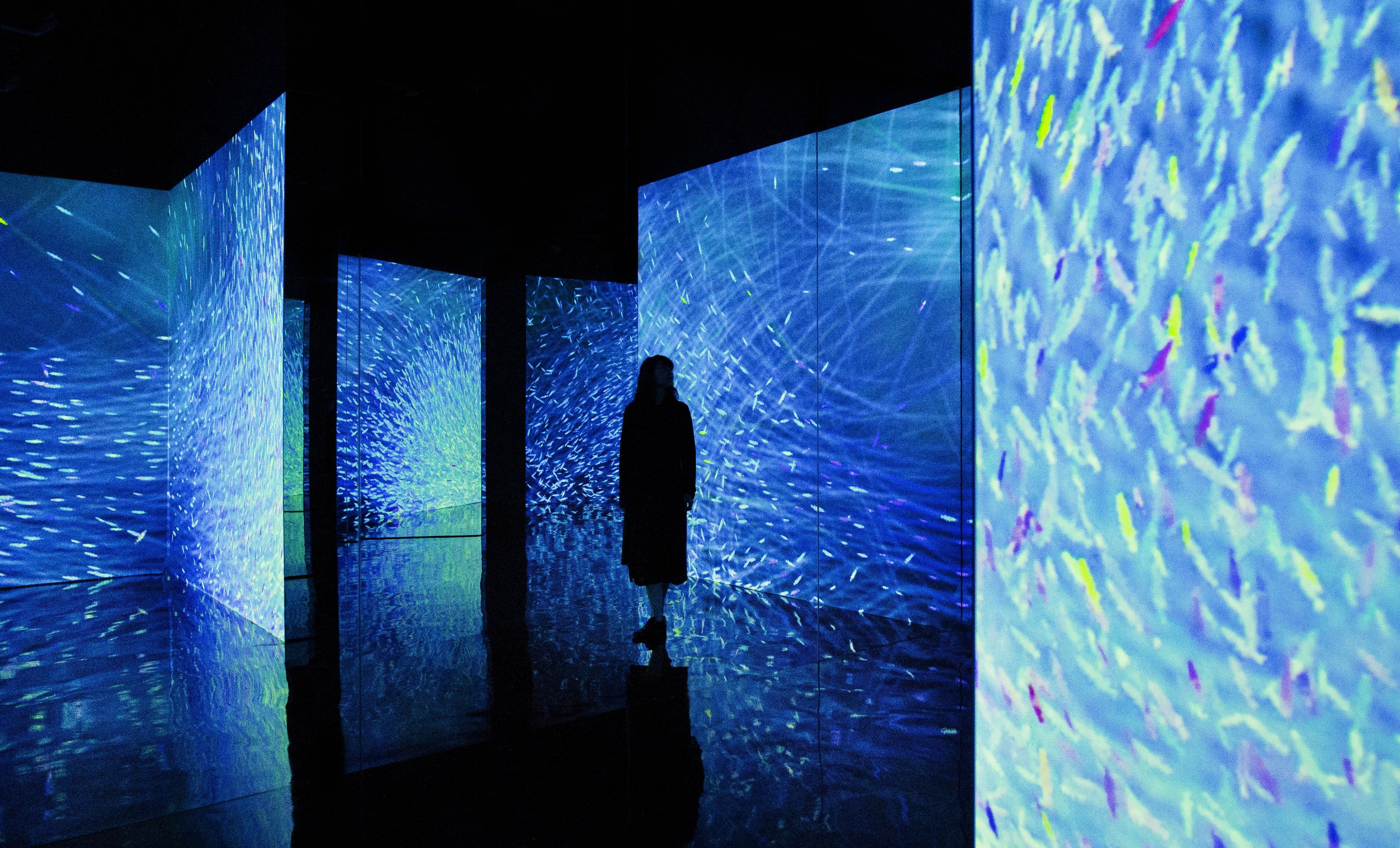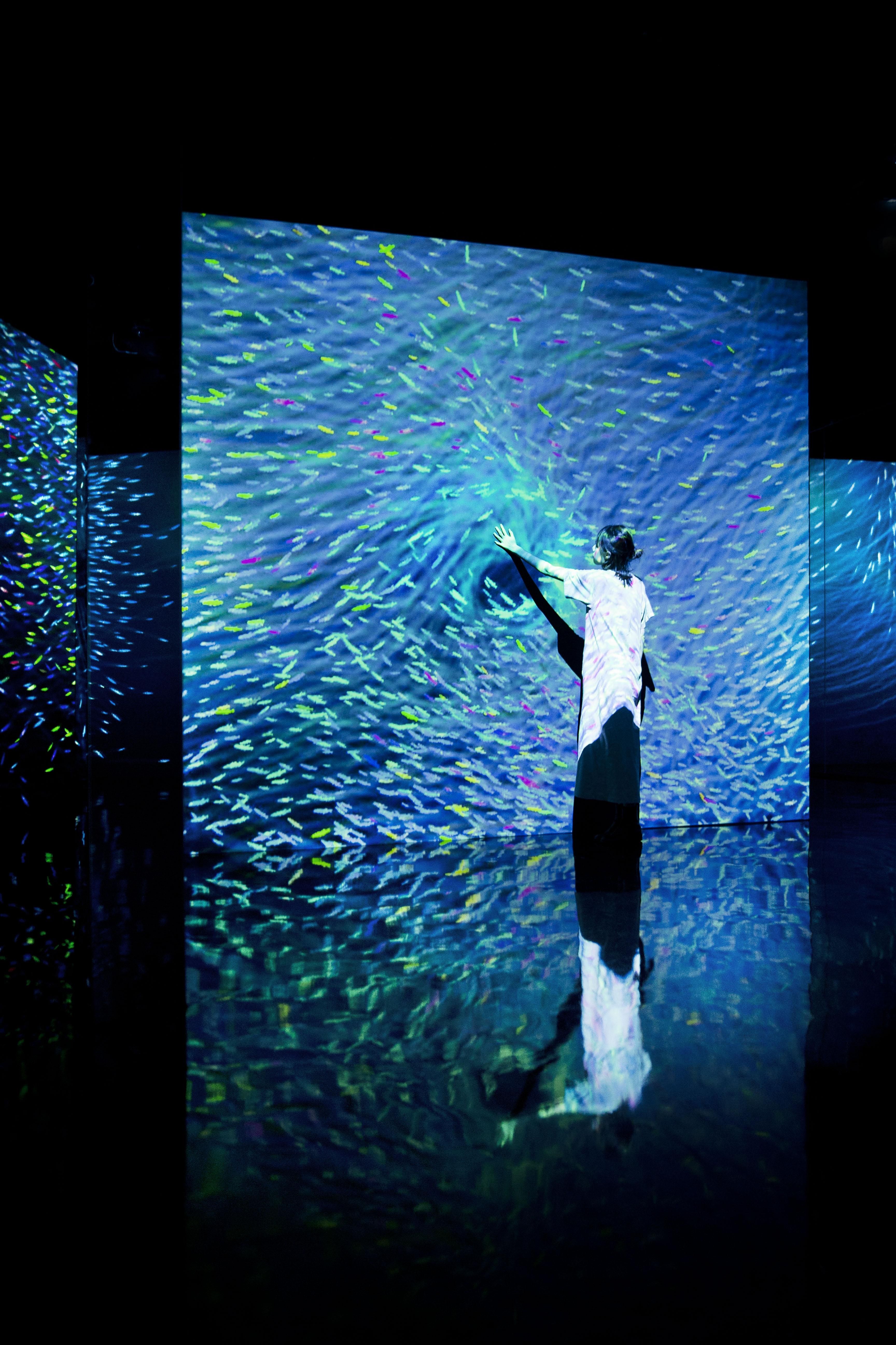 The artwork begins when the shoal of fish from The Way of the Sea enters the world below in teamLab Borderless. When the fish leave the world below, the artwork ends.