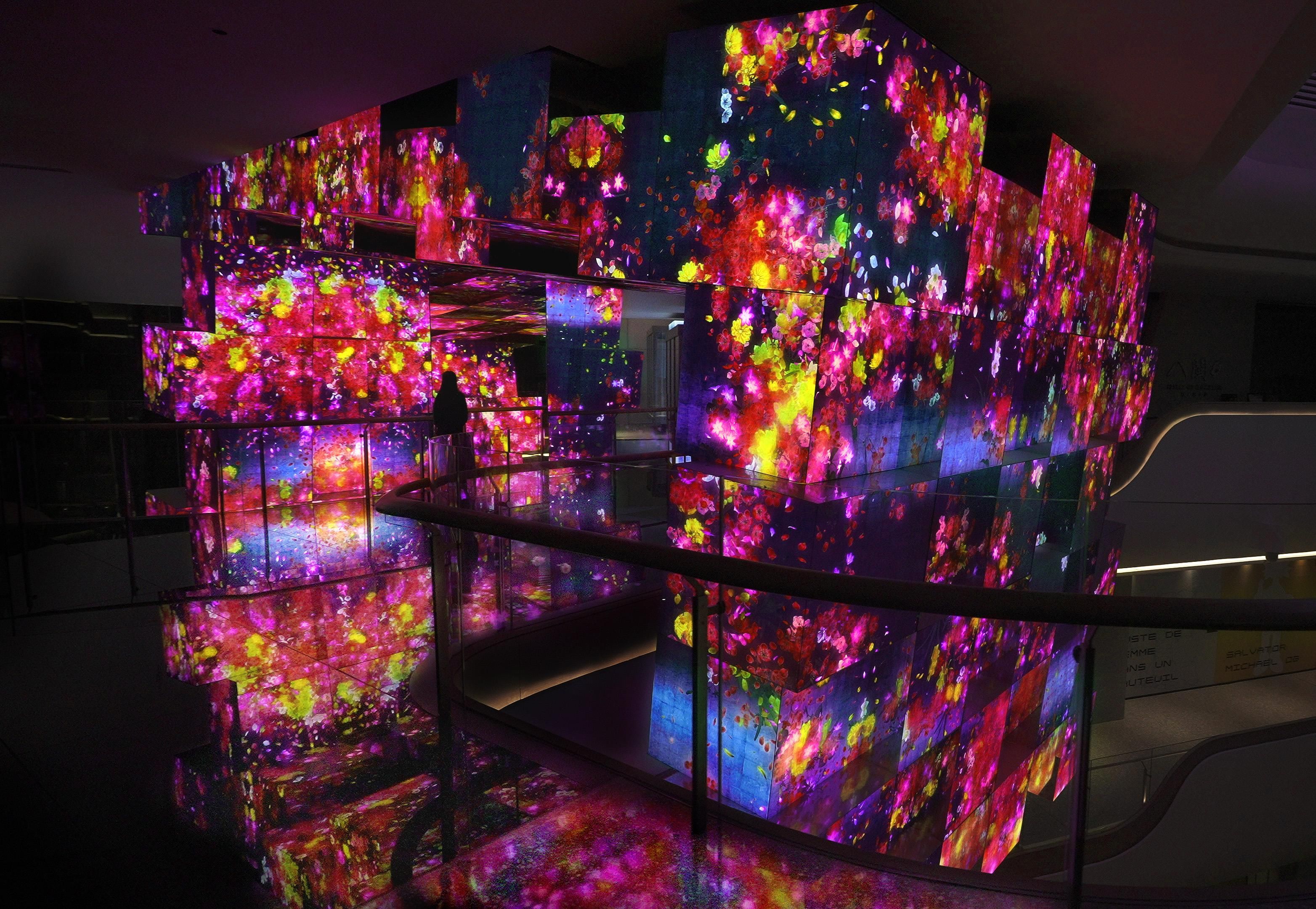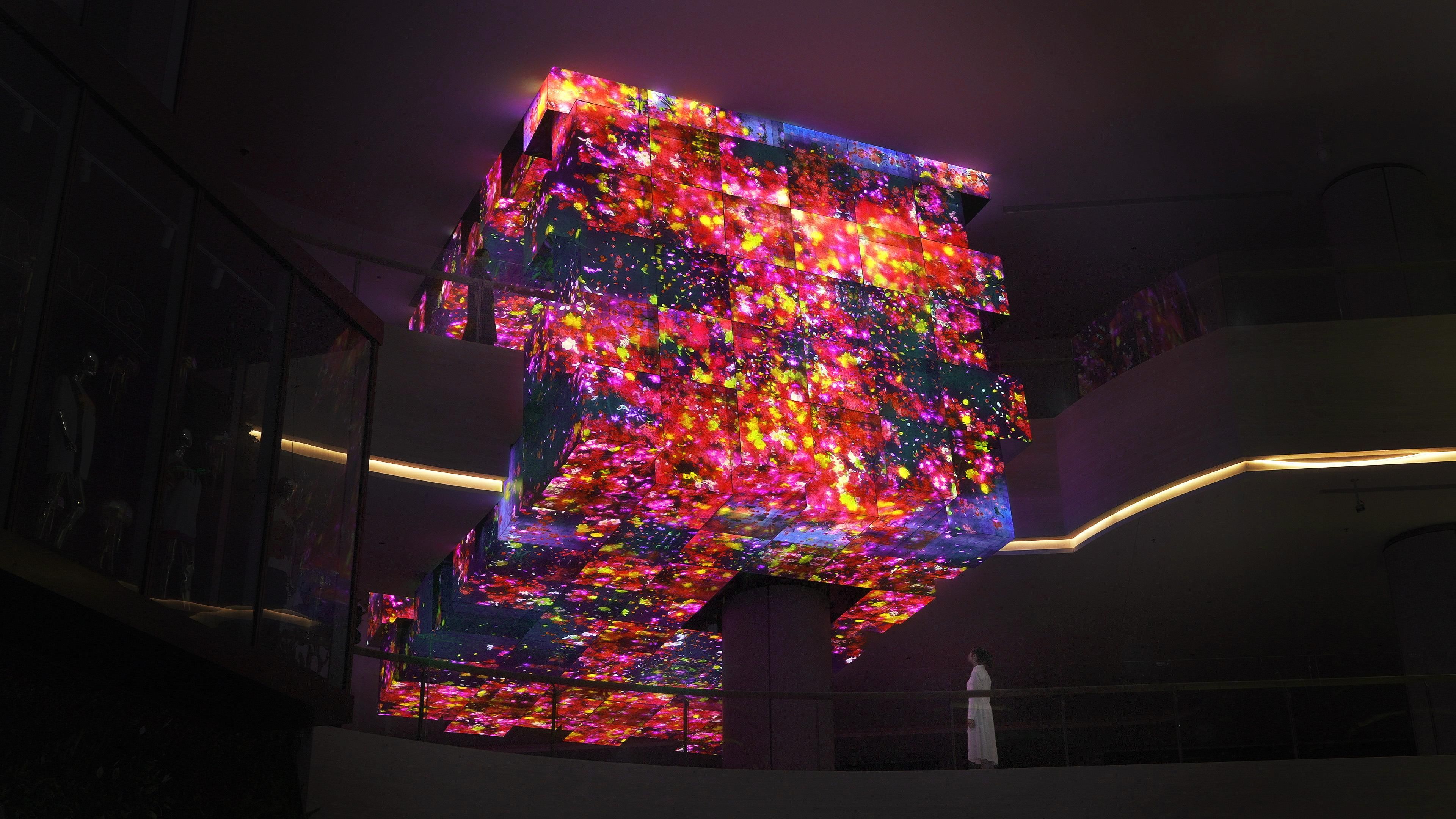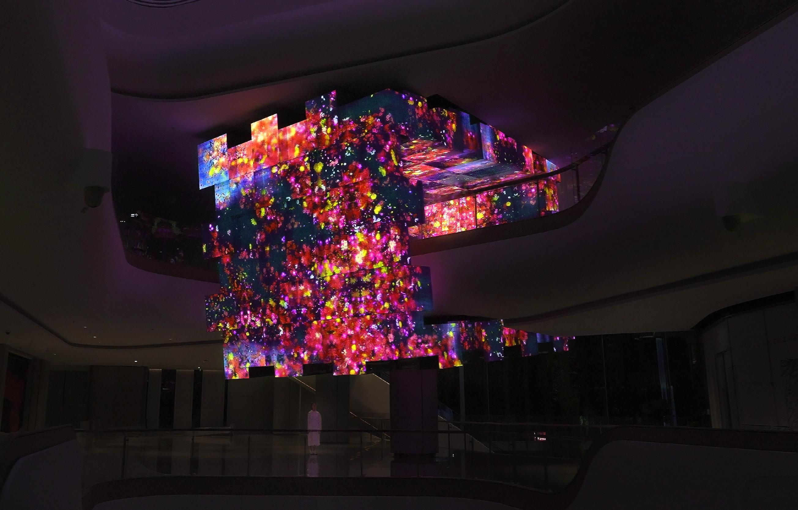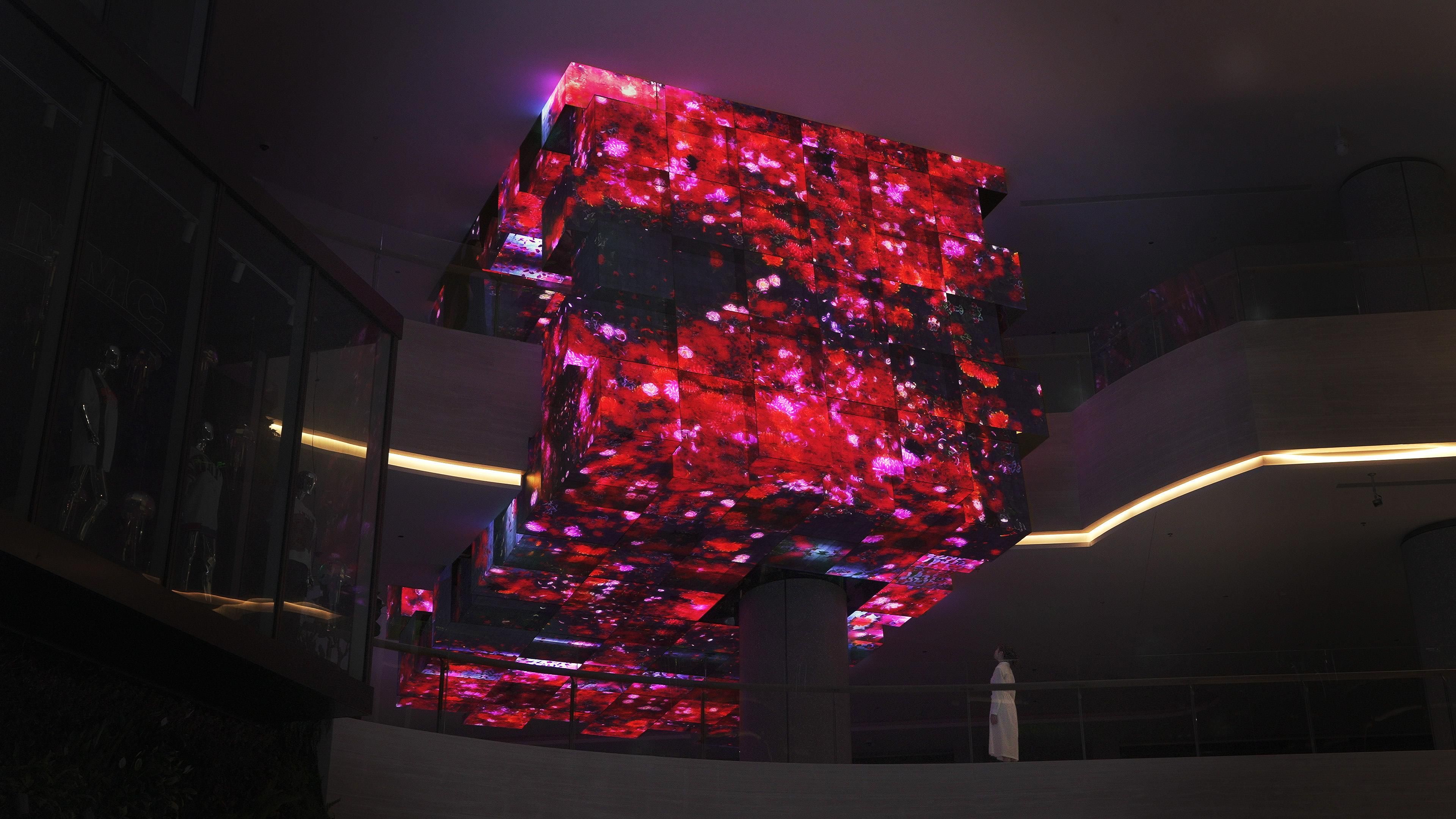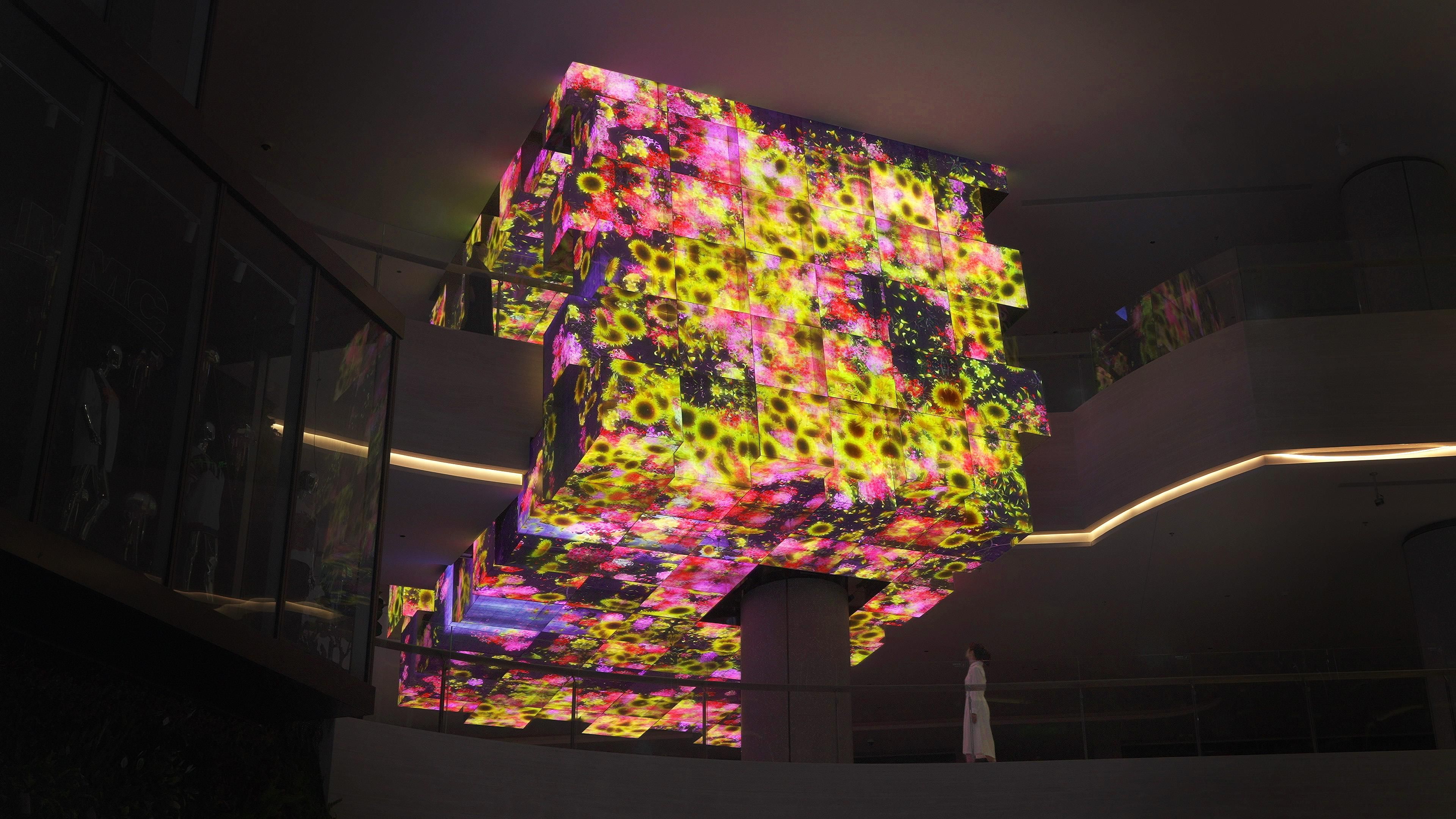 The flowers of a year bud, grow, and blossom before their petals begin to wither and eventually fade away. The cycle of growth and decay repeats itself in perpetuity. When people approach and move around, the flowers scatter and fade away. But when people stand still near the artwork, flowers grow and bloom more abundantly.If a person stays still, the flowers surrounding them grow and bloom more abundantly.