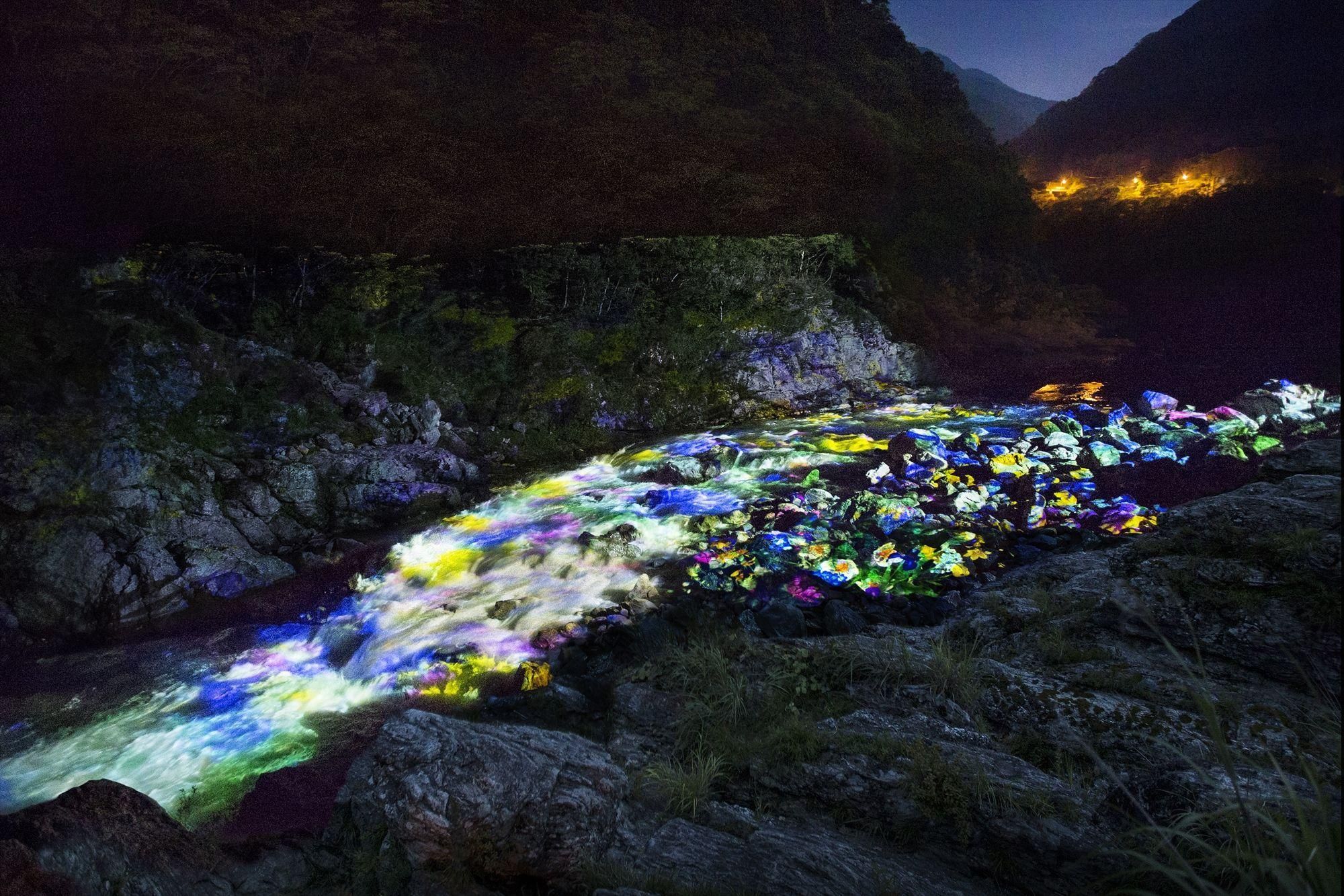 アートな小歩危 チームラボ公開 徳島・三好徳島県三好市の渓谷「小歩危(こぼけ)」を流れる吉野川で8〜10日の夜、川面や岩場をスクリーンにして、幻想的なデジタル映像を投影するアート作品が公開される。各日午後6時から30分おきに6回。(Excerpt from the text)