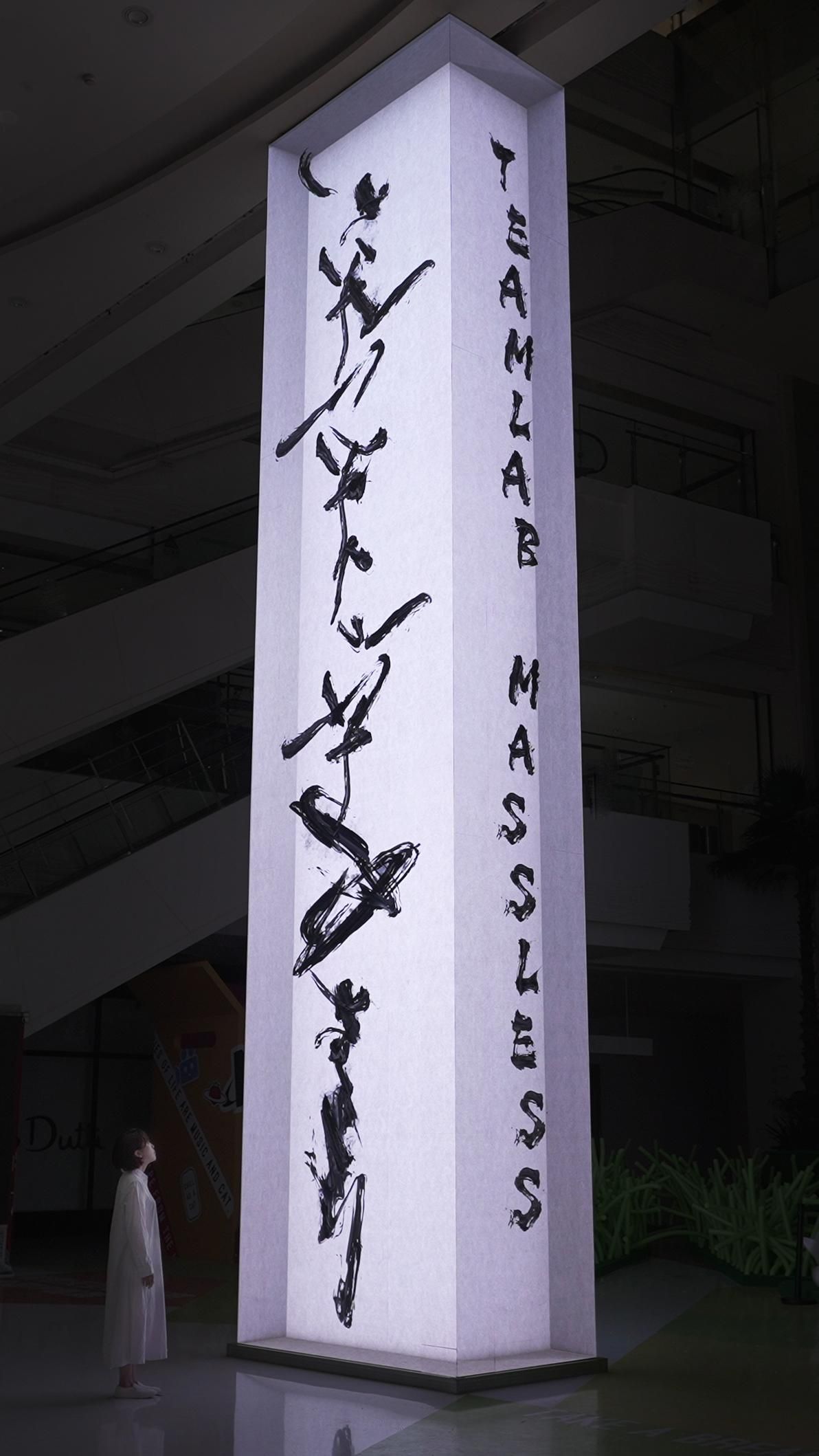 The space of the calligraphy is created with what teamLab refers to as Ultrasubjective Space. In contrast to spaces that are created through, or in other words framed by, lenses and perspective, Ultrasubjective Space does not fix the viewer’s viewpoint and in turn frees the body. The screens that the calligraphy is seen on do not become a boundary between the viewer and the artwork, and the artwork space of the calligraphy is continuous with the space of the viewer’s body.