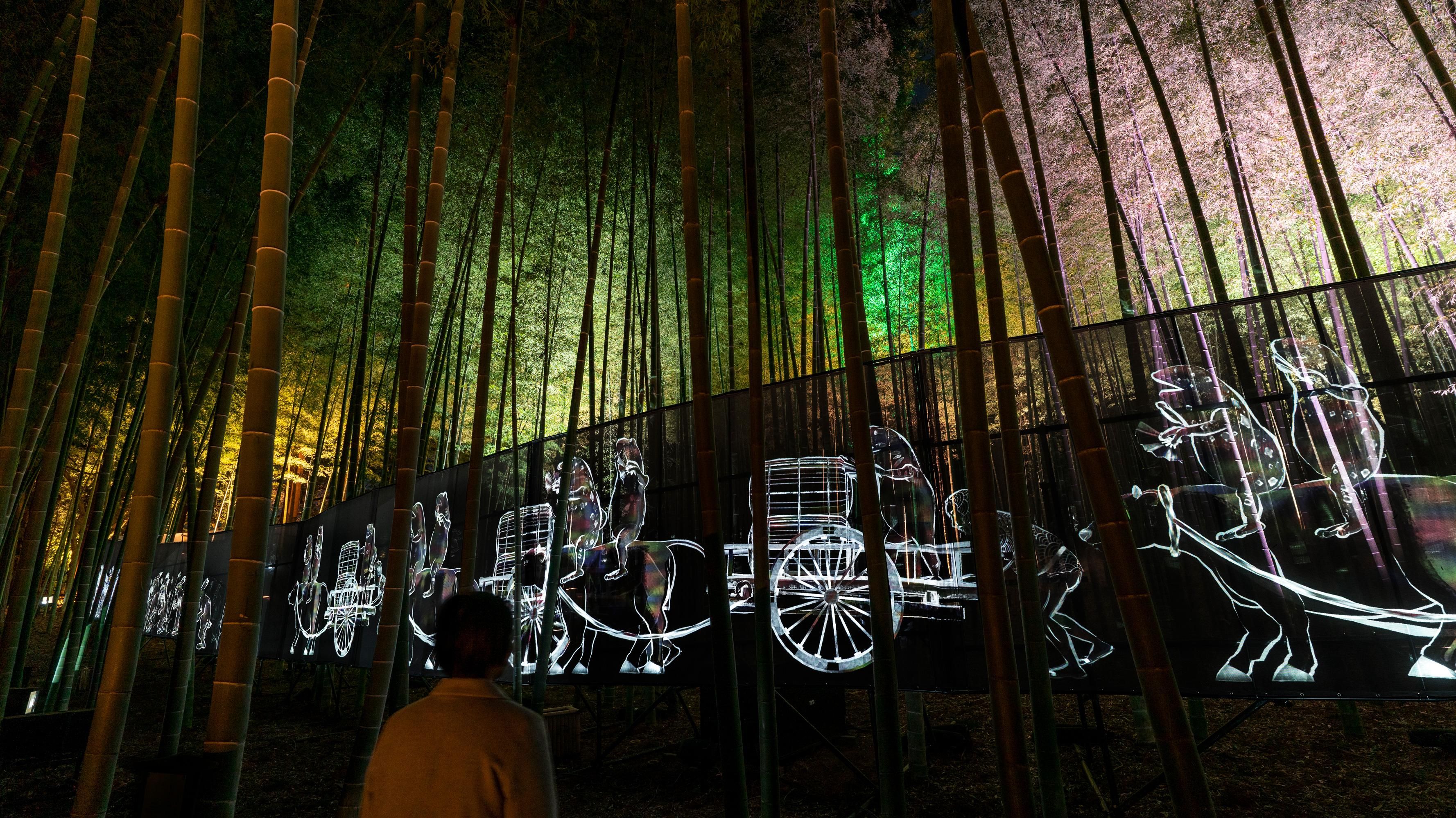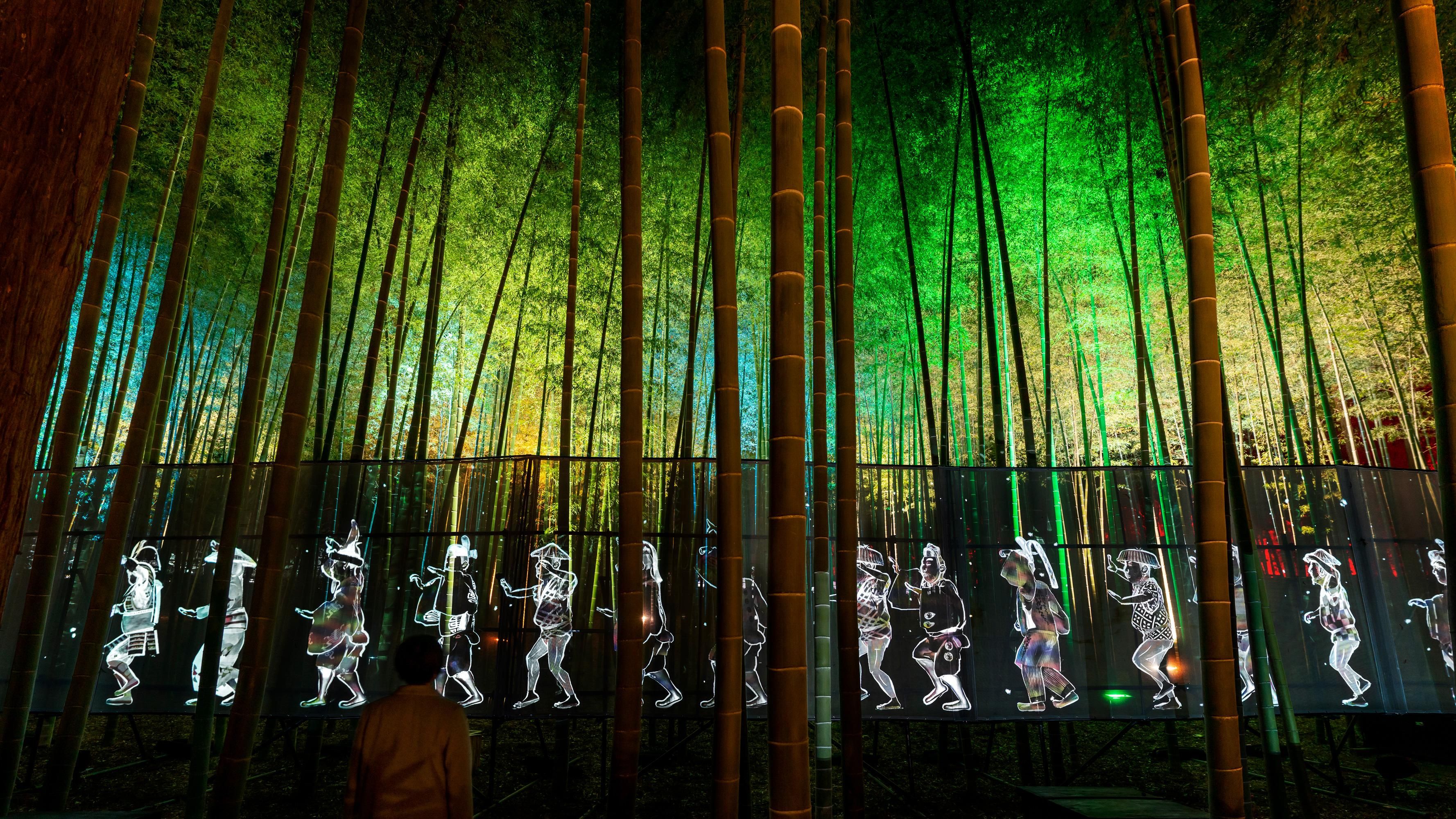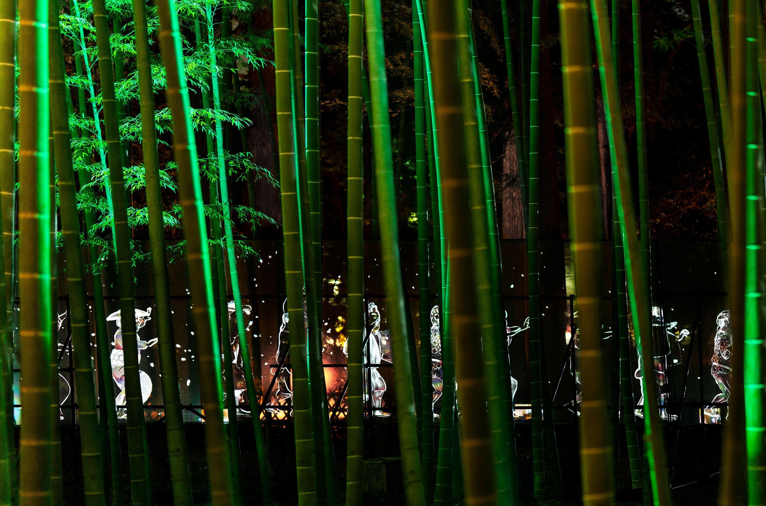 A group of anonymous and diverse figures walk along the Moso bamboo forest in Kairakuen Garden.