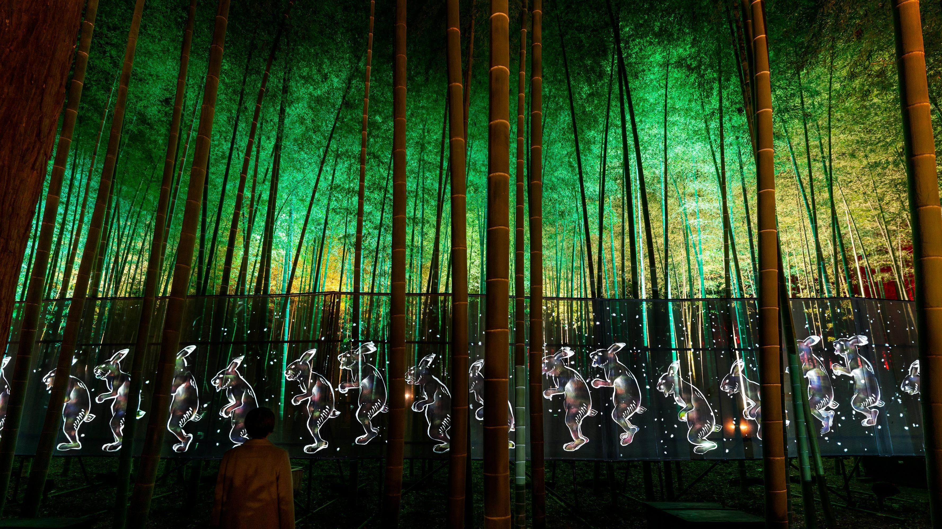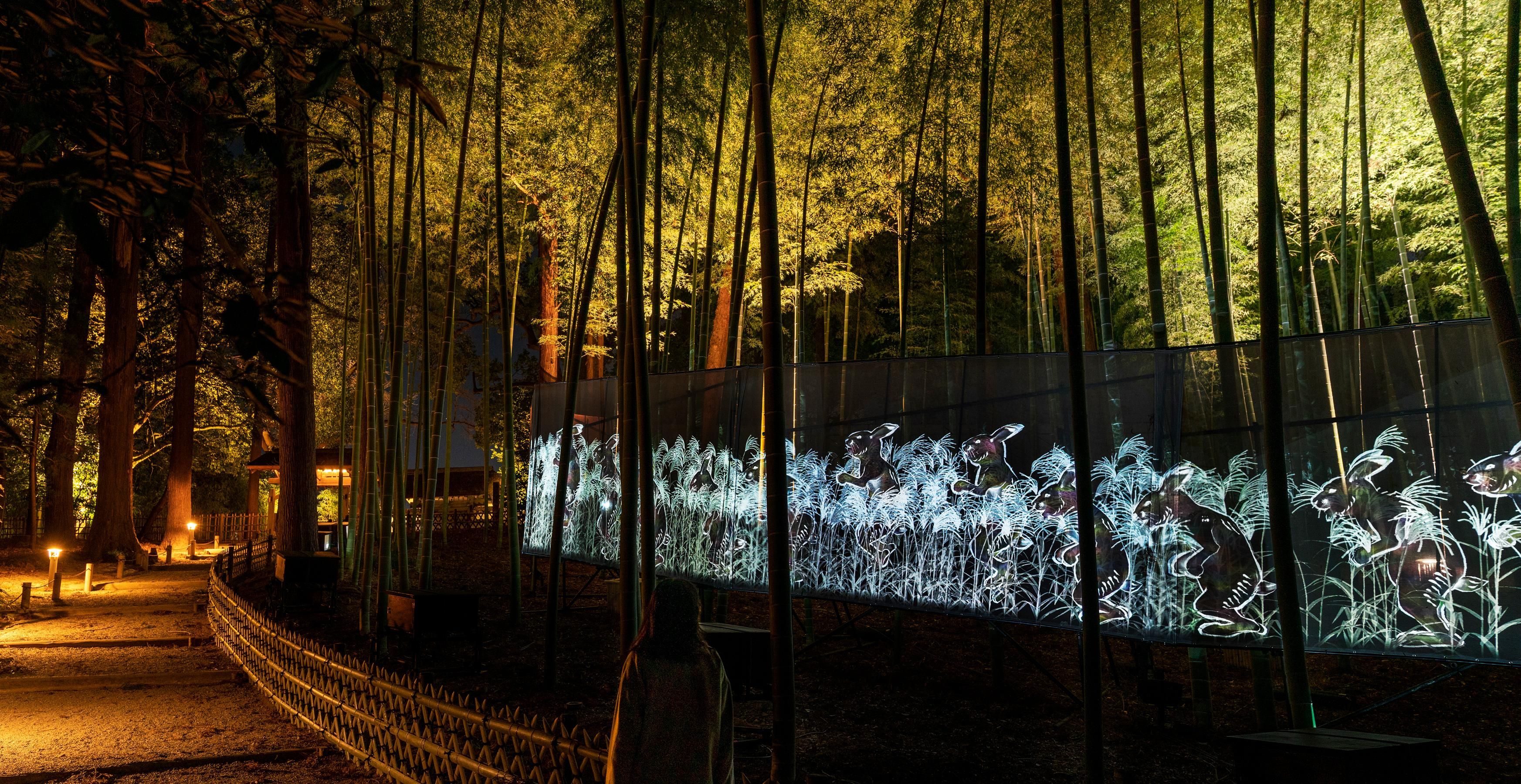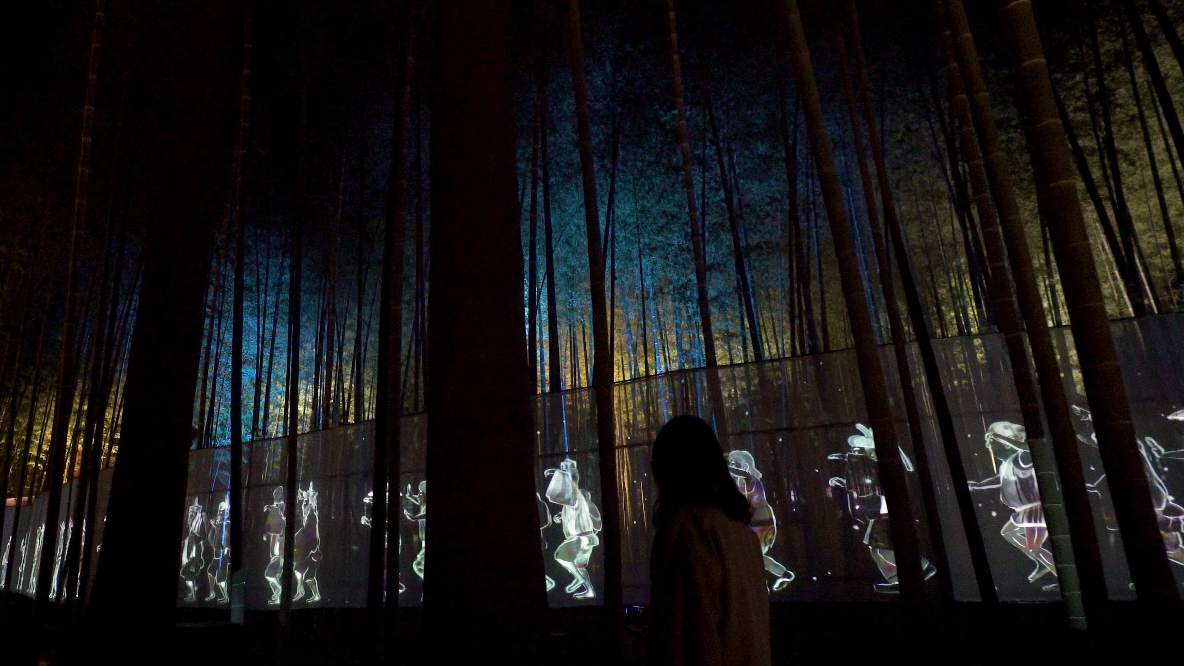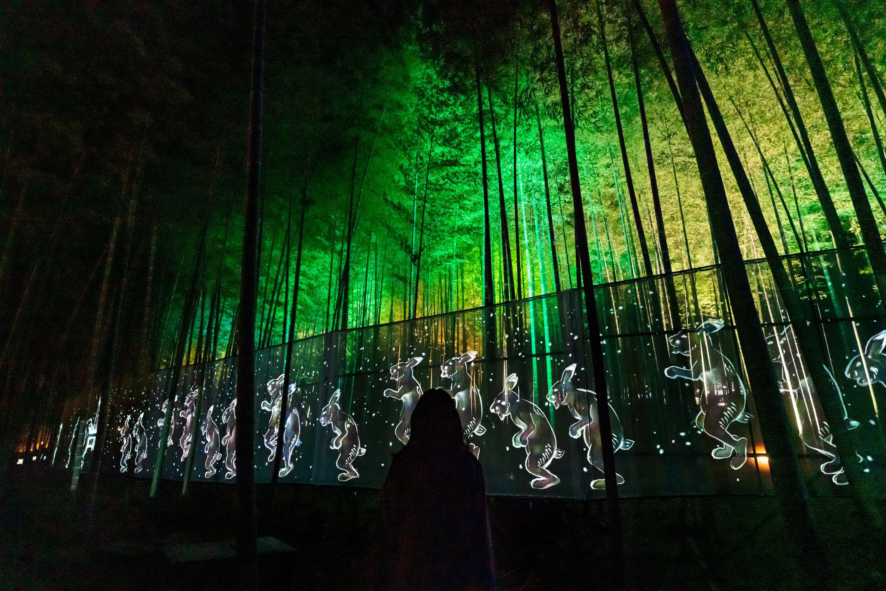 A group of anonymous and diverse figures walk along the Moso bamboo forest in Kairakuen Garden.