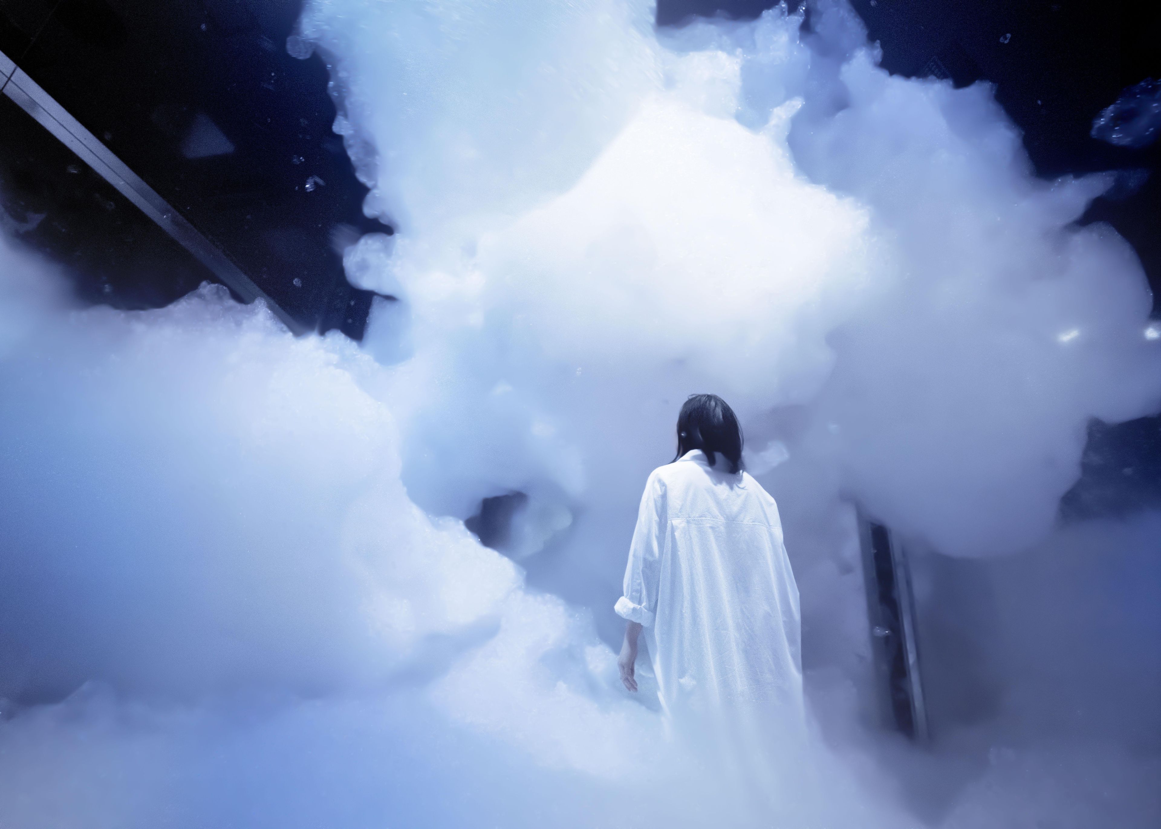 This floating, immense sculpture emerges from a sea of bubbles, transcending the very concept of mass. It neither sinks to the ground nor rises completely to the ceiling, but instead drifts in the middle of the space. The contours of its existence are ambiguous—it fragments into smaller pieces, but merges into a larger mass. Even when people fully immerse themselves in this sculpture, its existence remains intact. If broken by people, it naturally restores itself. However, when the sculpture is destroyed beyond what it can repair, it collapses, unable to recover. Even if people try to move or push this floating sculpture, they cannot do so, and if they stir up wind, the sculpture disperses entirely. Physical human actions cannot move the sculpture.