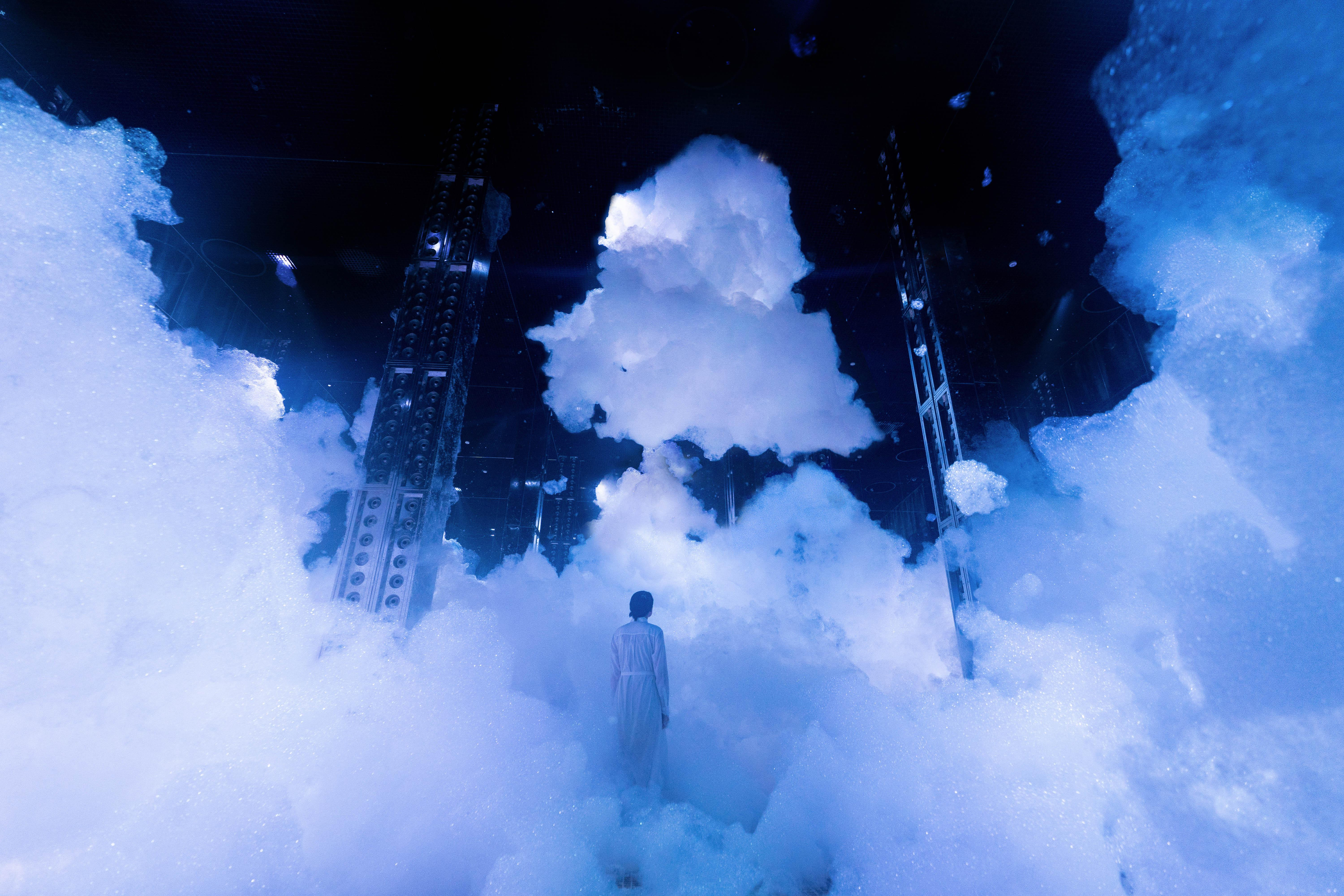 The only material substances present in this space are water, air, and ordinary soap.By filling the space with bubbles, a distinct environment is created in which an order of energy is born. By doing so, a massive form emerges from this sea of bubbles that floats steadily in mid-air.