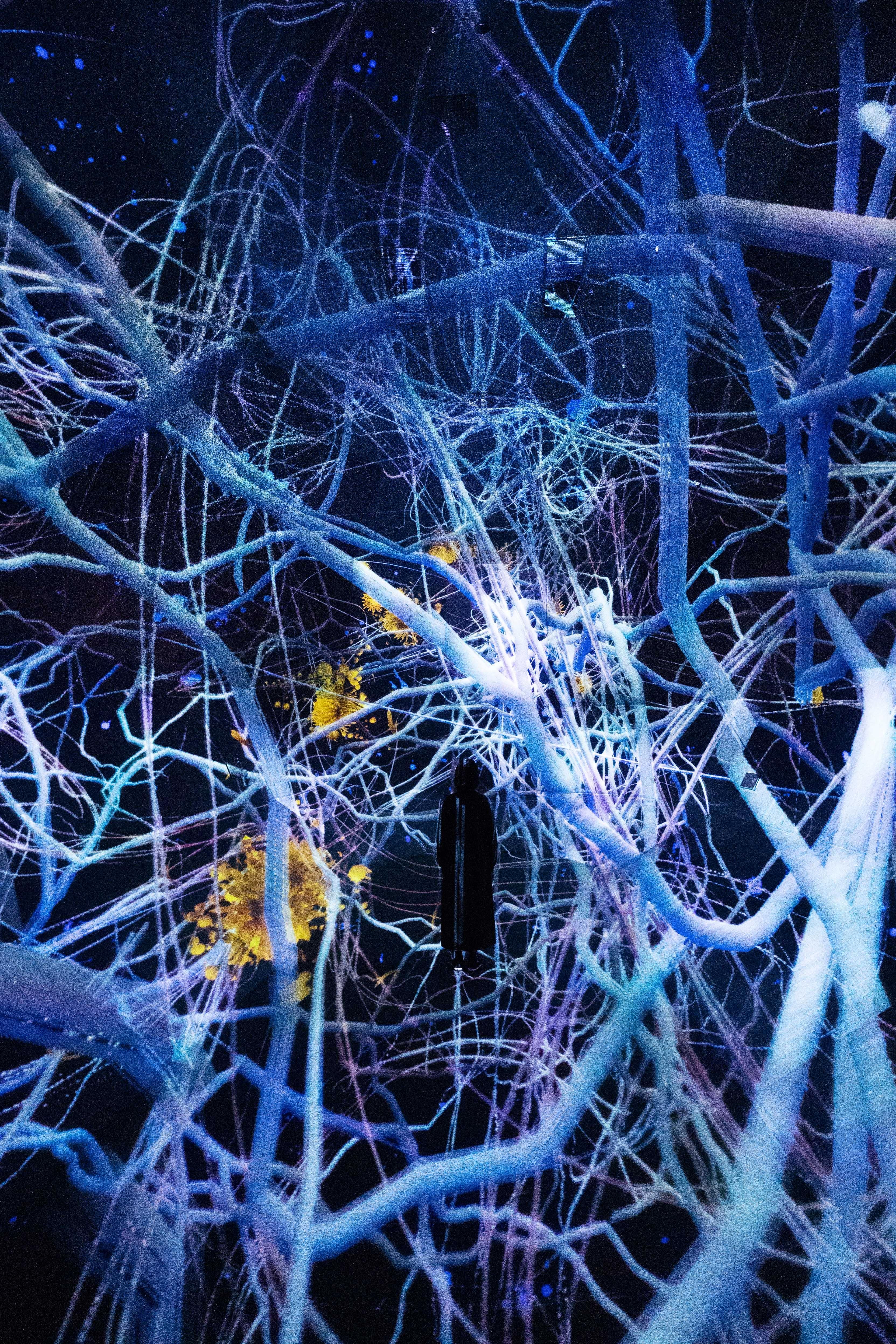 In modern biology, the definition of life cannot be strictly defined, but everything that is structured upon cells, capable of metabolism, and self-reproduction are labeled living things for convenience. In other words, all living things are composed of cells. All cells are enclosed by a cell membrane constructed of a lipid bilayer, with the hydrophilic part facing outward and the hydrophobic part covered within the layers. Both the inside and outside of the enveloping membrane are liquid. Soap bubbles are similarly enveloped by lipid bilayer membranes, and these membranes are structurally identical to cell membranes. However, contrary to cells, the bilayer of the bubble membrane floats in and encloses air, so the hydrophobic part faces outward, while the hydrophilic part is covered within the layers. In other words, if we consider cells to be pouch-shaped membranes in liquid, then bubbles are pouch-shaped membranes in air. This sculpture is created from substances composed in the same ways as cells, the structuring units of life-forms, and the order of energy created from this environment.