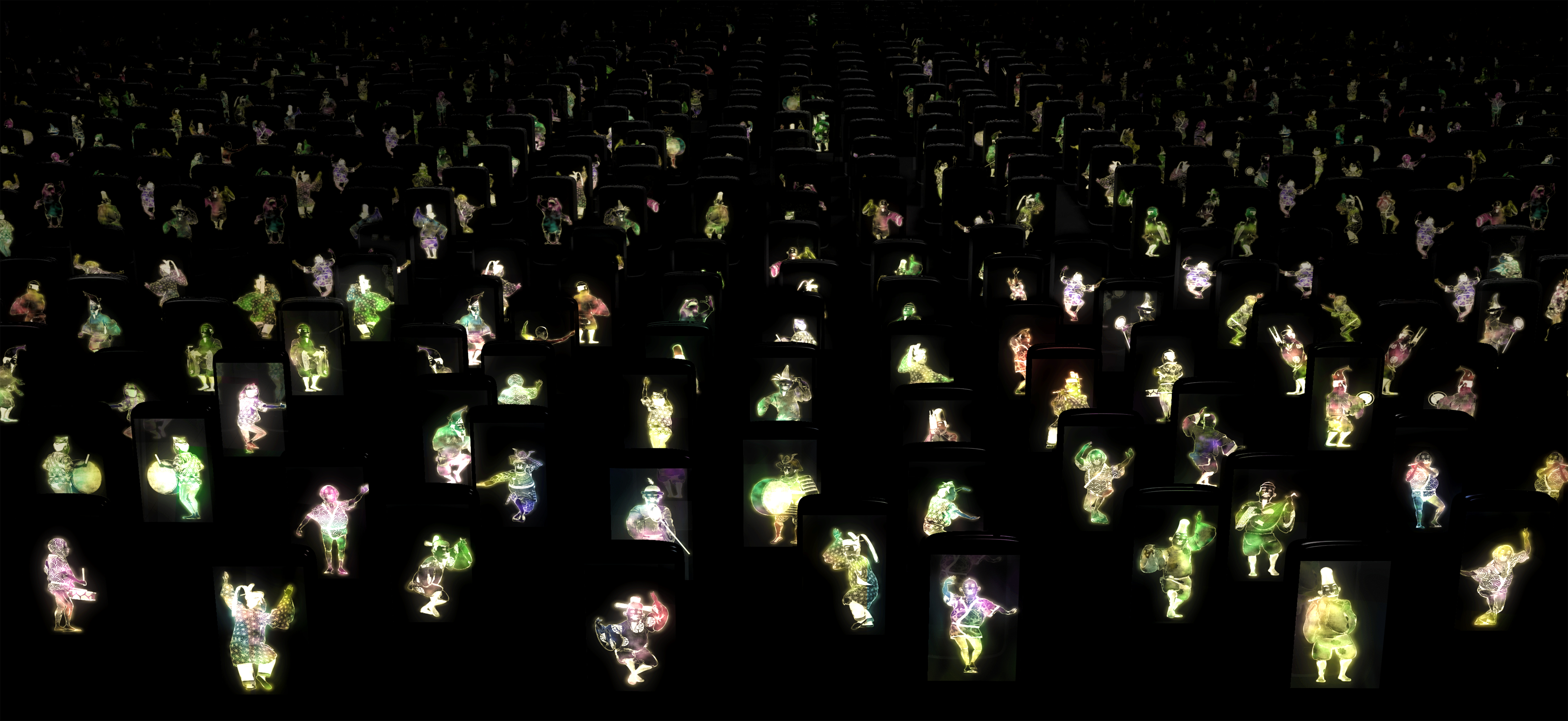 Held at the National Taiwan Museum of Fine Arts in Taichung, the second biggest city in Taiwan, ‘We are the Future’ is a general exhibit that lets artwork by the teamLab ‘Ultra Technology Strike Group’ and commercial works live together.There were more than twenty works on display at the exhibit including ‘Flower and Corpse Glitch,' an animation scroll which consisted of twelve films. Included are ‘One Hundred Years Sea – Running time: 100 years’ whose scale seems to span one hundred years; ‘teamLab Hanger,’ an interactive experience displaying different images when a hanger is picked up off of a clothing rack; and ‘Sword Dance and Shadowgraph,' a projection mapping video that was made to complement Taichi Saotome’s performance.‘Peace can be Realized Even without Order Diorama Ver.,' the latest work specifically made for this exhibit, stood out conspicuously inside of the dim exhibit area, even alongside many other video works. Hundreds of smartphones were displayed in a dark, each with a tiny figure singing or playing an instrument, as if part of a Japanese festival, all while communicating with each other. These small people do not establish communication across the whole group, instead interacting with those nearby, resulting in a massive group interaction.‘Peace can be Realized Even without Order Diorama Ver.', teamLab, 2012. Interactive Animation Installation, Smartphones, Sound: Hideaki Takahashi, Voice: Yutaka Fukuoka, With the Cooperation of HTCteamLab’s work used to be one large print from a video, but it is an aggregate of small displays this time.For example, the scenery is large in ‘Flower and Corpse Glitch,’ which displayed at the Louvre, but pictured within are the stories of many small characters. I have realized that it is more effective to have many small displays with one character on each than it is to have one big display and put many characters on it in order to develop a story. The space becomes more abstract by placing innumerable characters in the dark, and the each smartphone pops out as if they were a sculpture of a picture. The idea of being able to create an imaginary world with only characters is like feeling you might have had as a kid trying to create your own world by setting up ‘Kinnikuman Erasers’ in your room.'Flower and Corpse Glitch Set of 12'. teamLab, 2012, Animation, 1min 50sec (9:16 × 12)The characters in this piece react to the audience and perform on their instruments especially well in response to each other’s actions.There are some messages in this work, but a theme of ‘beauty of unbalanced things that are not restrained’ is one of them. The old Japanese knew the beauty of incomplete things, such as the stone garden of Ryoan-ji and the shape of the stone at Zen-ji. They pick up a lump of the distorted energy in nature. The same idea applies to bonsai since they become a microcosm filled with life in a small container. Asian design seems to unleash energy while European design is made up of many restraints.Taichi Saotome and teamLab, Special New Year Performance of Dragon and Peony, Sword Dance and Shadowgraph. teamLab, 2011, Animation, 2min 32sec, Produce: UBON, Cooperation: S.J.K.What kind of design are you particularly talking about?For example, if it’s a Western garden, it would be made symmetrically, or restrained in a way like cutting trees. The Japanese garden lets people pick up and place things anywhere, including any little cluster of natural energy that people might feel. Of course, it still continues these days. Western fashion magazines have such simple layouts while Japanese fashion magazines like ‘Koakuma AGEHA.’ are essentially doing the opposite, using confusing layouts which overflow with Asian-like energy. Western countries developed a culture that believes ‘being balanced is comfortable’ and Japan developed the idea of ‘the beauty in unbalanced things.’Is this same energy shown in the arrangement of the smartphones in the dark?Each individual, overflowing with energy, was placed without restrictions and this might be able to create one view of the world. These small people on the smartphones created a life and became free. It's like the liberated people at festivals exist in innumerable smartphones. They will communicate with each other and could be in a festival-like mood if they do well.Can you tell me the process how you created this work in detail?This exhibit is a retrospective show, but I wanted to include a new work as well. So I looked into HTC, a Taiwanese mobile maker. I contacted them about four weeks prior to the exhibit, and two days later I was told that they were able to get hold of the necessary amount of smartphones that I would need. Since this was a very sudden project, an engineer from HTC flew all the way to Haneda from Taipei to bring six terminals. An engineer from teamLab also went to Haneda and discussed technical issues with him there on the spot.It sounds like a pretty dynamic creation process.They also love both technology and art, so they were cool with helping us. The music was done by Hideaki Takahashi who teamLab has worked with often. The base of the music is the footsteps of the small people, since each smartphone plays music and that creates the harmony. Each smartphones starts stepping along with the footsteps of others nearby and this is the base of the music. The small people have flutes, small and large drums, and biwas. They also sing, and the voices were done by Yutaka Fukuoka, who sings the opening theme song for the TV program ‘News Station.’ Takahashi completely understood our concept for this work, and we even laughed when we heard his rough draft music the first time since it was already perfect. Minoru Terao, visual director at teamLab, directed the animation. The animation team, which includes Atsushi Ito, made the dance moves with CG based on Awa folk dances. Tetsuro Kato from the computer vision team set up the mo
