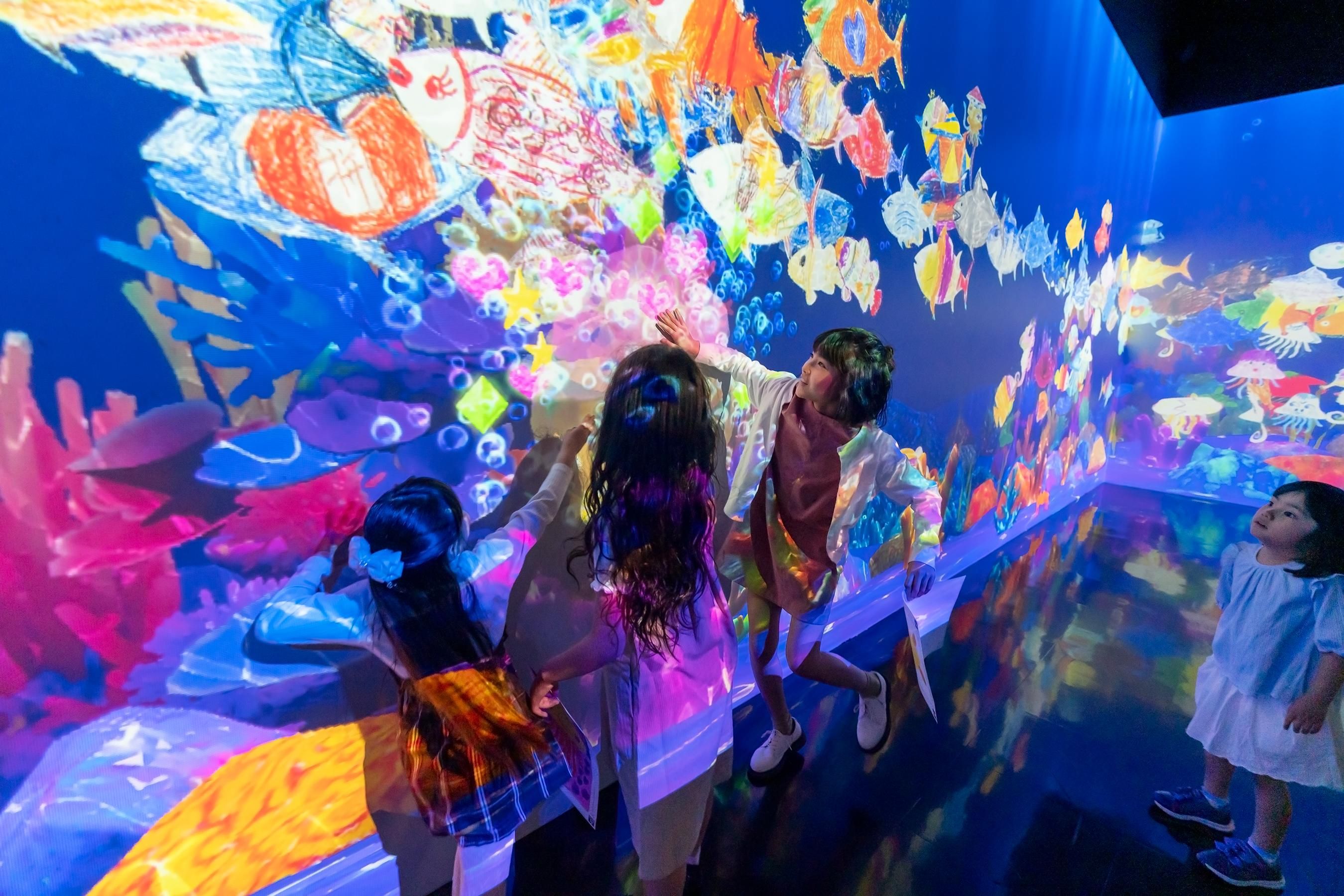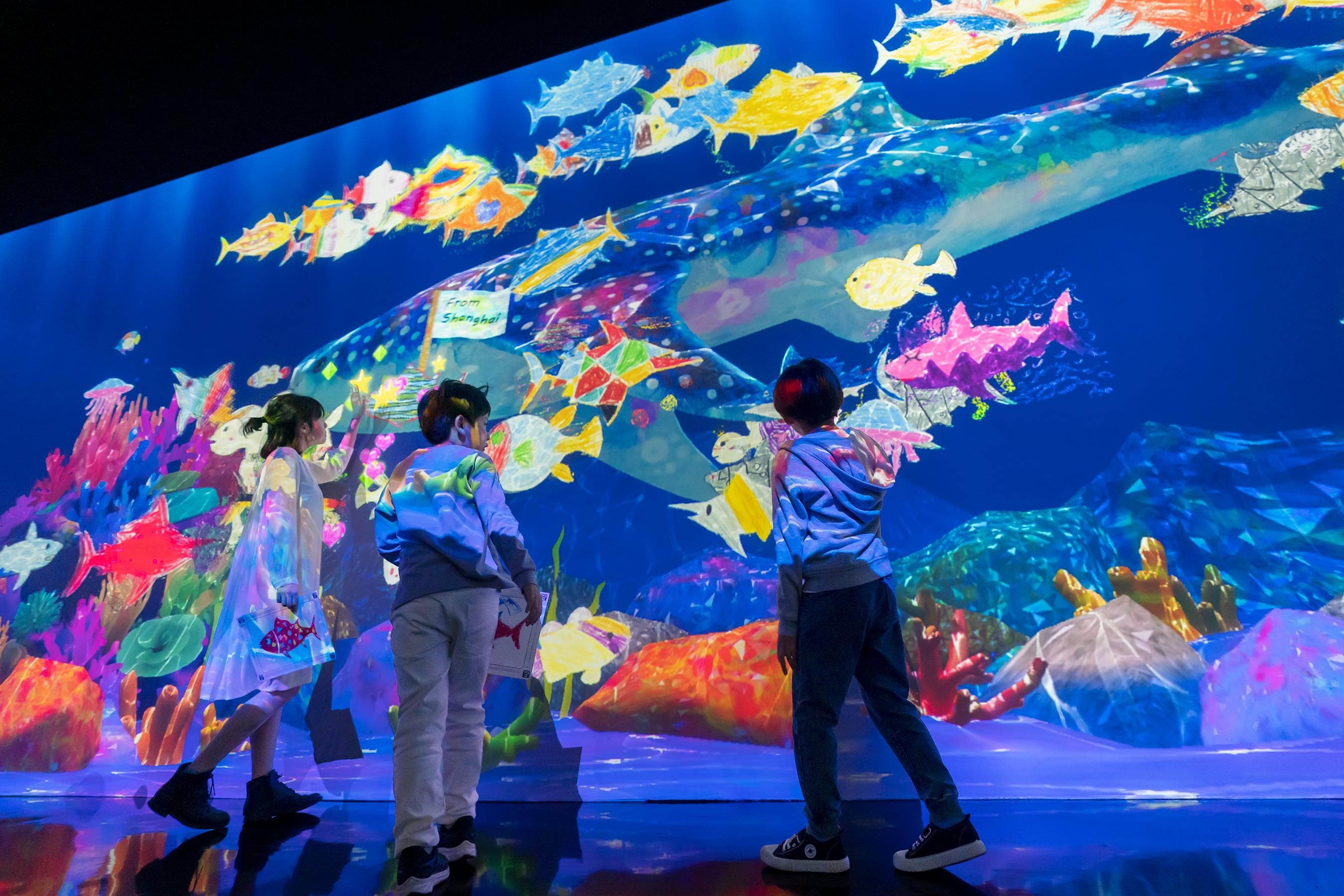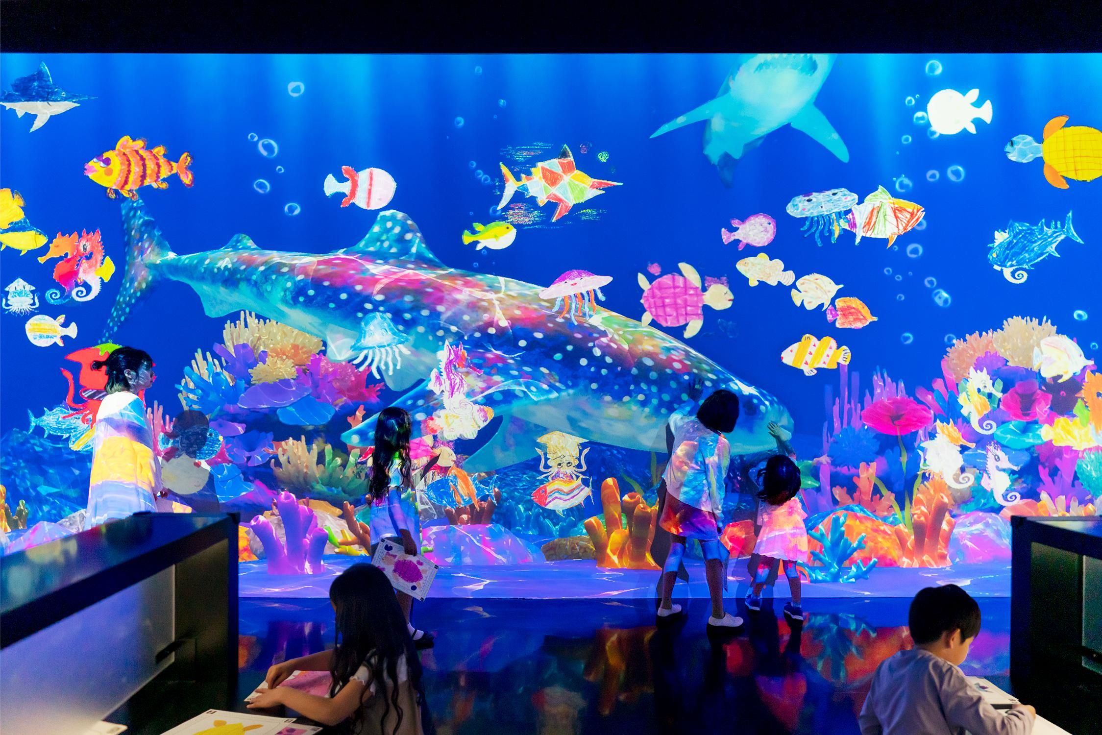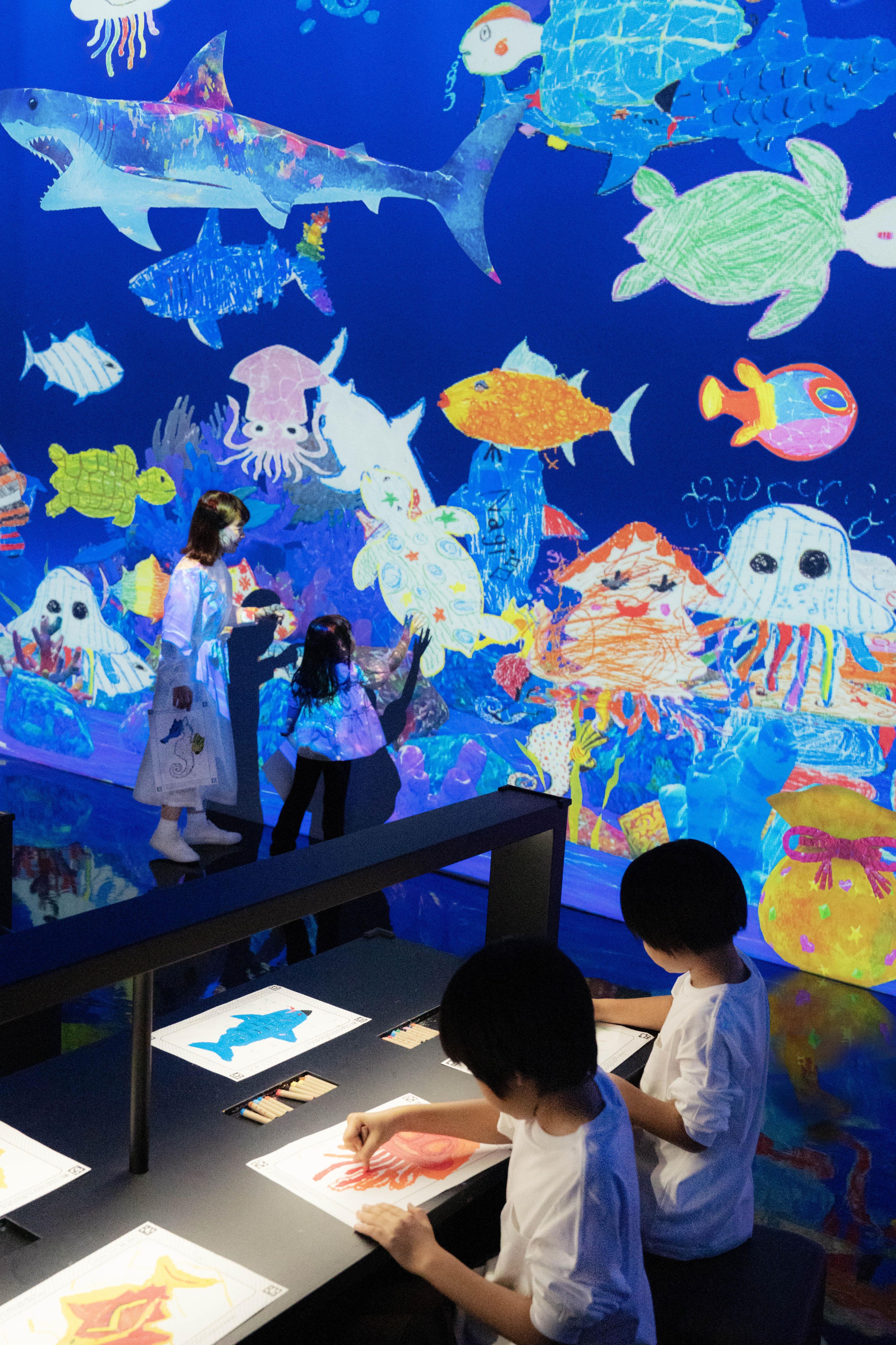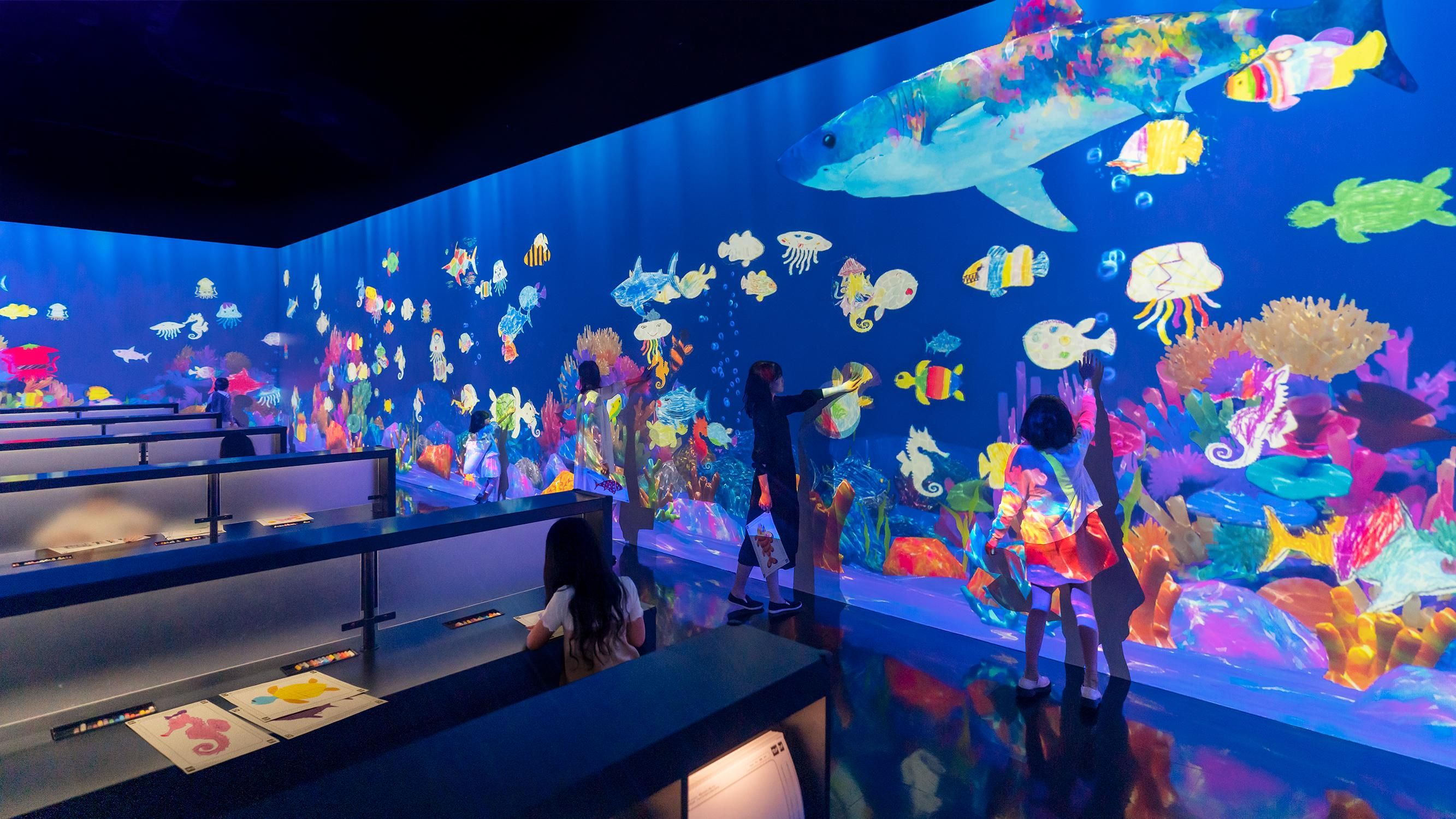 Color in a fish on the paper provided, and see the picture you have drawn come to life, swimming out into the massive aquarium in front of you together with the fish drawn by other people. If you touch the swimming fish, they will swim away. You can also feed the fish by touching the food bags.