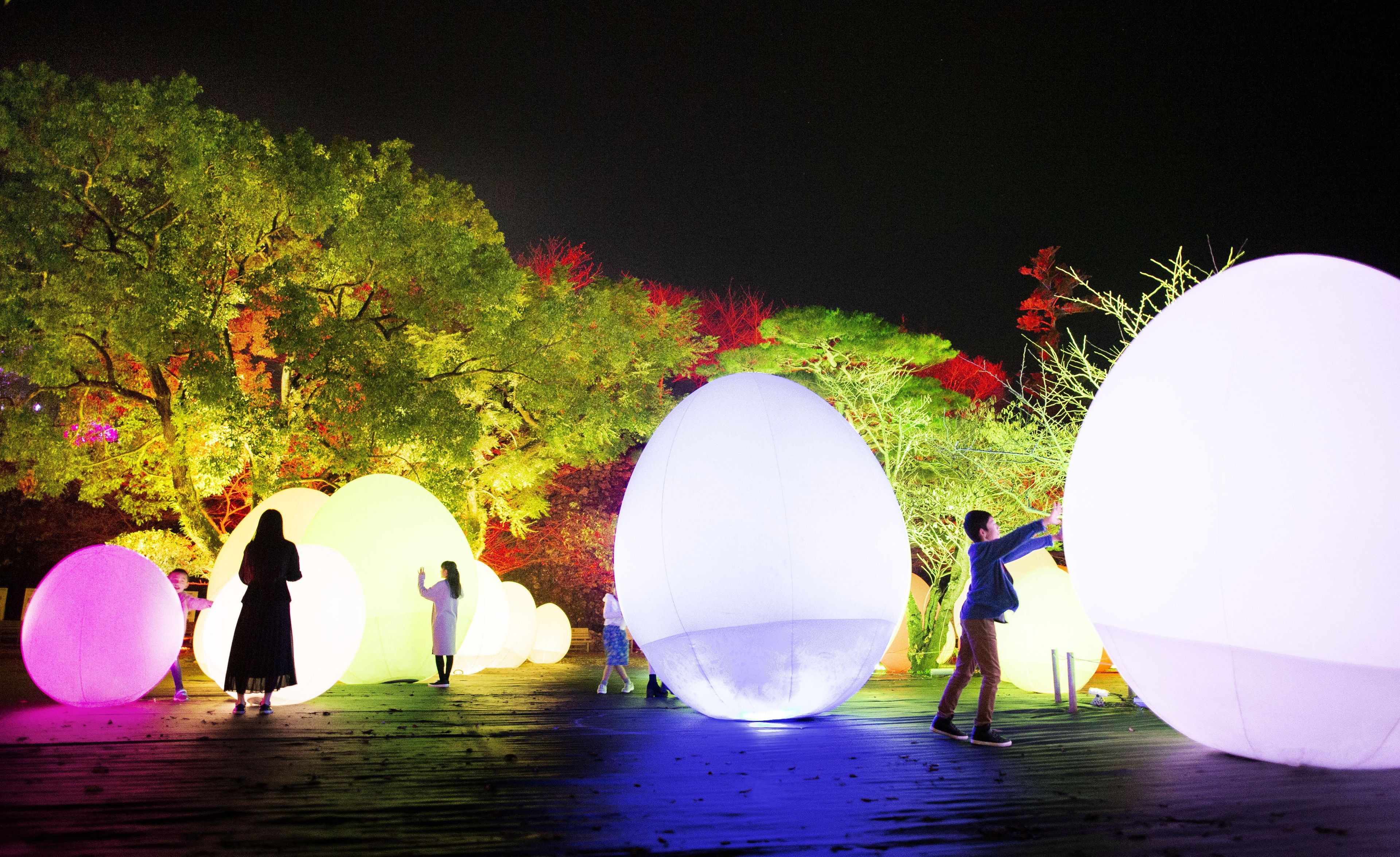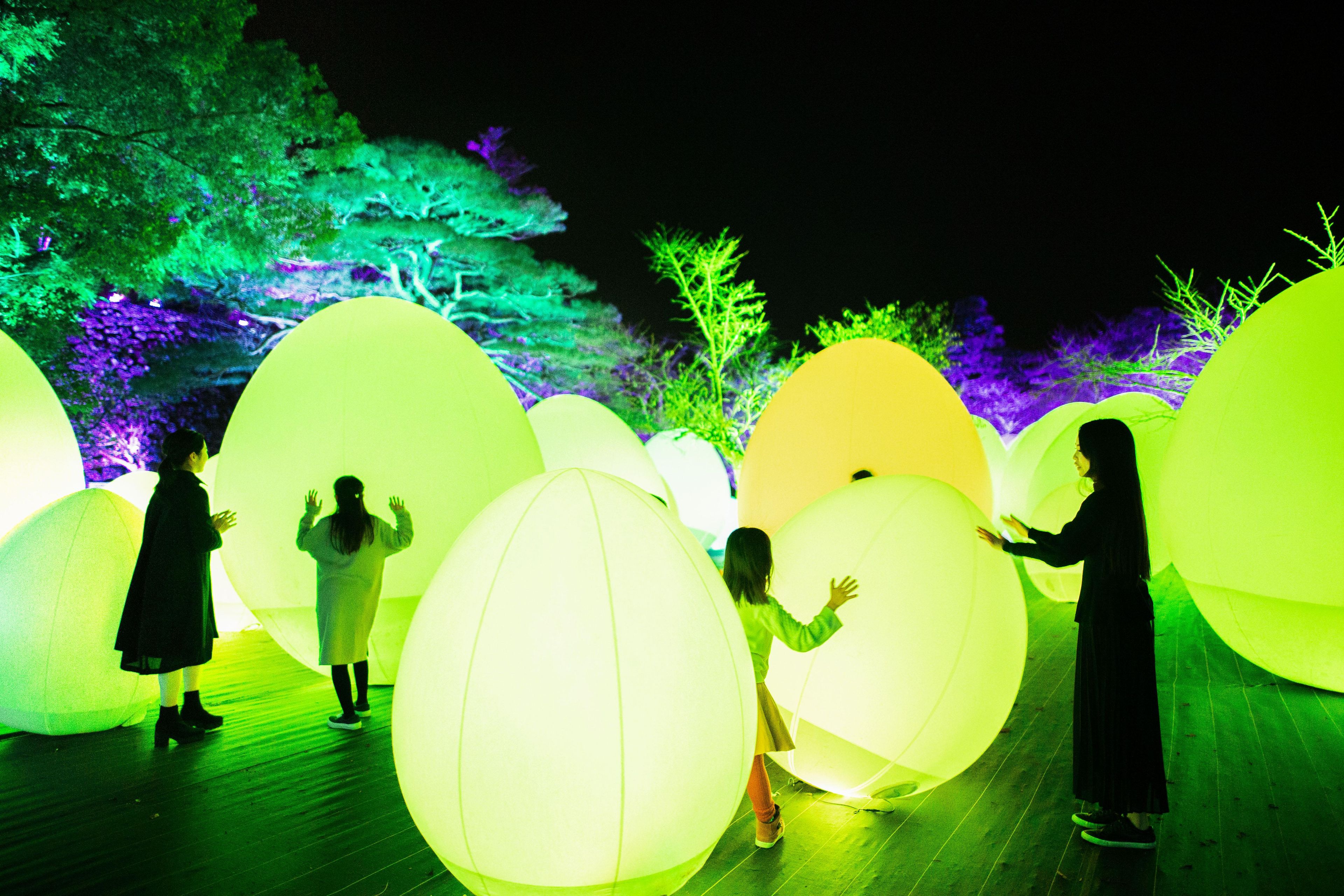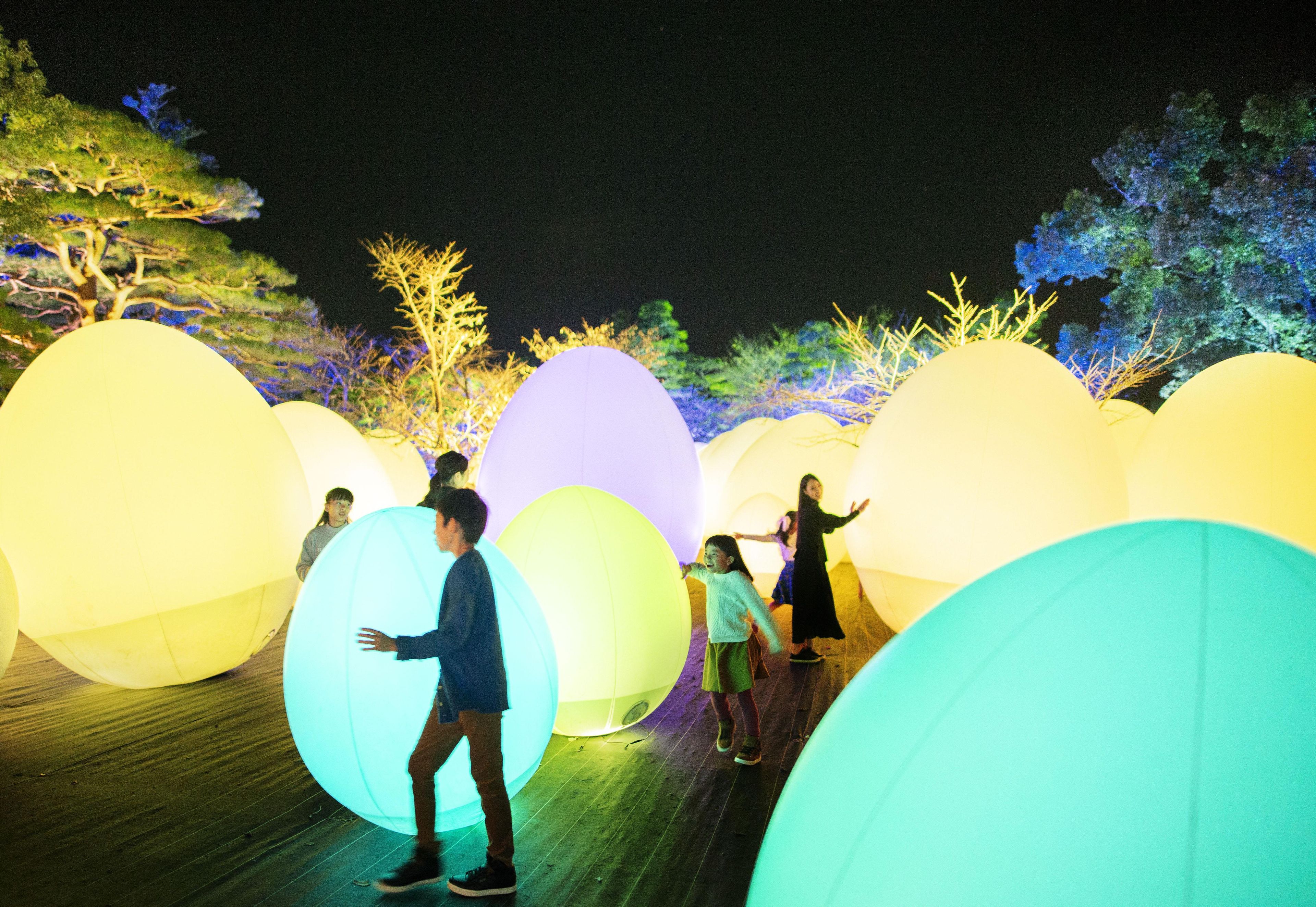 When an ovoid is pushed, the color of its light changes, and it emits a sound tone specific to that color. The light resonates out to other ovoids nearby. The sound tone resonates out continuously in the same way as the light, spreading throughout the ovoids in the space.