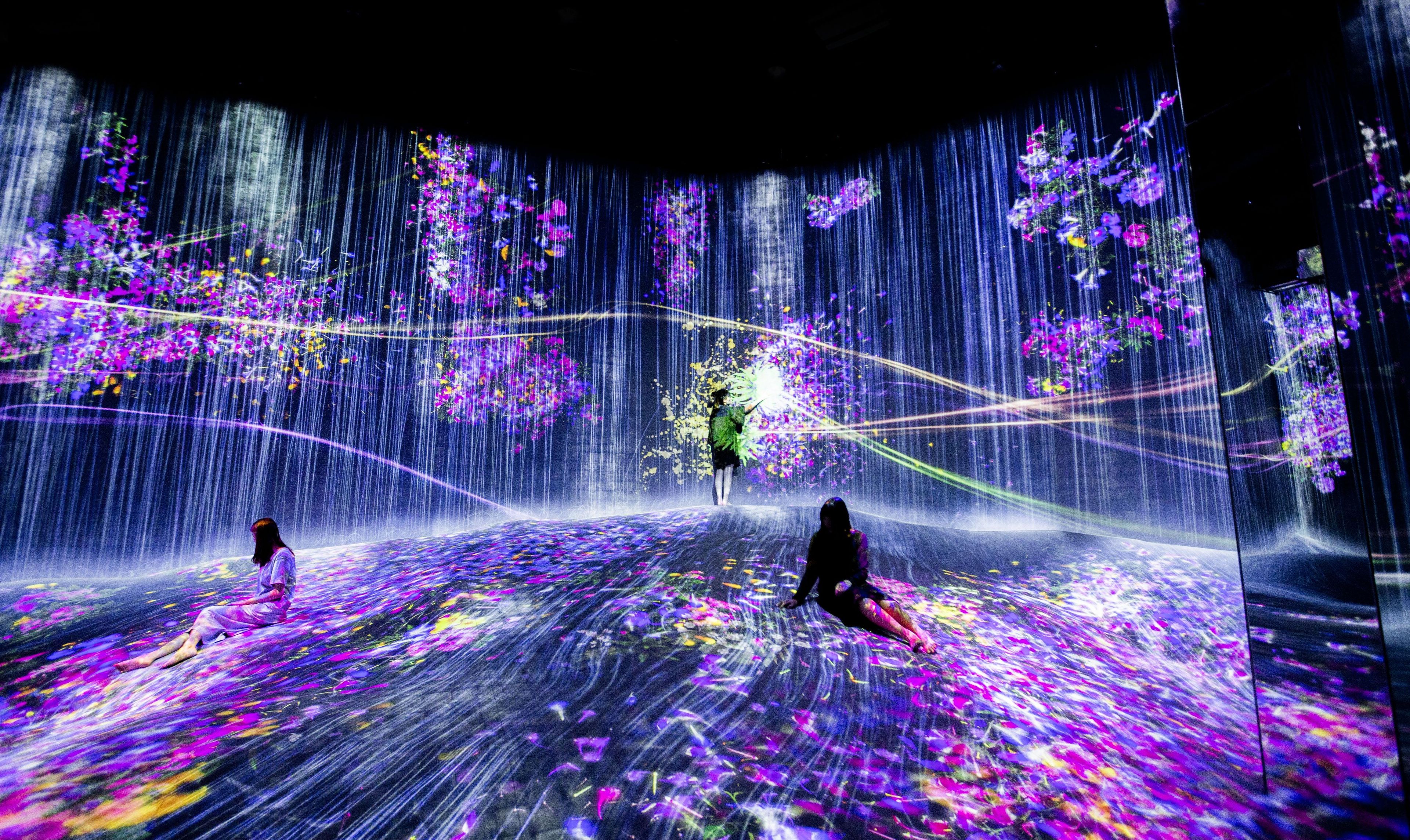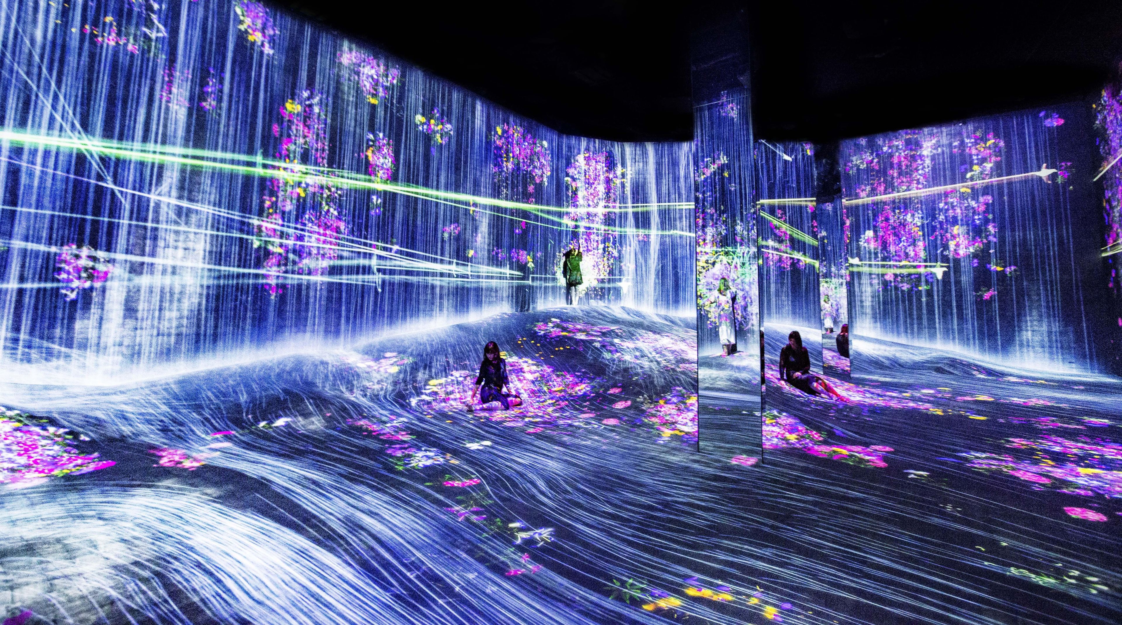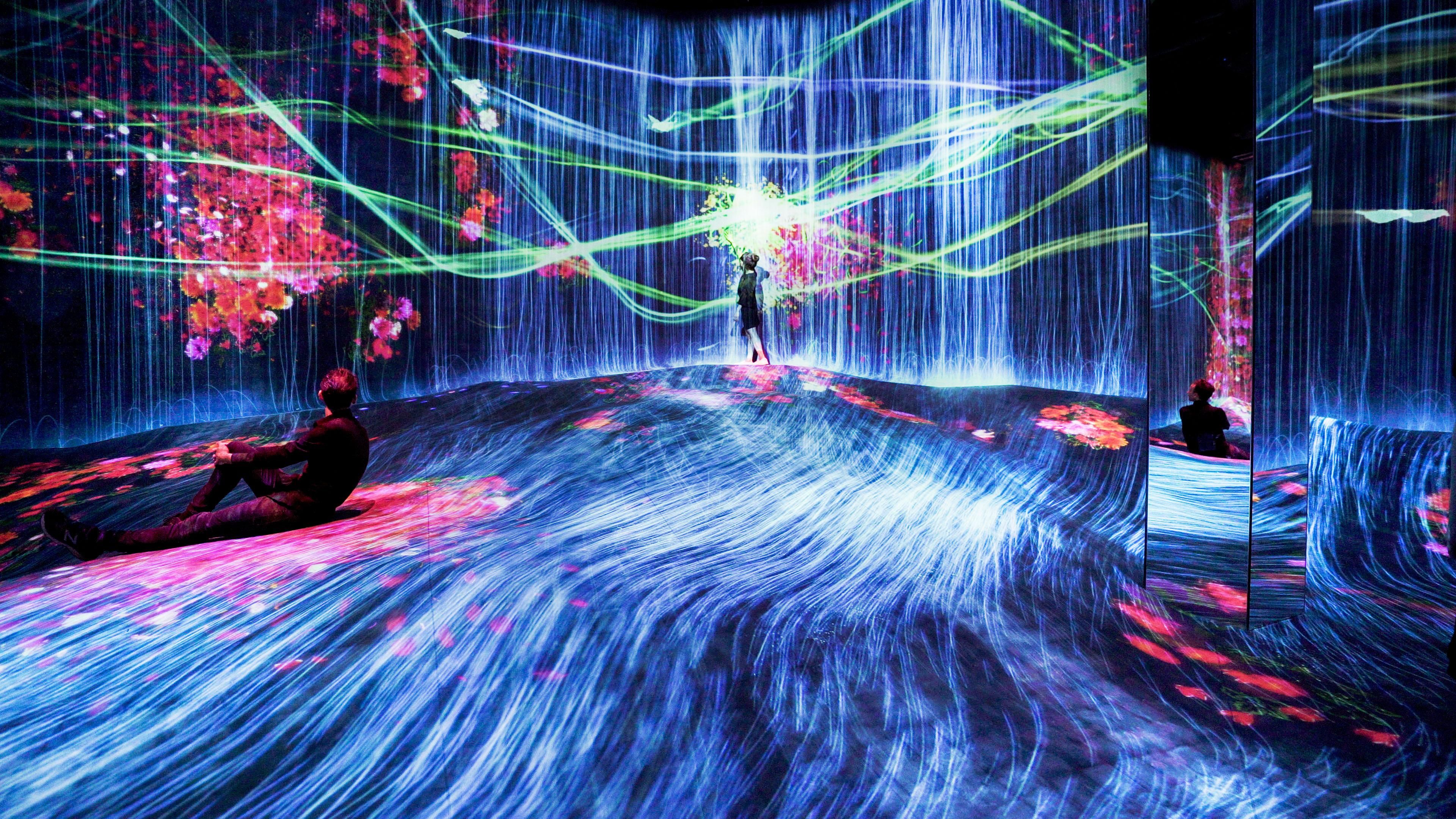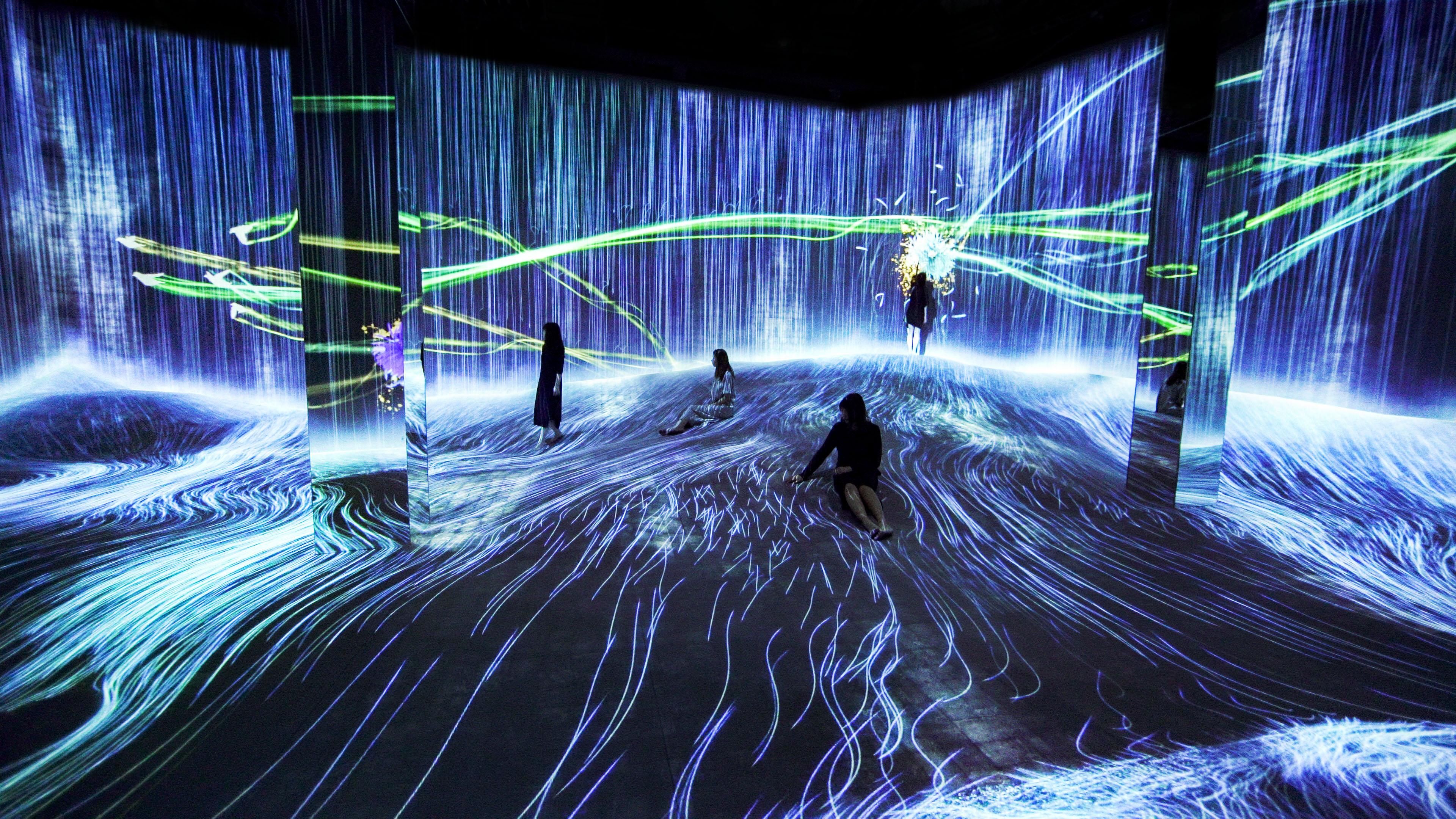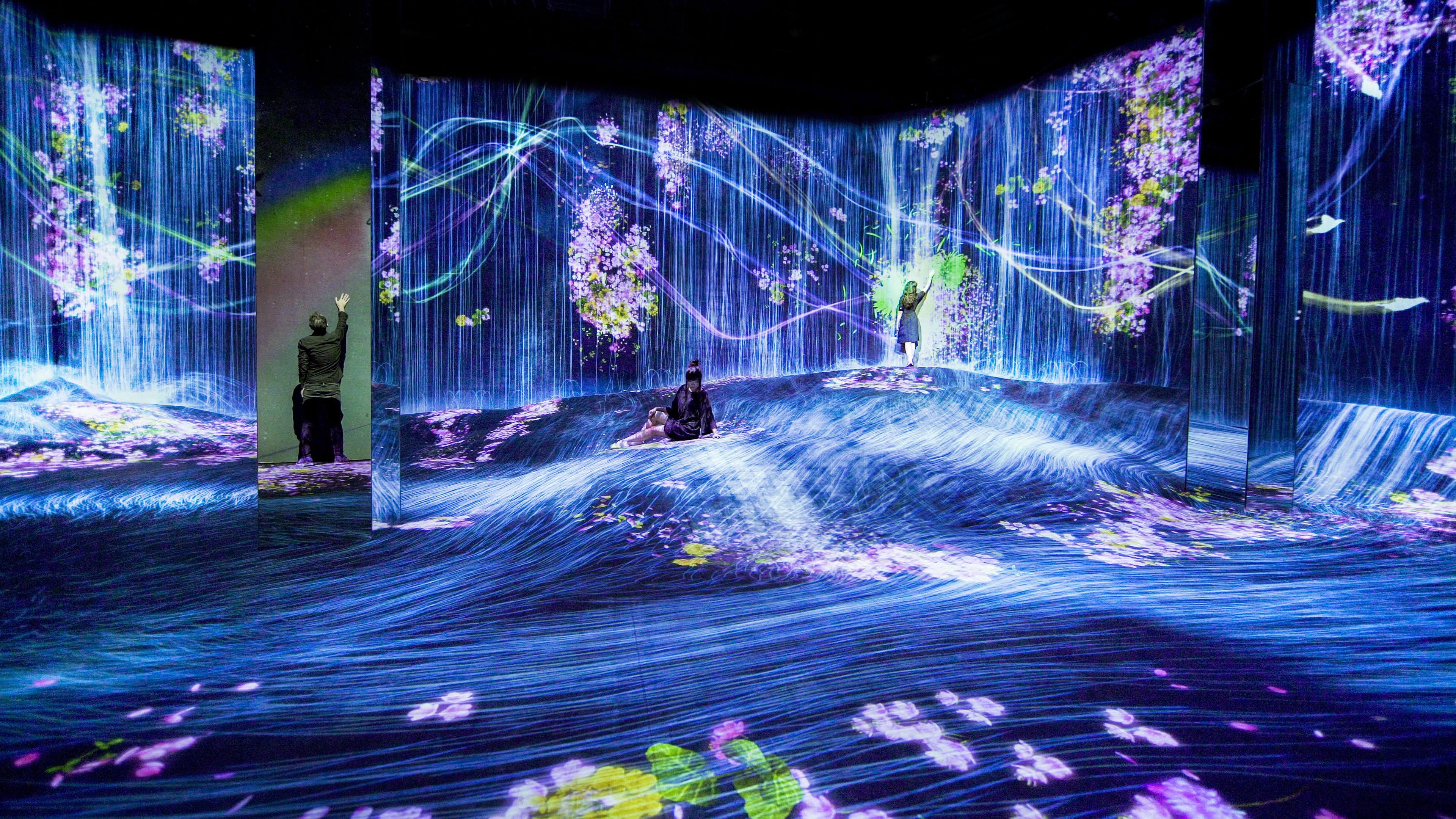 The artwork also influences other works. For example, the flow of water scatters the flowers that grow on the floor and the wall as part of Forest of Flowers and People: Lost, Immersed and Reborn. And the water in this artwork continuously flows into The Columns below, adding to the water there.