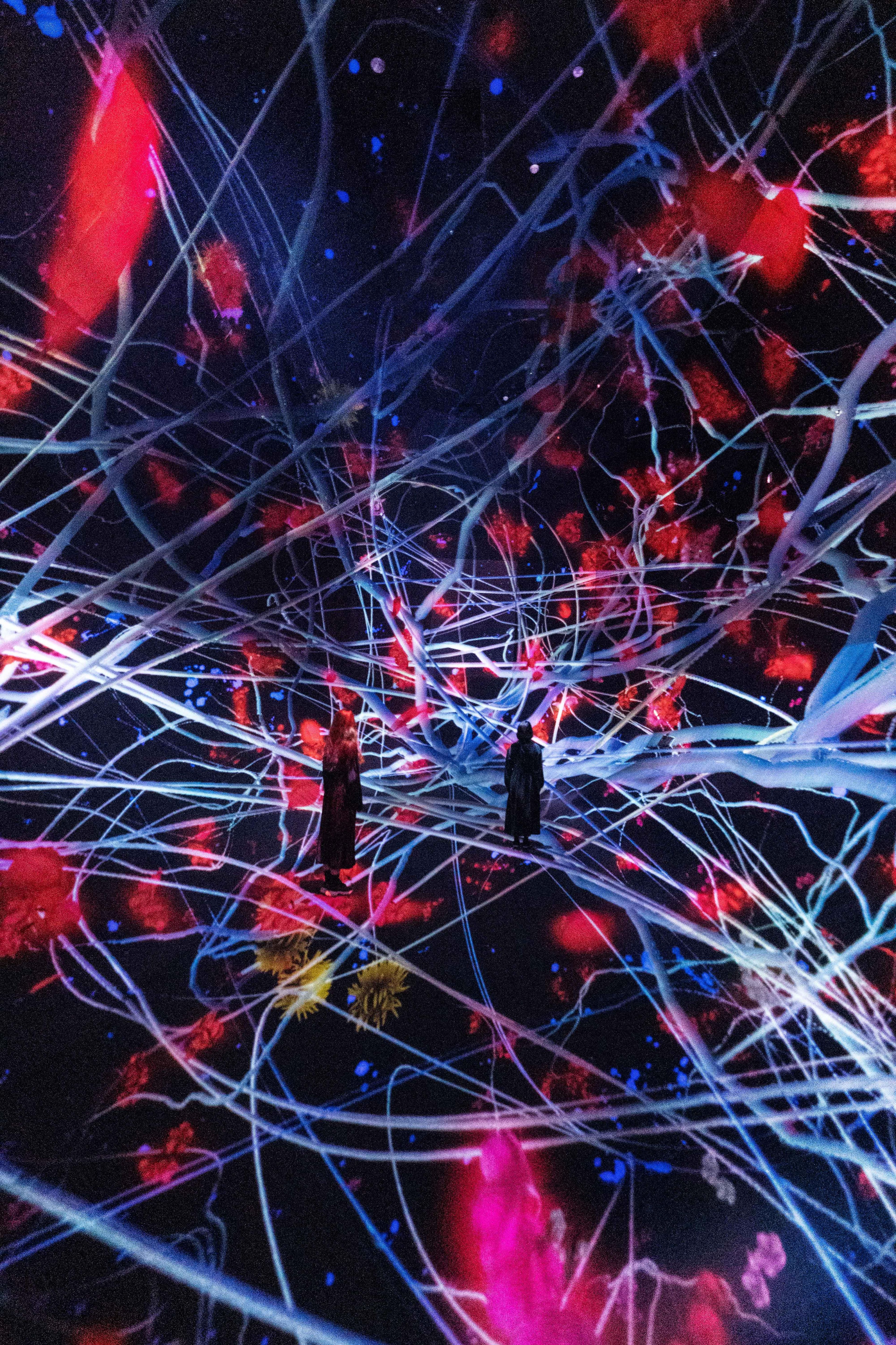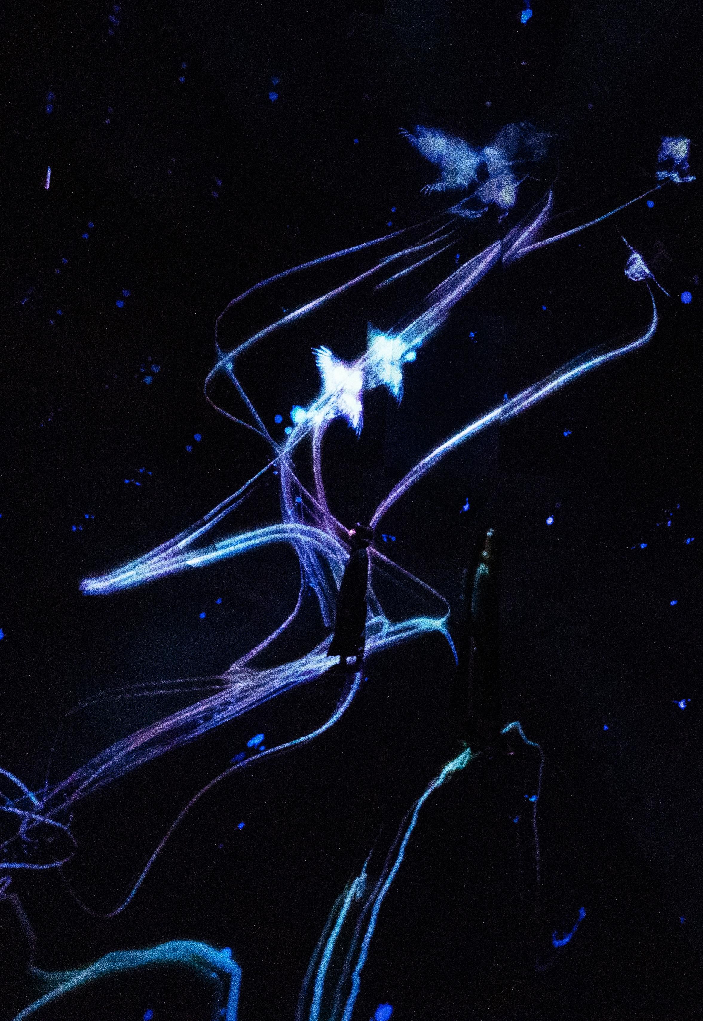 When people enter the artwork space, the artwork becomes one with the people and begins to move. Traces form in front of the people from their feet, eventually creating a single, long line as the artwork space and people move together as one. The world of the artwork transcends physical space, and the boundaries between people and the artwork world disappear.