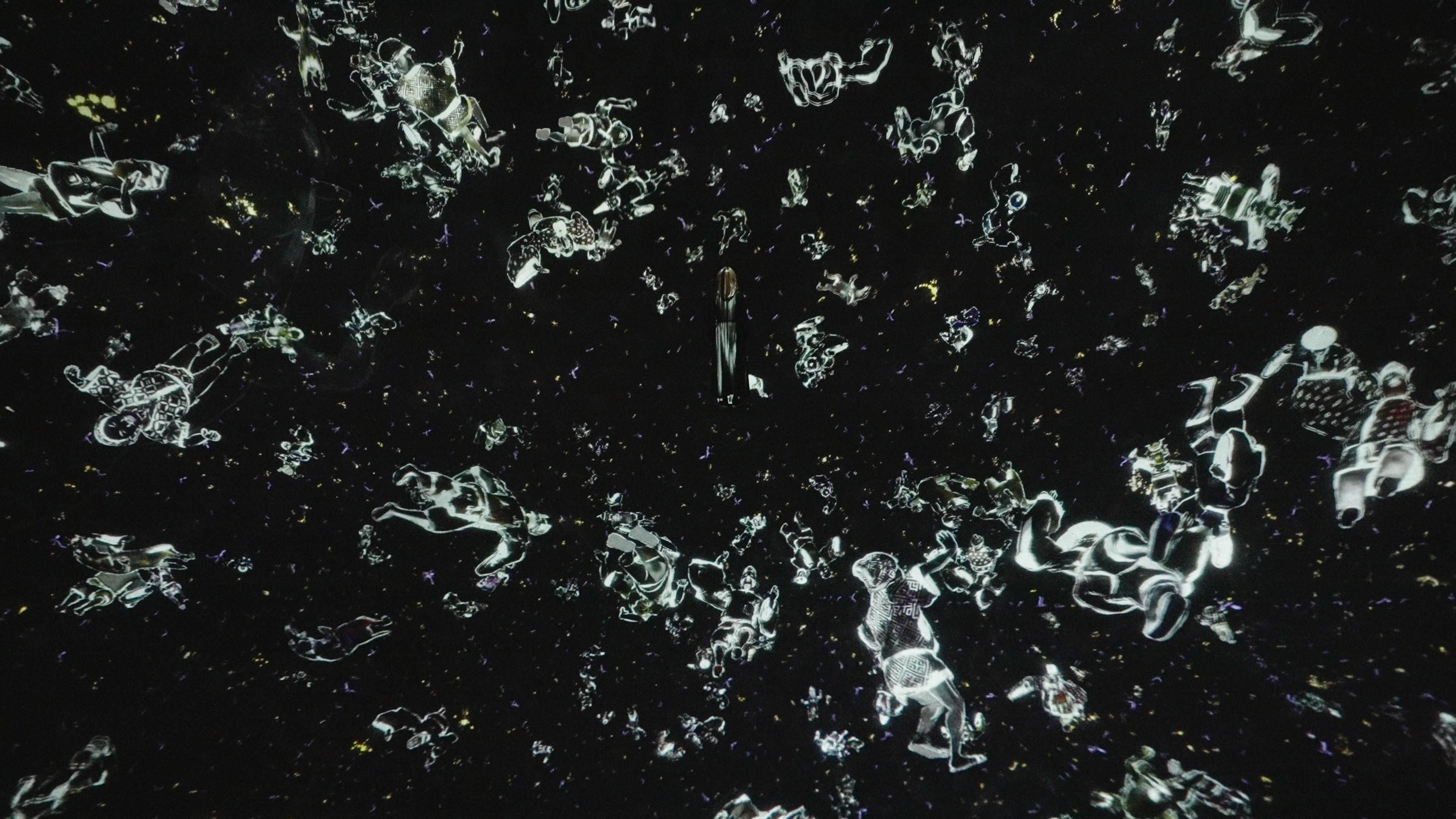 Anonymous and diverse figures walk freely in the space. They sing, and when they walk near visitors, they sing more. Just as the figures in the artwork move freely, singing and dancing in any direction, people in real life are also free to do the same.