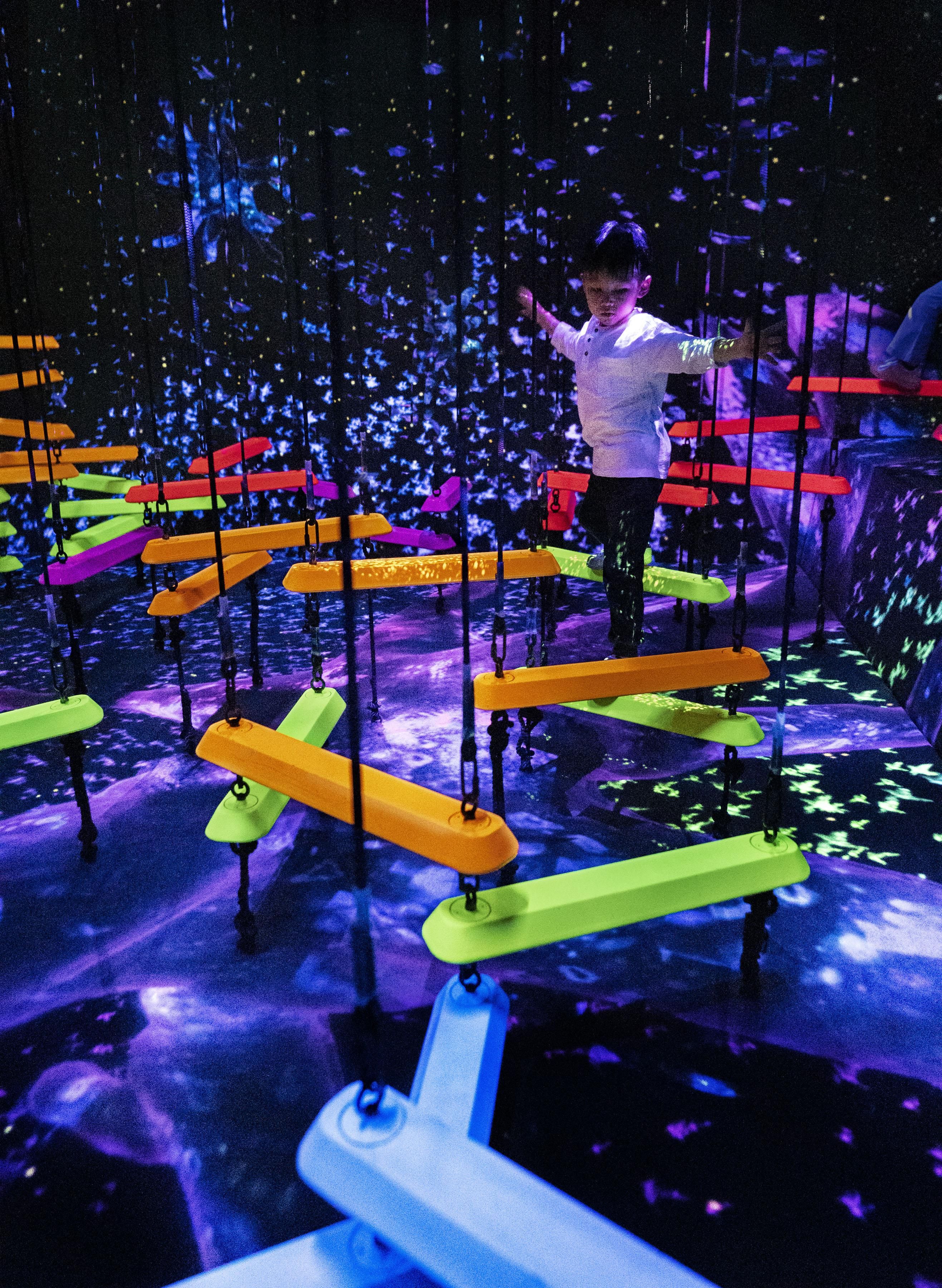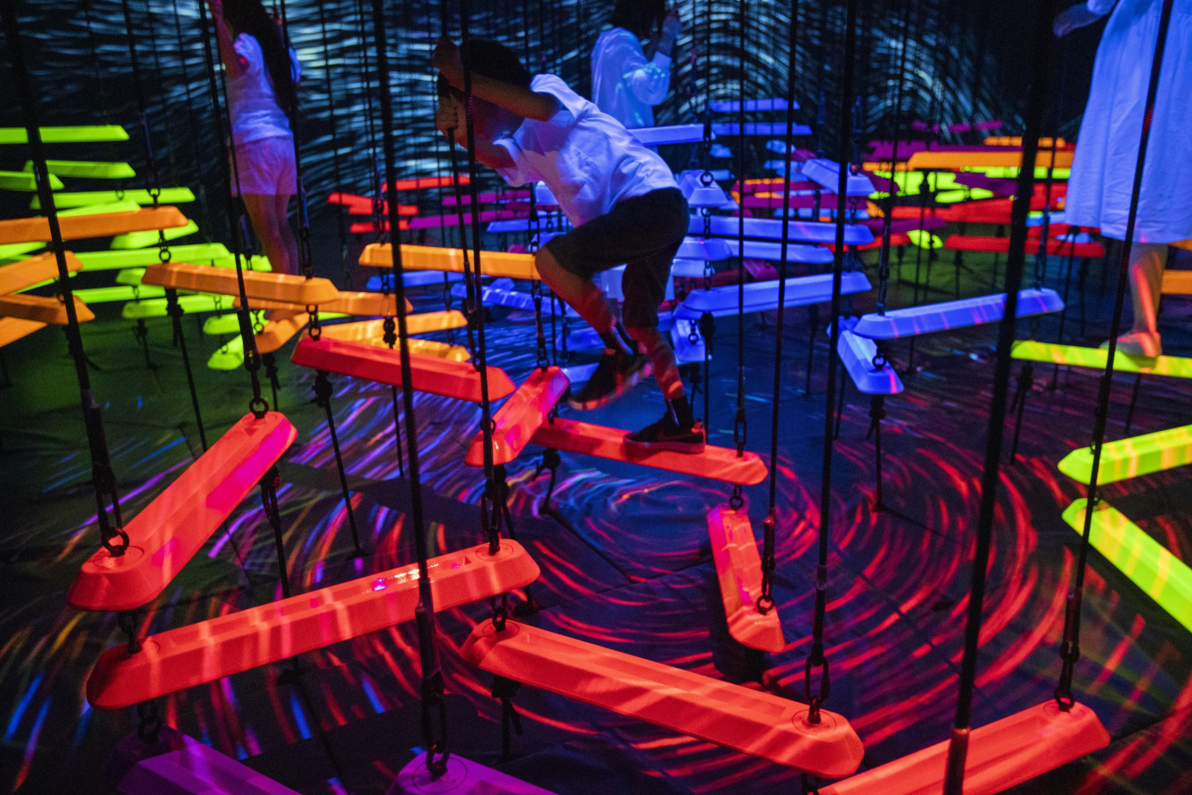 Aerial Climbing is a space where bars are suspended by ropes and float three-dimensionally in the air. When a person climbs on one of the bars, it affects the other bars because they are connected to each other. When a person crosses the bars, they affect the space.