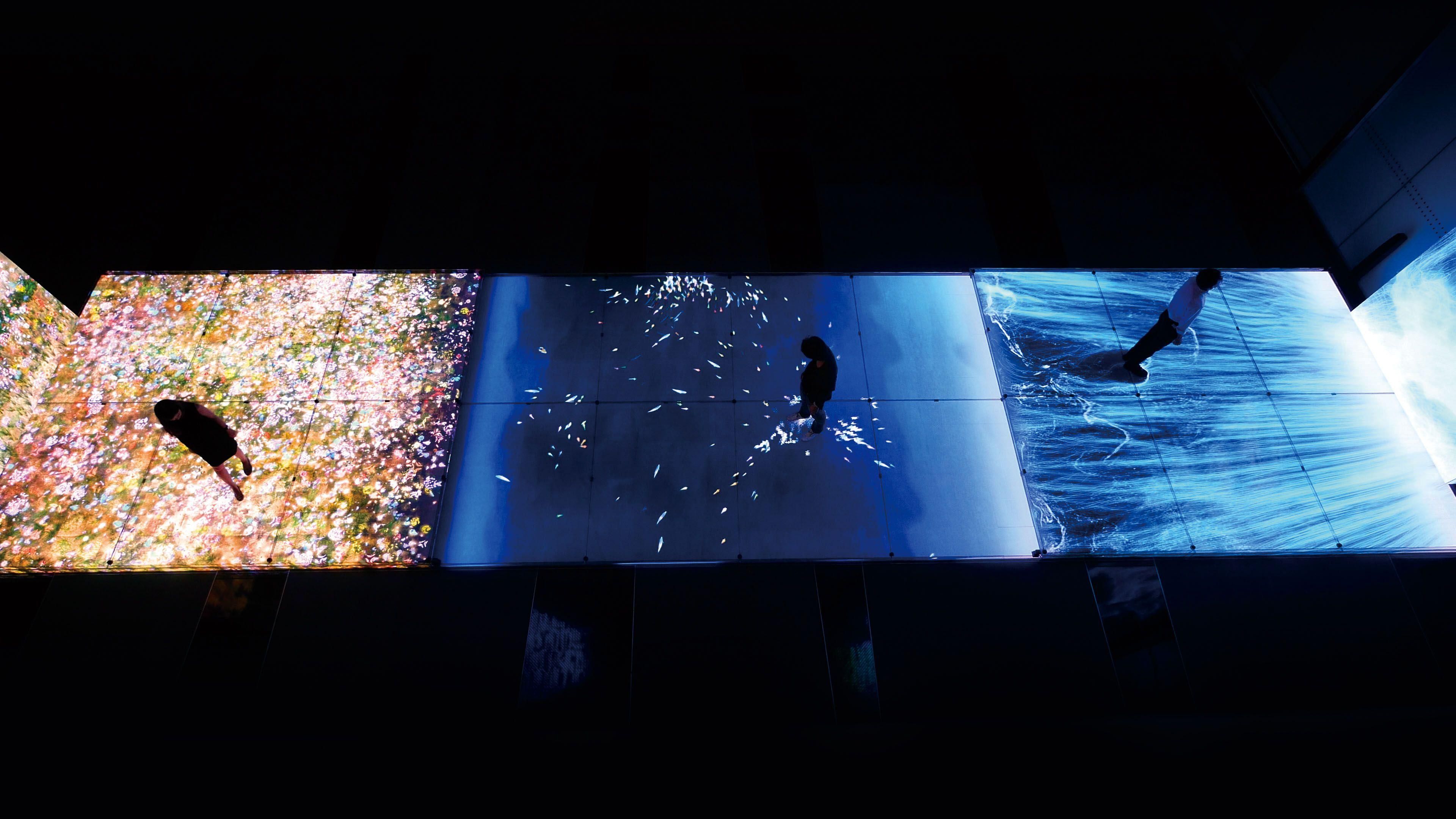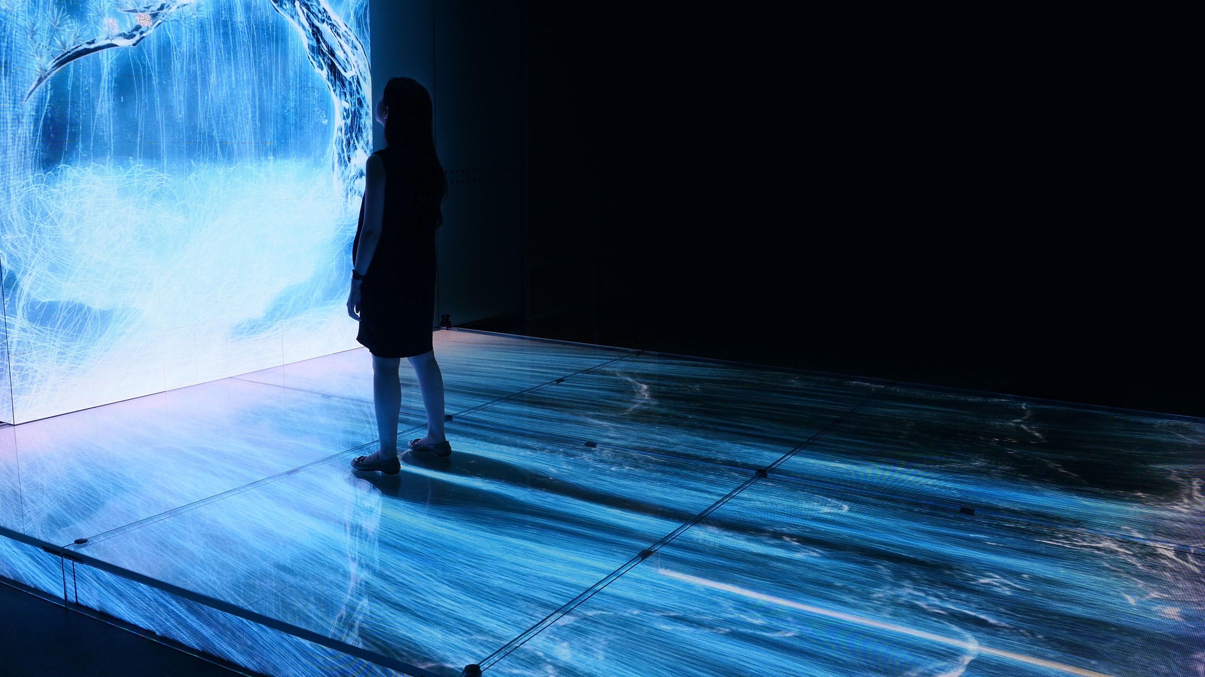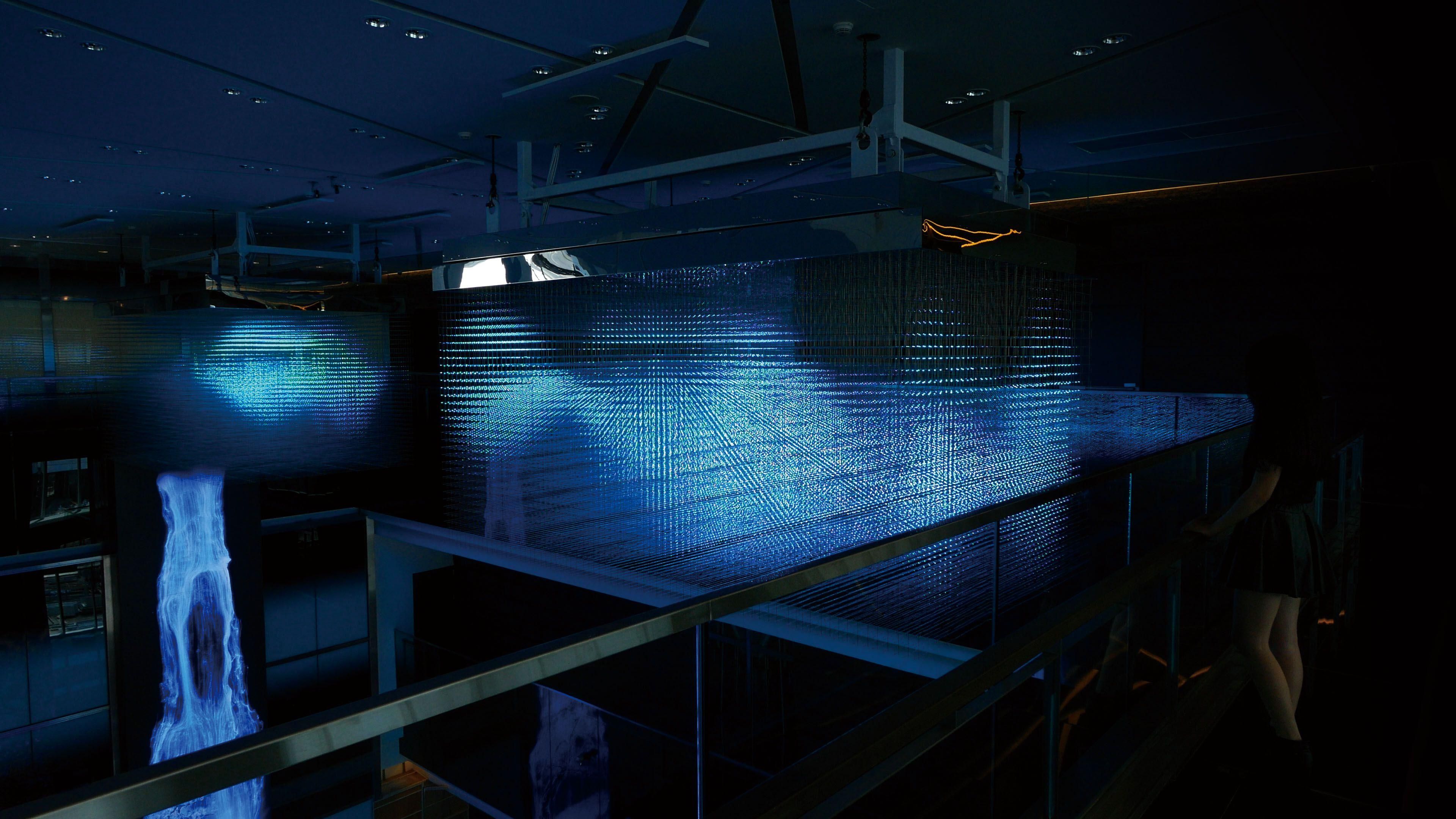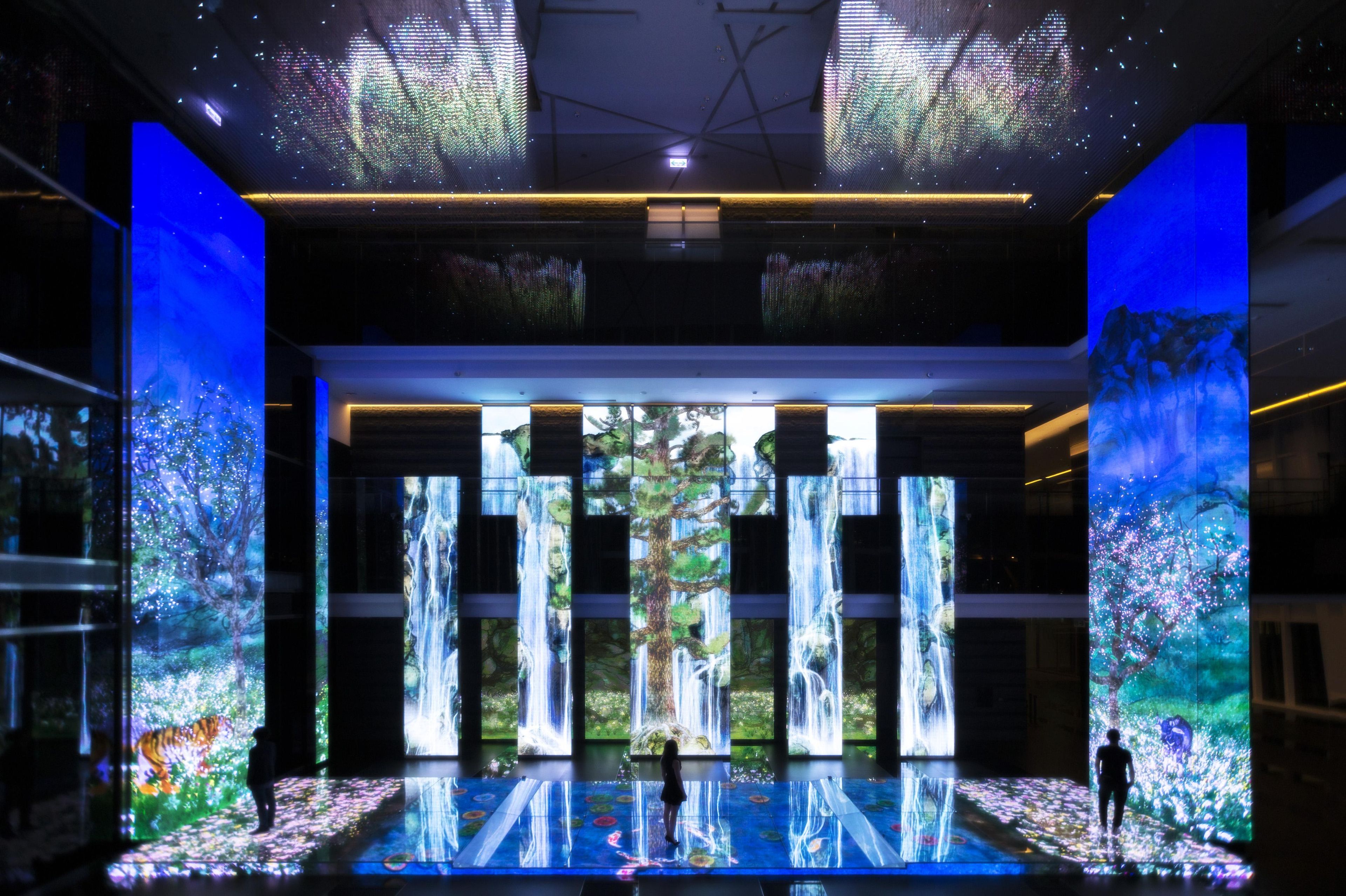 Dynamic, hued landscapes controlled by different factors, like viewers’ movements, or the temperature outside, emerge in “ultra-technologists group” teamLab’s magnificent interactive art installation at the CTBC Financial Park in Taipei. In a video released on their YouTube channel yesterday, the towering LED sculpture in the shape of ChinaTrust’s “Double-C Logo” cycles through a collection of visuals, including long strings of neon blue water with the consistency of angel hair trickling down a giant screen wall. The waterfall cascades down through a tall cherry blossom bonsai tree and onto a stage of glass panels, warping around the viewer’s stance. “Everything is connected in a cycle, but no events are ever repeated in exactly the same way,” teamLab explains in Circulum Formosa’s video description, channeling the complexity of the natural forces the piece imitates.