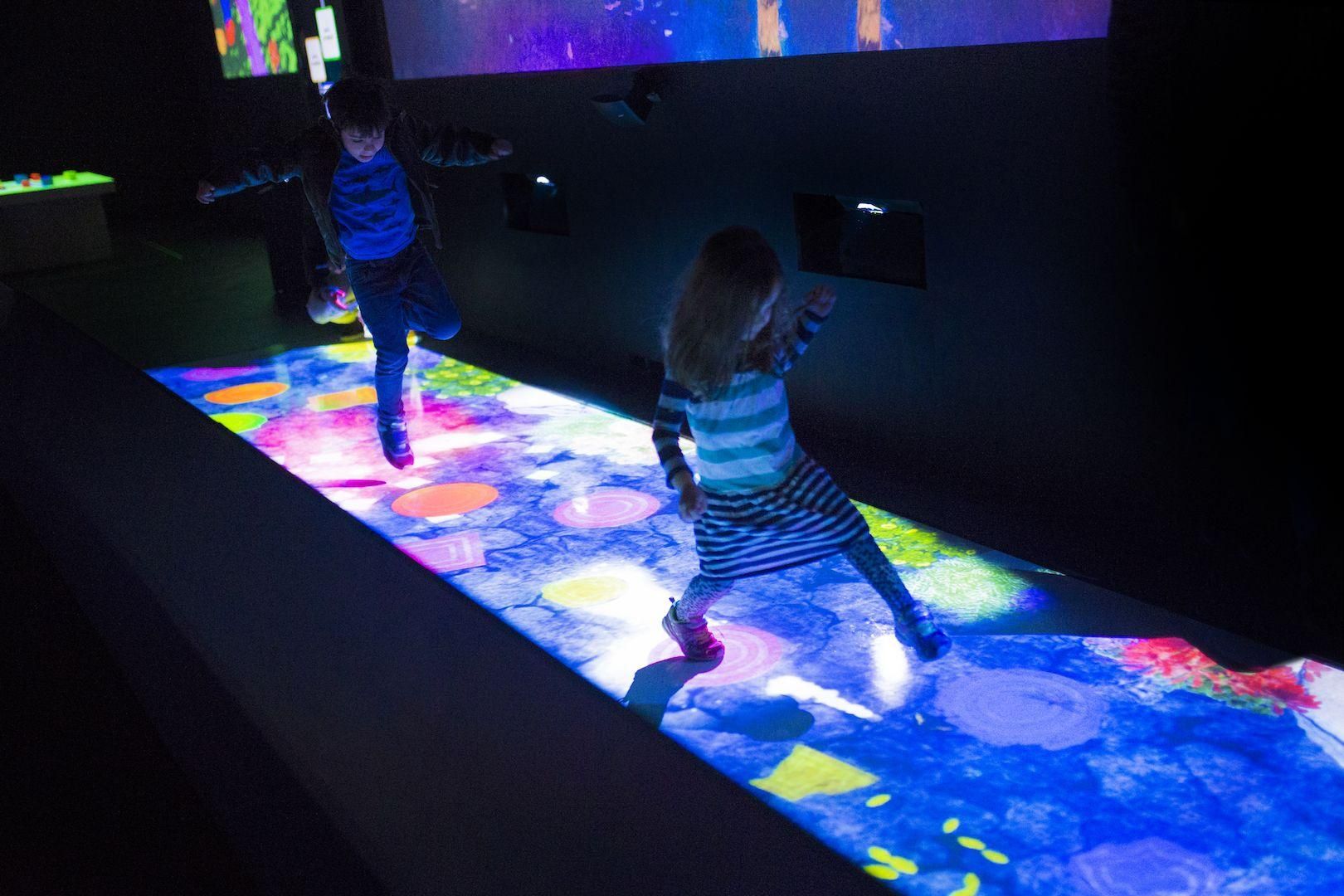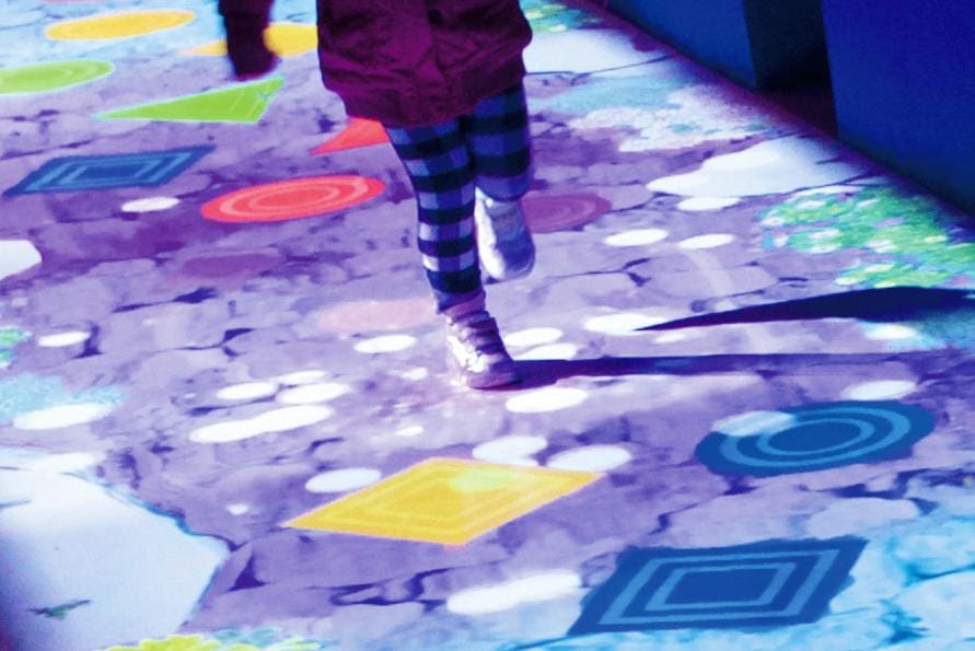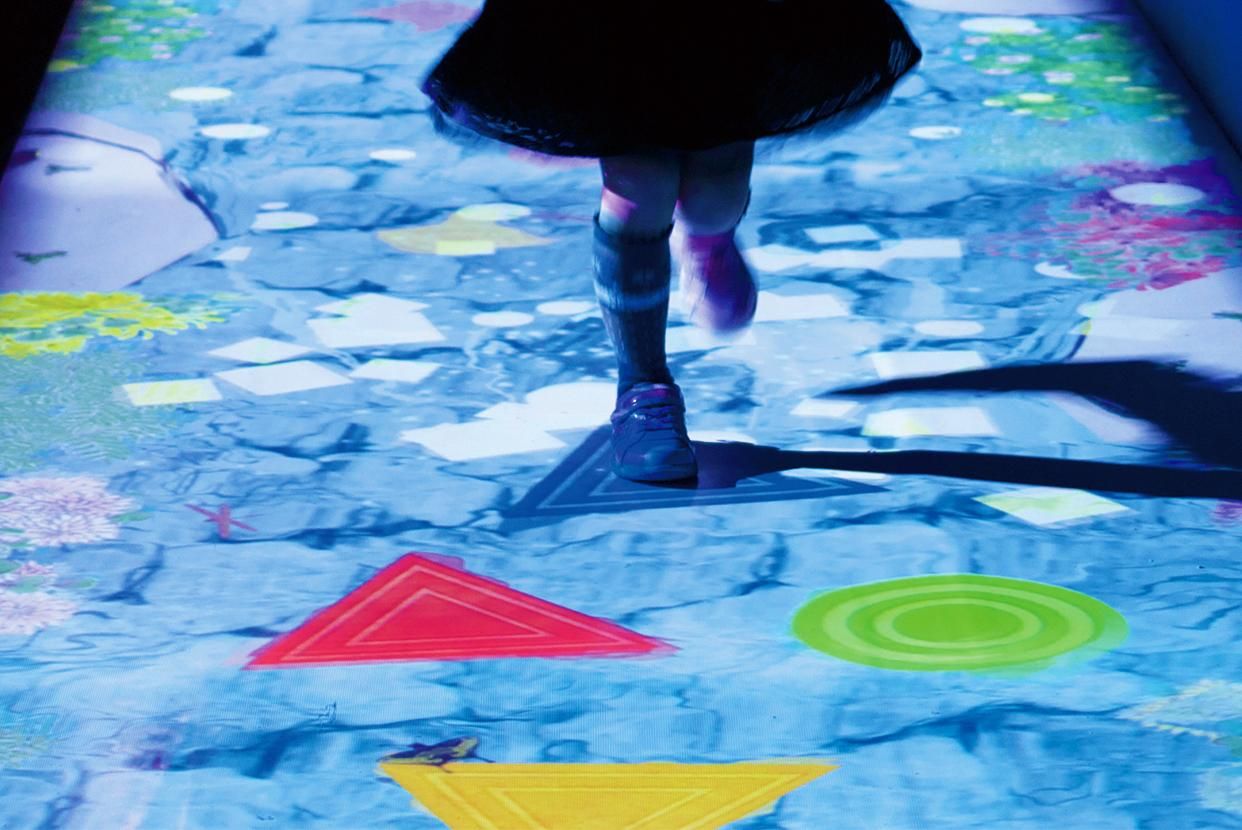 Create! Hopscotch for Geniuses is the digital version of the childhood game hopscotch. Participants are invited to create their own hopscotch course, consisting of projected circular, triangular, and square shapes. Each participant is able to determine the level of difficulty while making full use of his or her imaginative and creative skills. Different sound effects and beautiful images emerge as participants land on the same shape or color in succession.