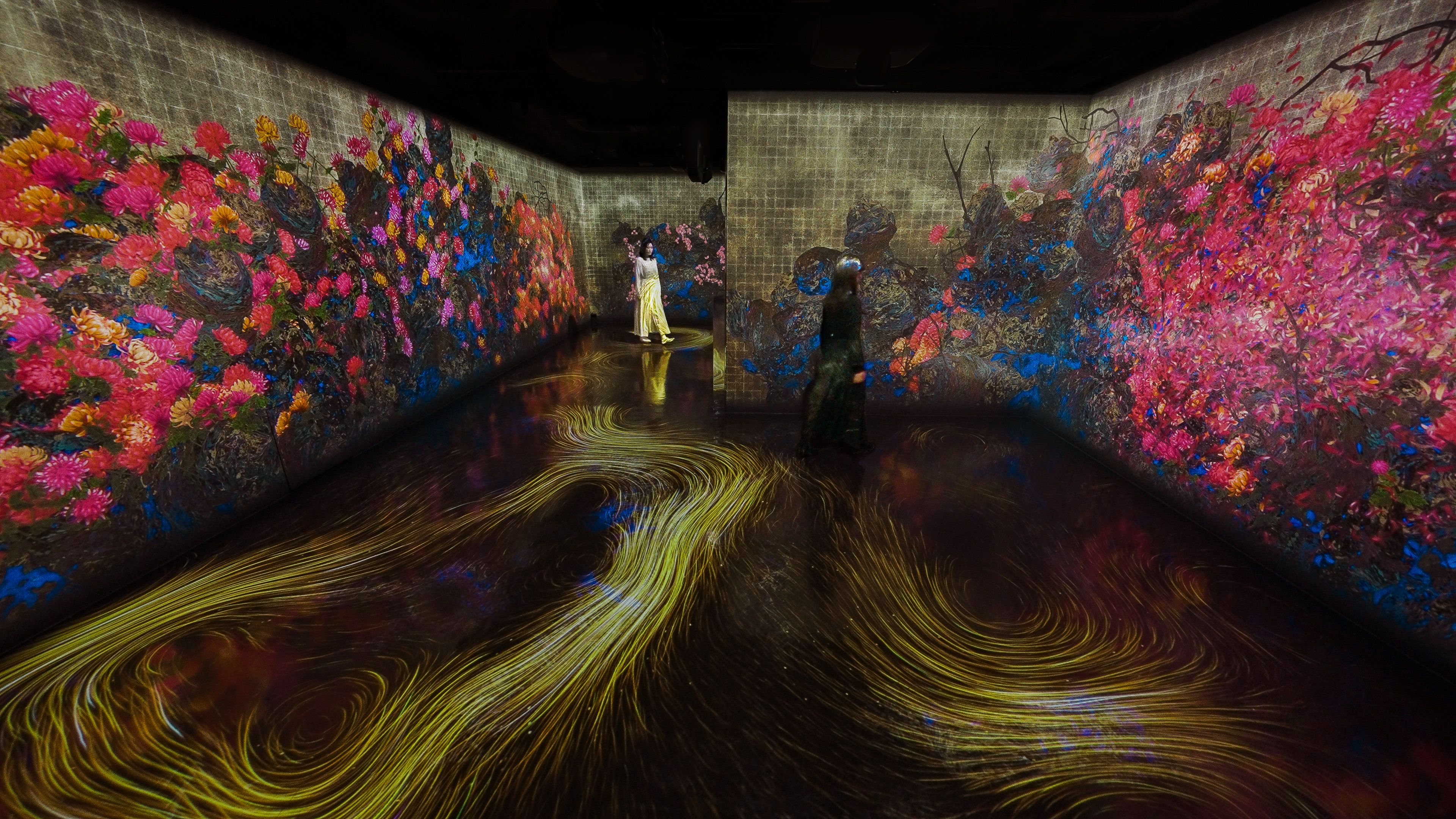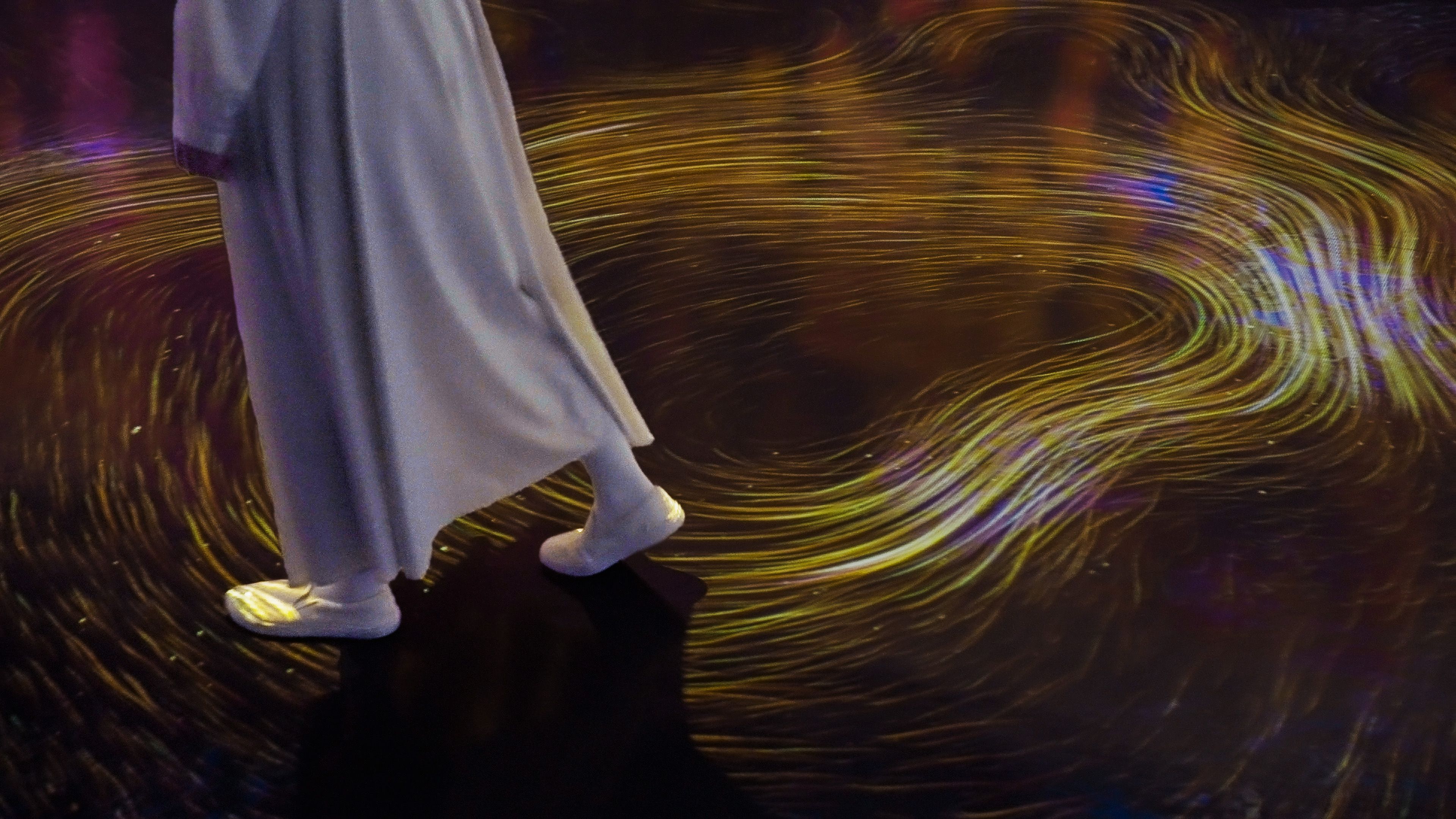 The flow in the artwork is expressed as a continuum of particles, and lines are drawn in three-dimensional space according to the trajectories of those particles. The accumulation of lines that represent the work are then flattened according to what teamLab calls Ultrasubjective Space.