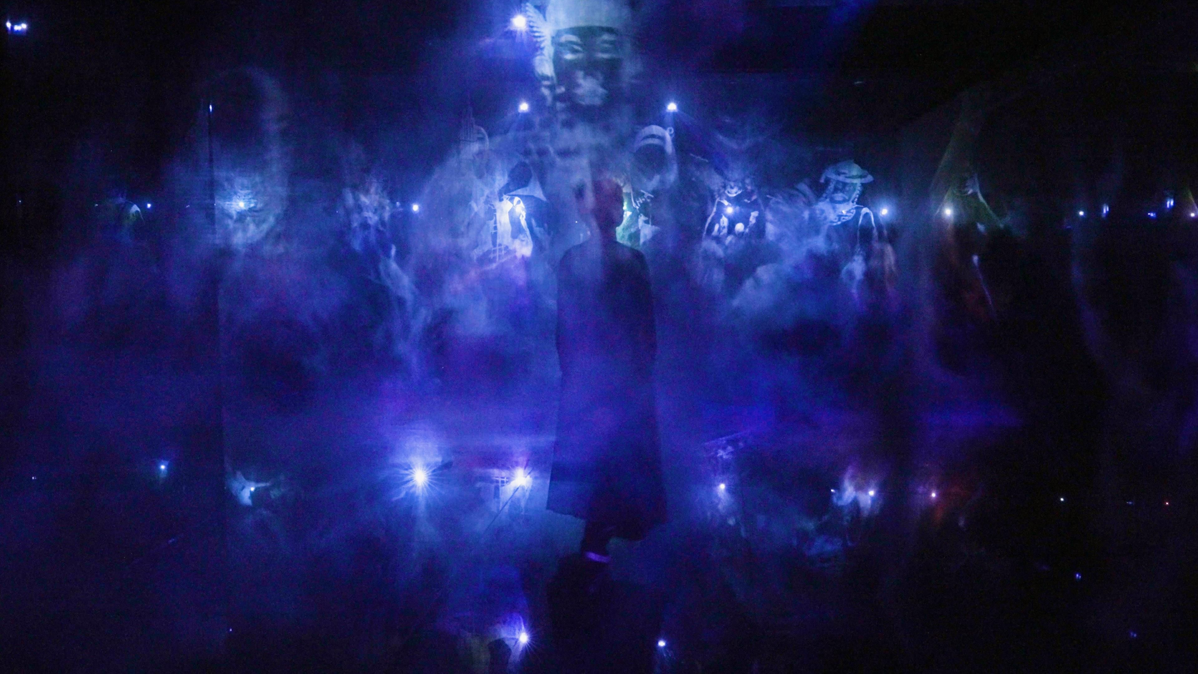 Multiple viewpoints are placed in the space of the world of the artwork, and the space of the artwork around the viewpoints is cut out and flattened using Ultrasubjective Space. When this flat surface is then placed in the exhibition space in the same position relative to the viewpoints, the world of the artwork is superimposed on the exhibition space. The viewer's viewpoint is not fixed; their viewpoint can move freely not only left and right but also in the depth direction, allowing them to explore a physical perception that immerses their entire body in the world of the artwork as they walk freely in all directions. When the viewer sees other people overlapping with the work through the screen, for them it is equivalent to that person being present not only in the exhibition space but also in the space of the artwork, and the other people become a part of the work.