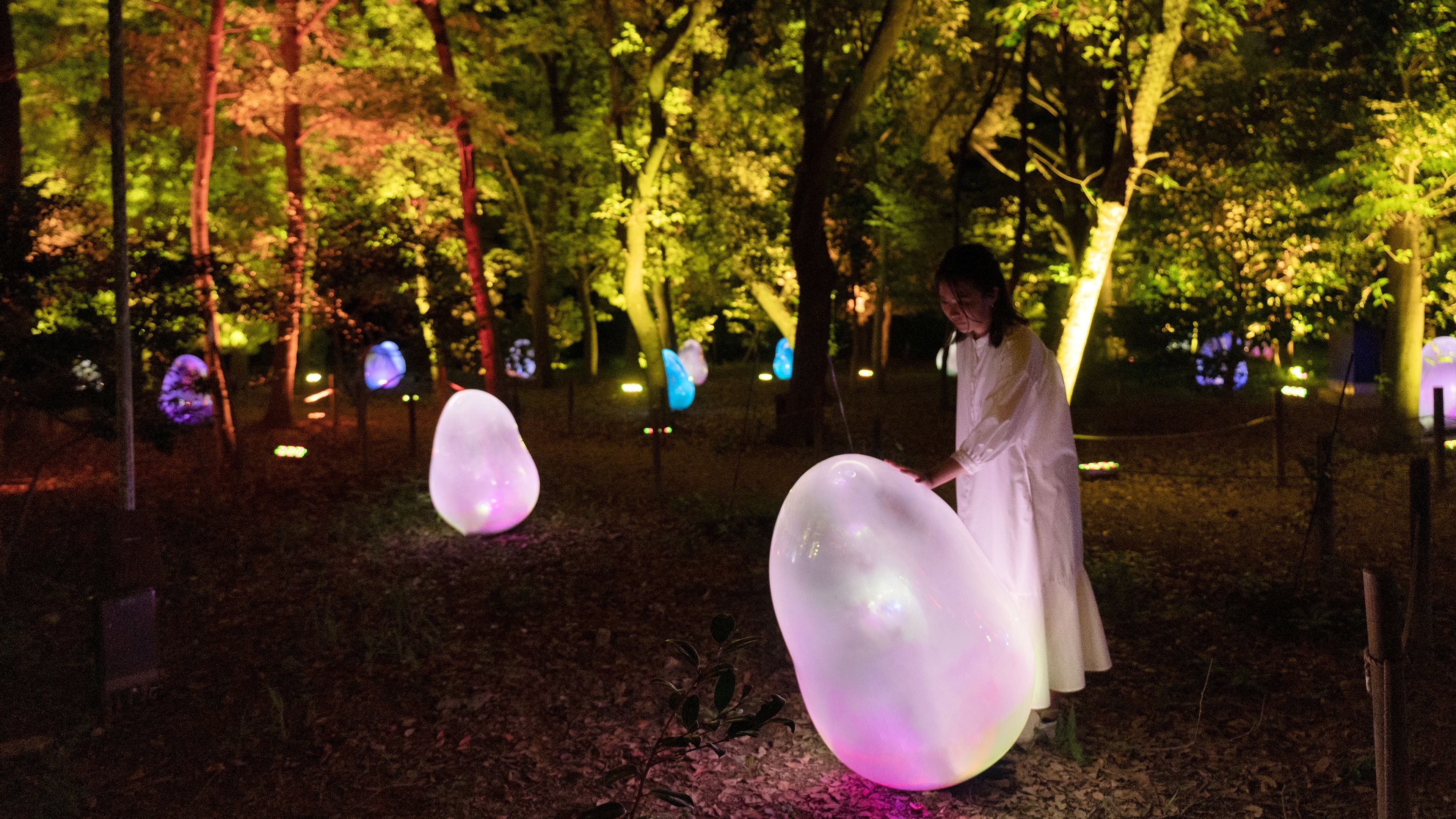 As the sun sets, the ovoids begin to shine by themselves. When an ovoid is pushed by a person, blown by the wind, or hit by rain, it shines brightly and produces a tone as it rises back up on its own. The surrounding ovoids also respond one after another, resonating and emitting the same tone and light color.