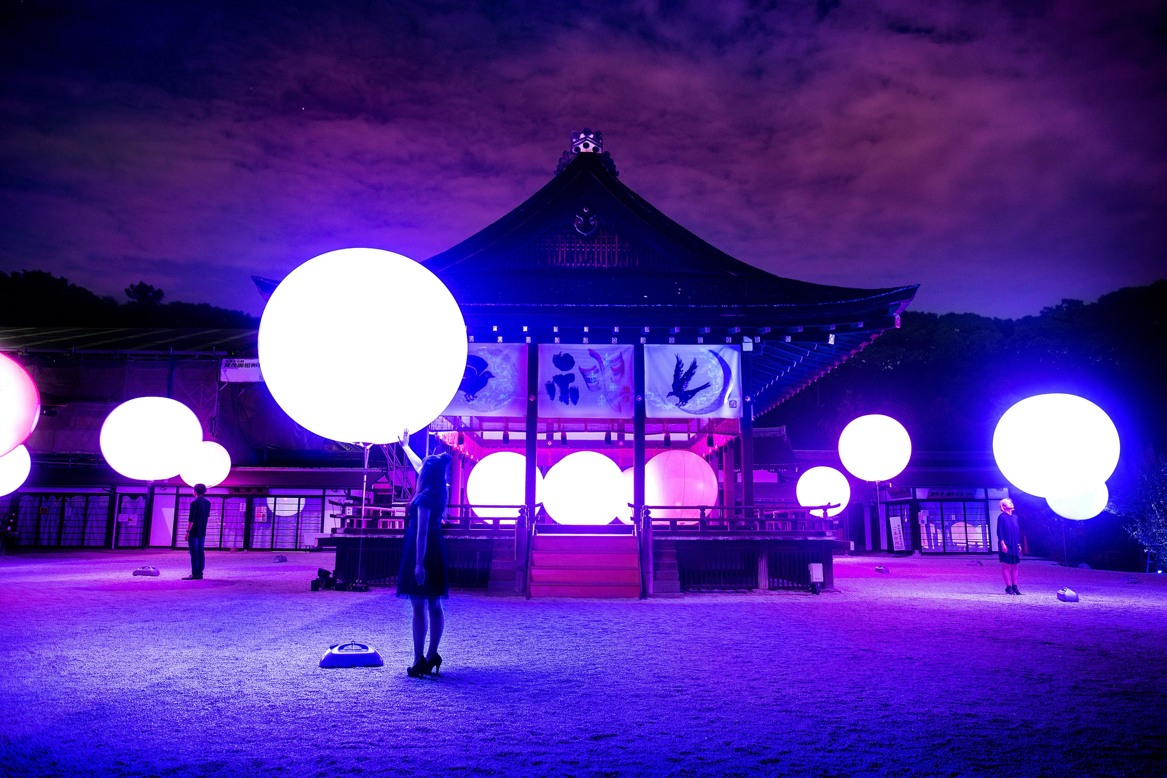 At the World Heritage Site of the Forest of Tadasu at Shimogamo Shrine, teamLab is going to exhibit the art piece "Resonating Trees – Forest of Tadasu at Shimogamo Shrine" by lighting up trees along the road approaching the shrine, as well as the art piece "Resonating Spheres – Forest of Tadasu at Shimogamo Shrine" by illuminating the inside of the tower gate.