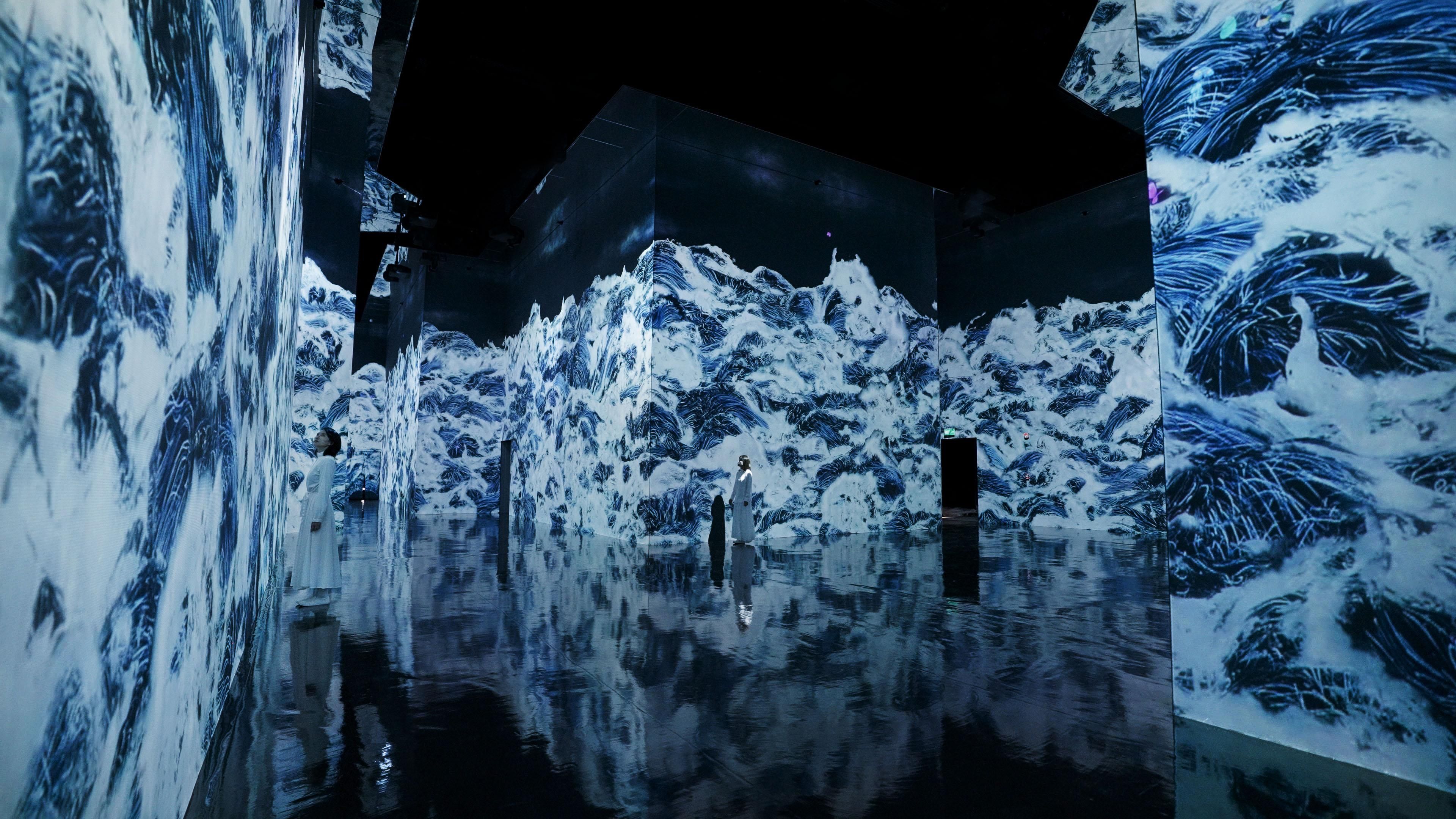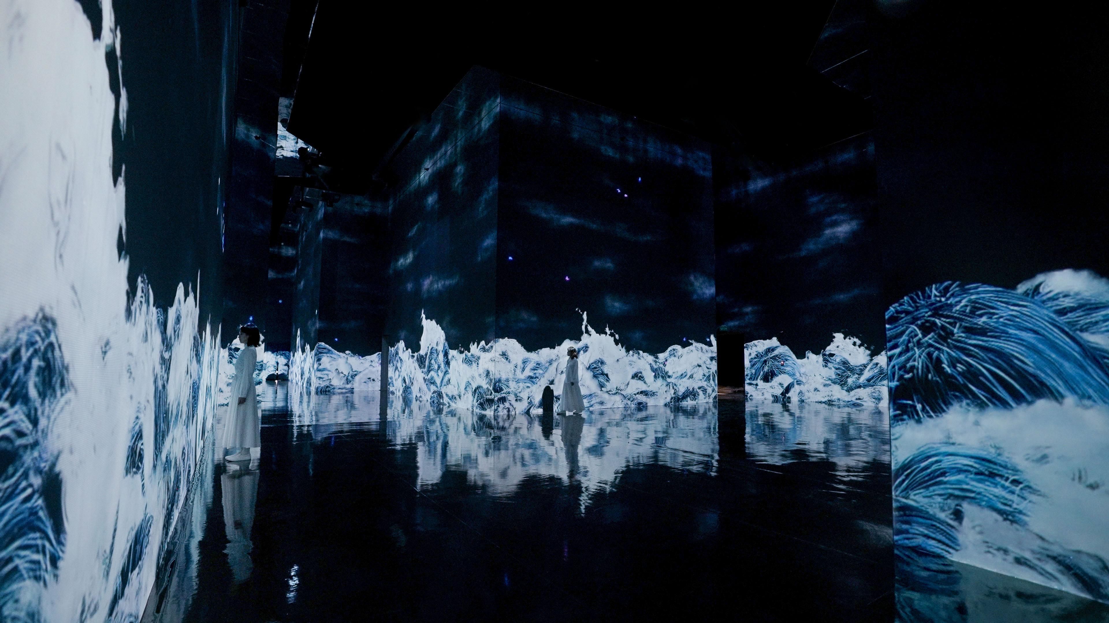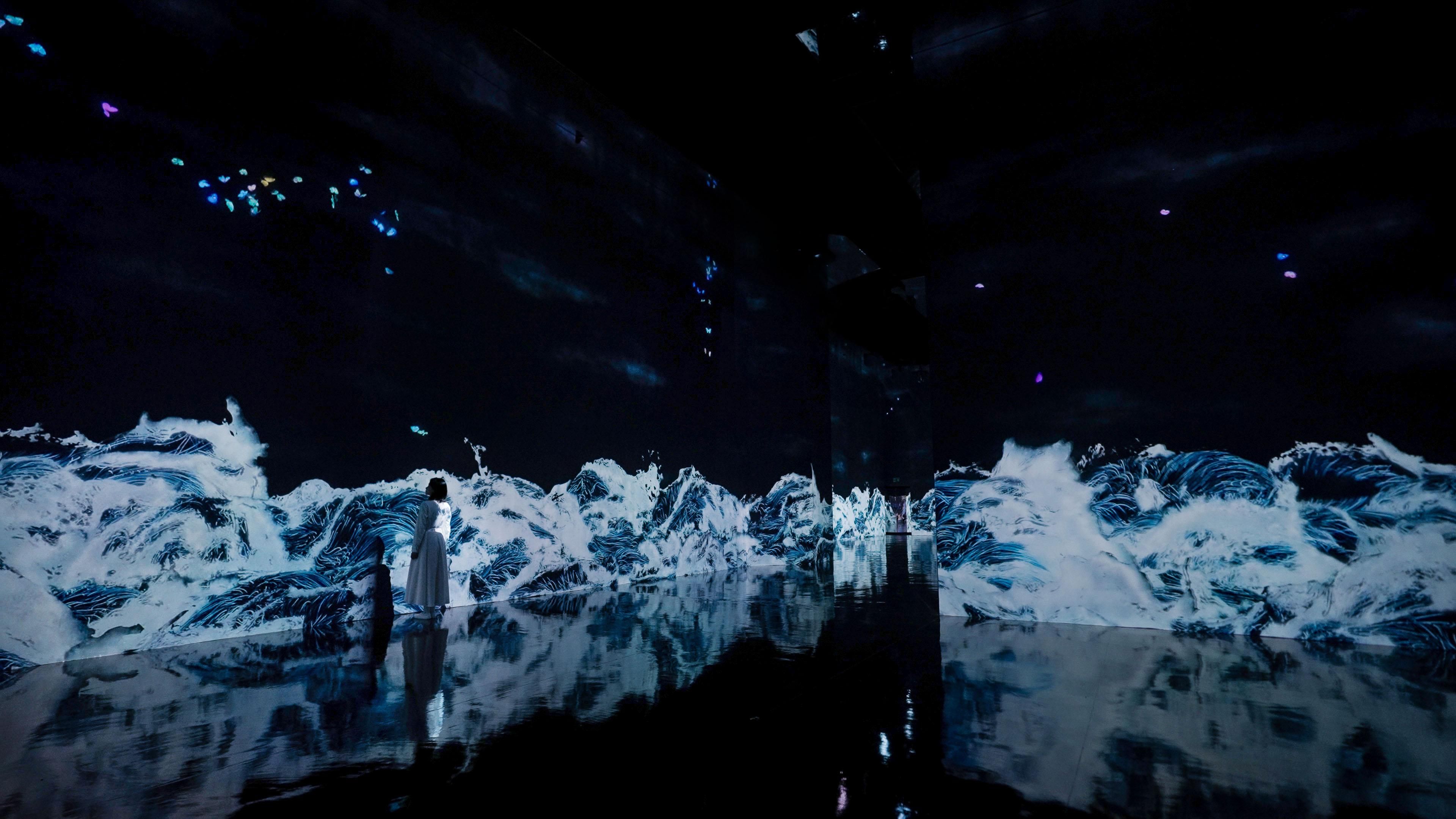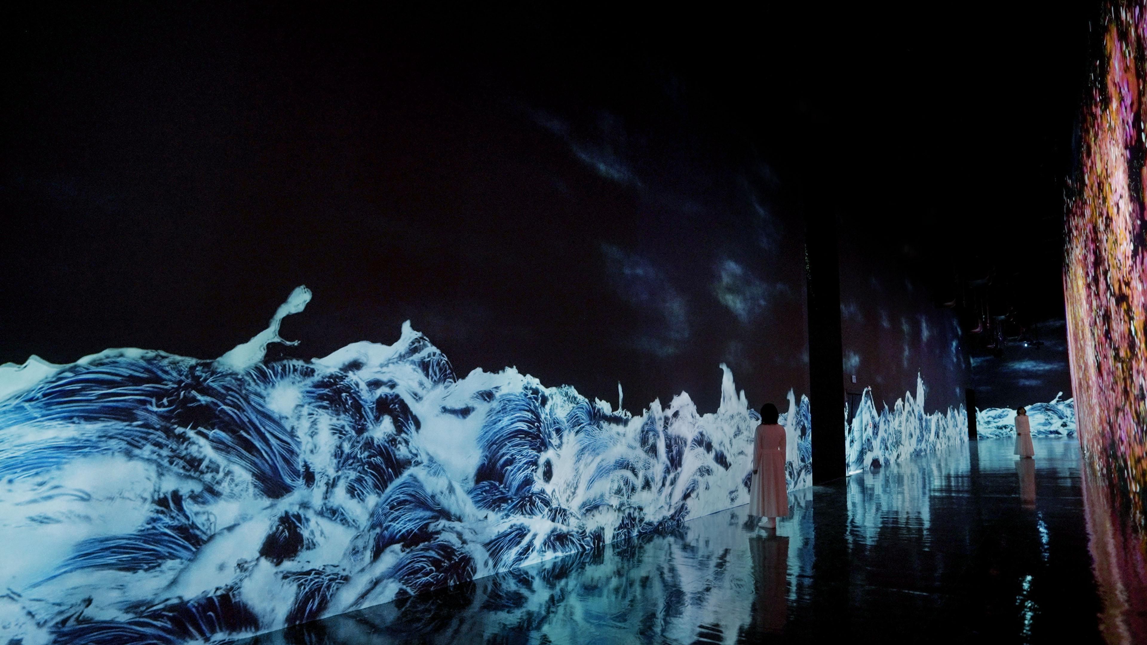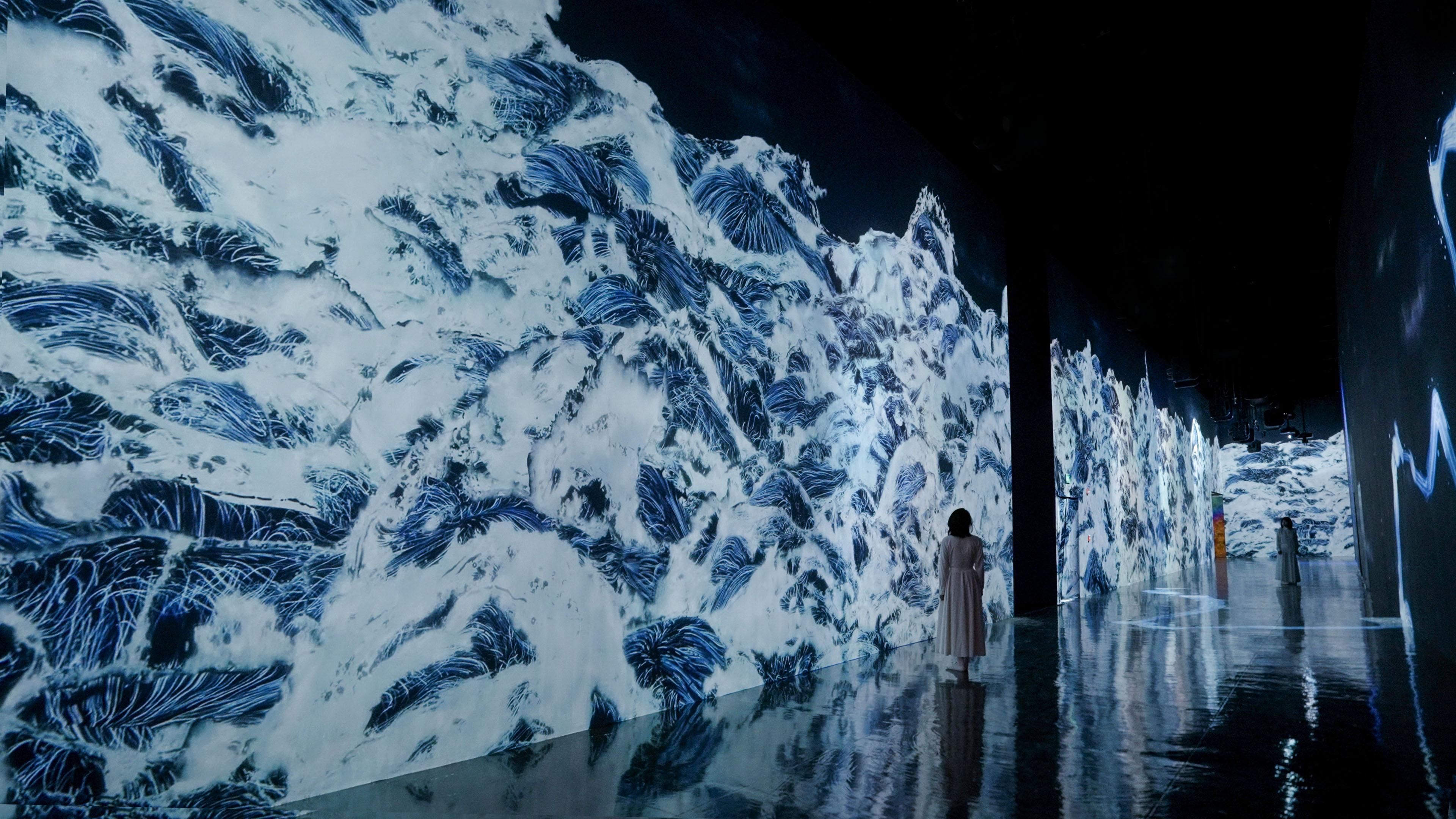 The lines are created with what teamLab refers to as Ultrasubjective Space. In contrast to space that is created through, or cut out by, lenses and perspective, Ultrasubjective Space does not fix the viewer’s viewpoint and in turn frees the body. The wall that the waves are seen on does not become a boundary between the viewer and the artwork, and the artwork space is continuous with the space of the viewer’s body.