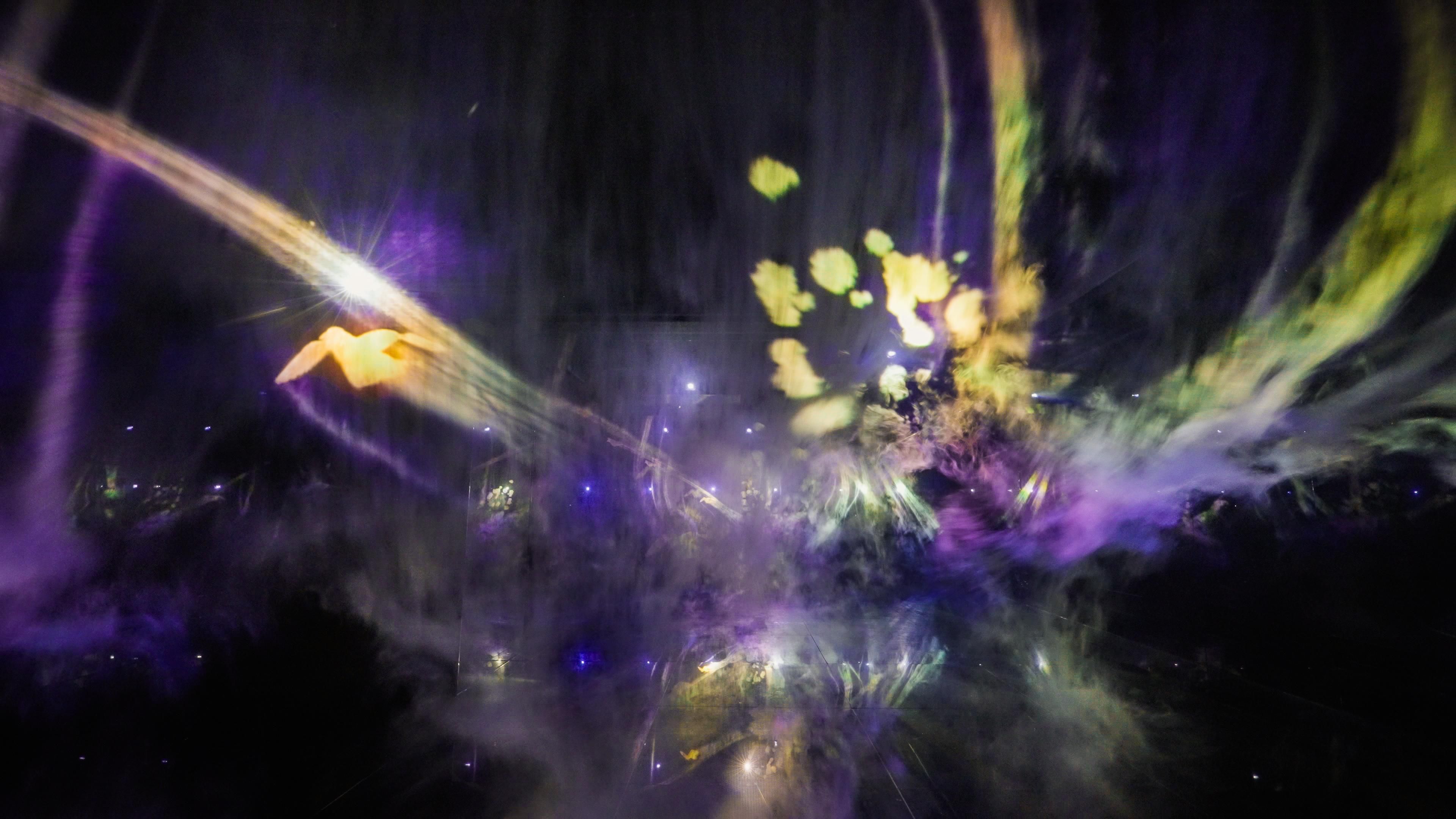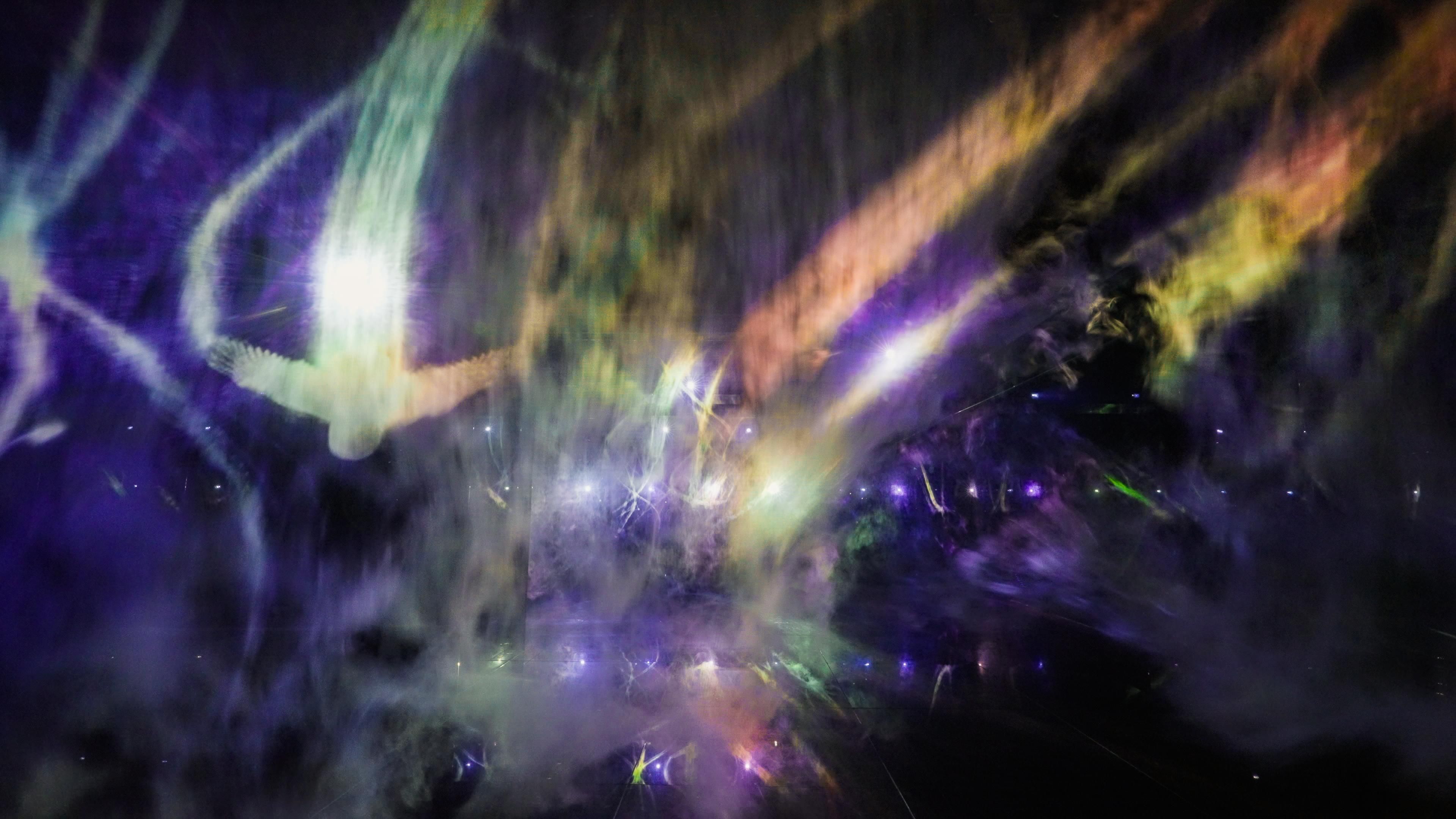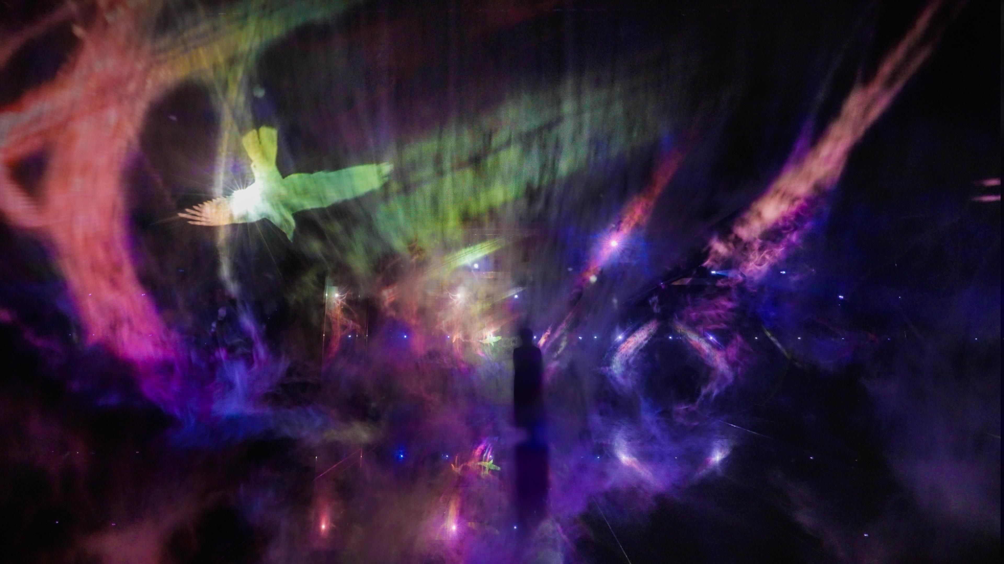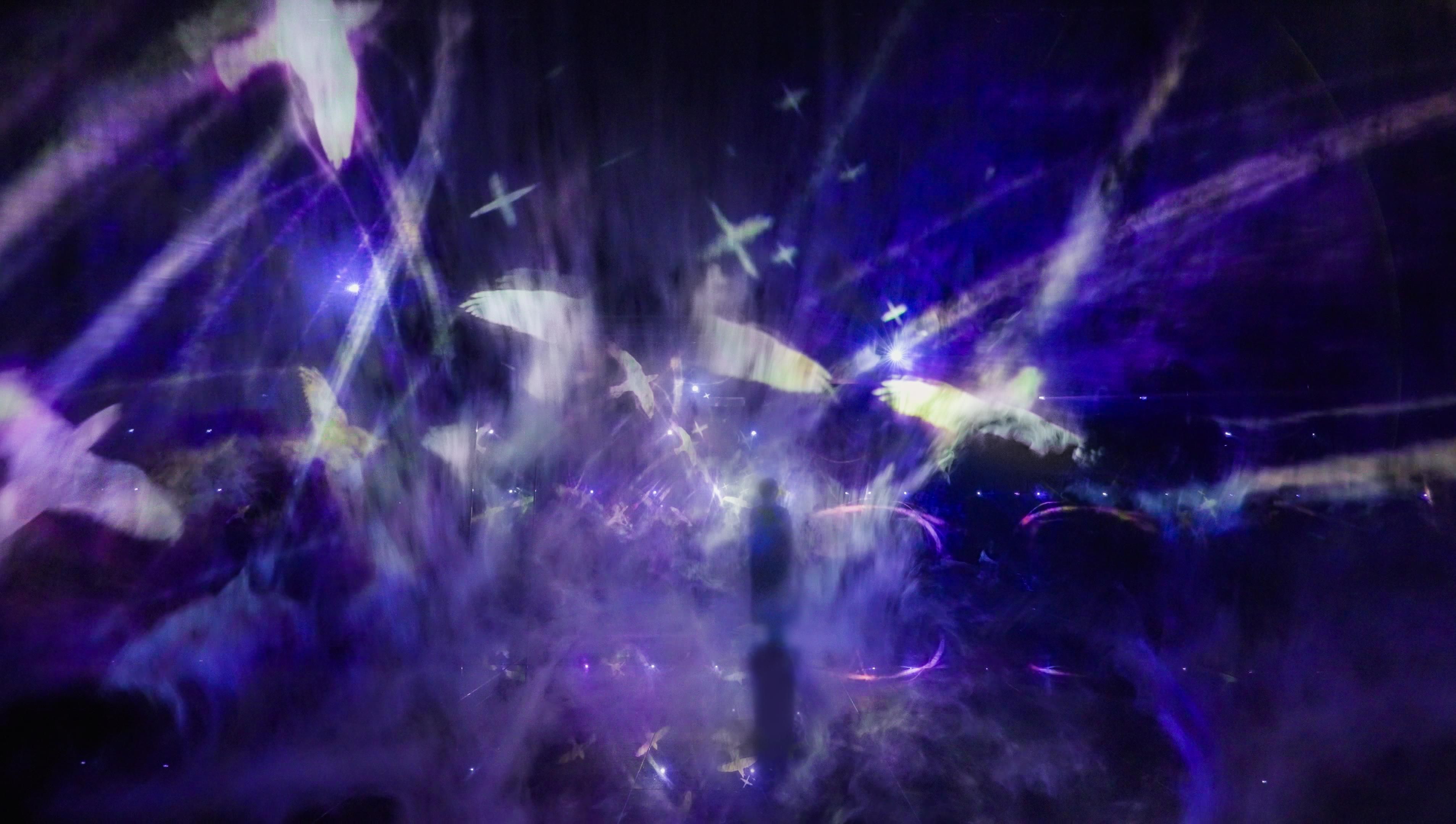 Flocks of mythical crows (Yatagarasu) rendered in light fly around the space leaving trails in their wake and forming Spatial Calligraphy. The chasing crows are eventually chased themselves, and form flowers when they crash into each other, scattering their petals.