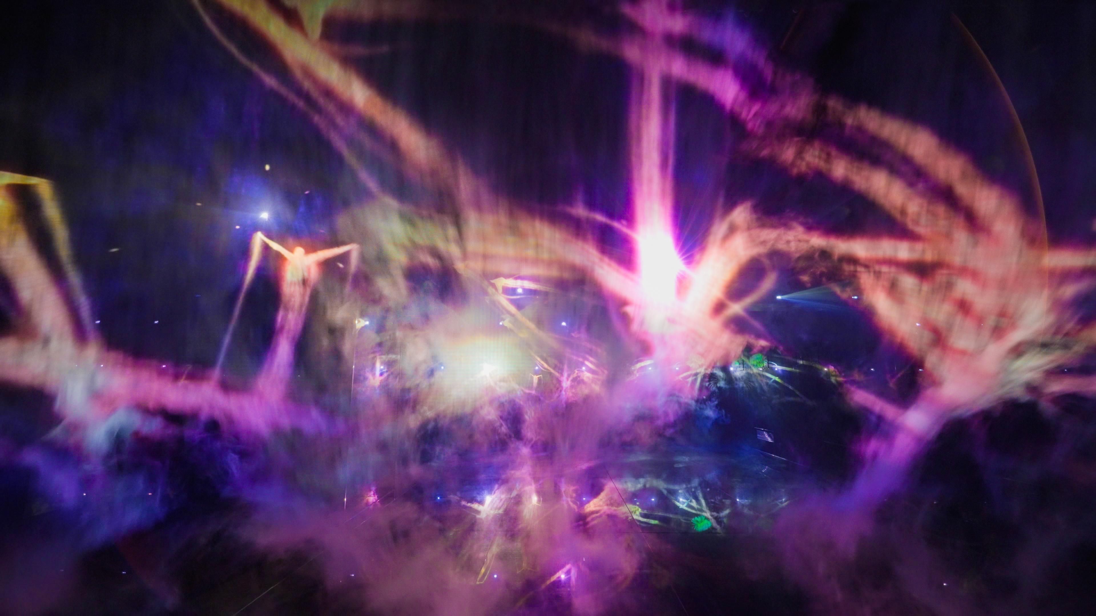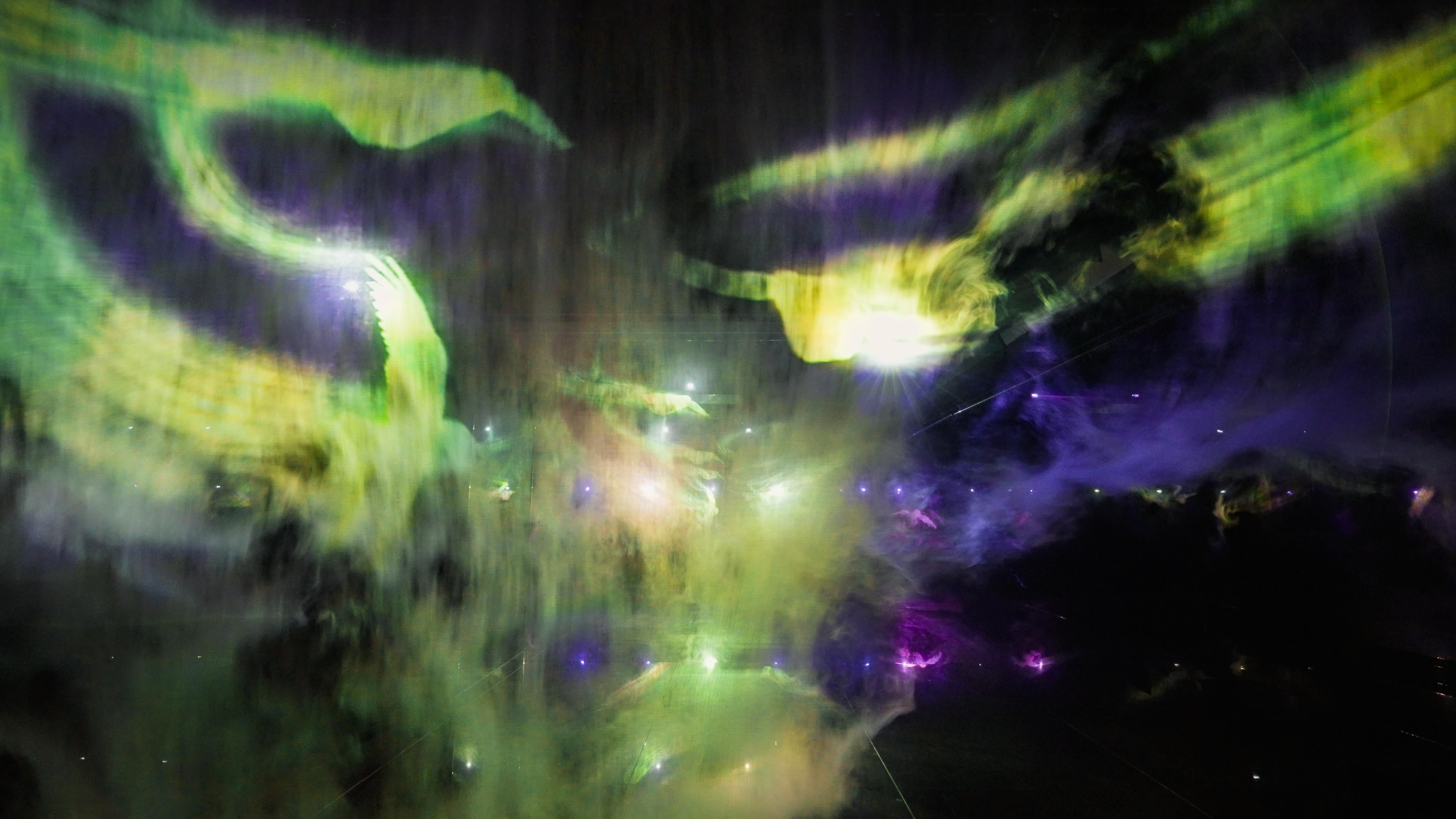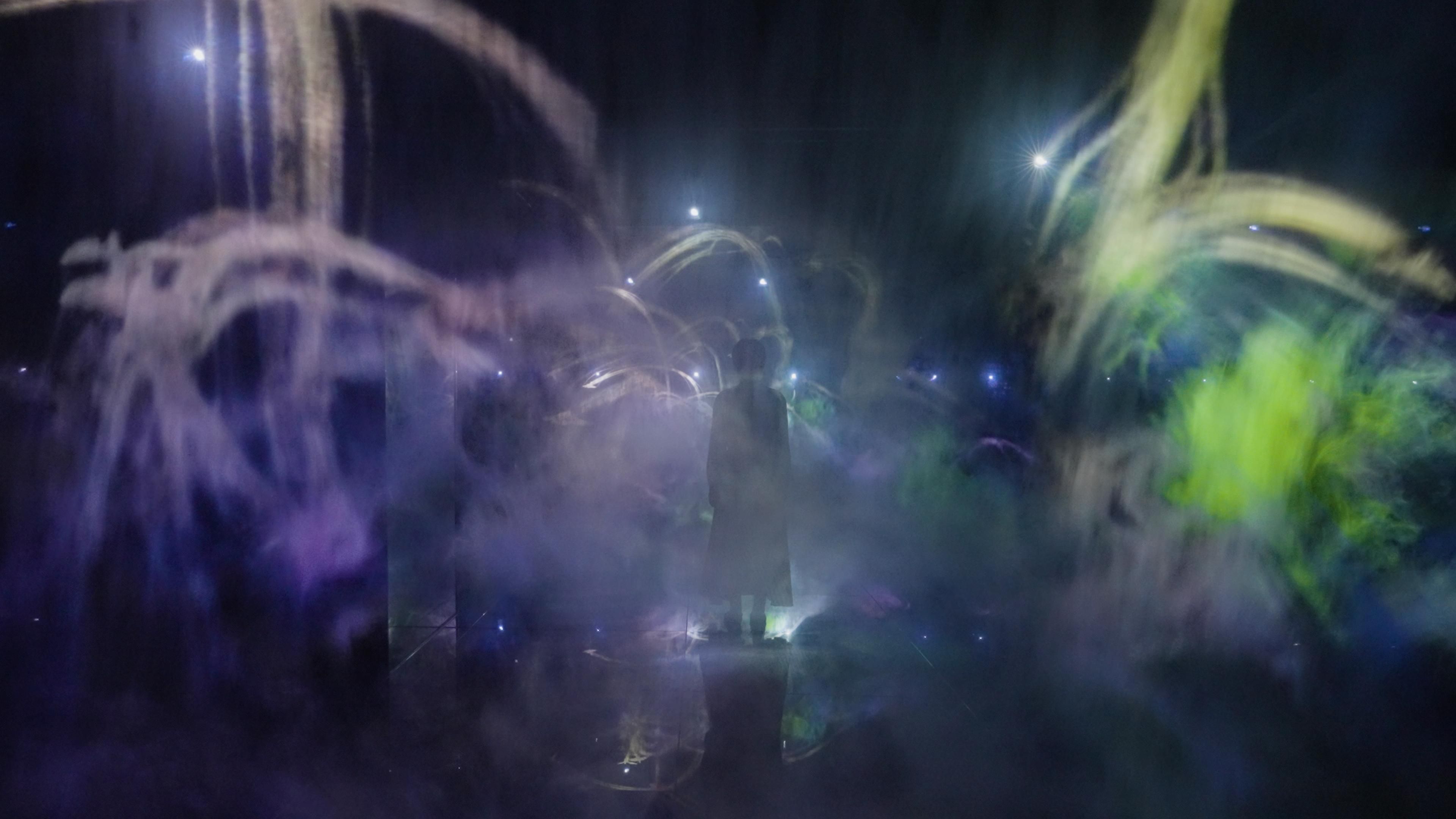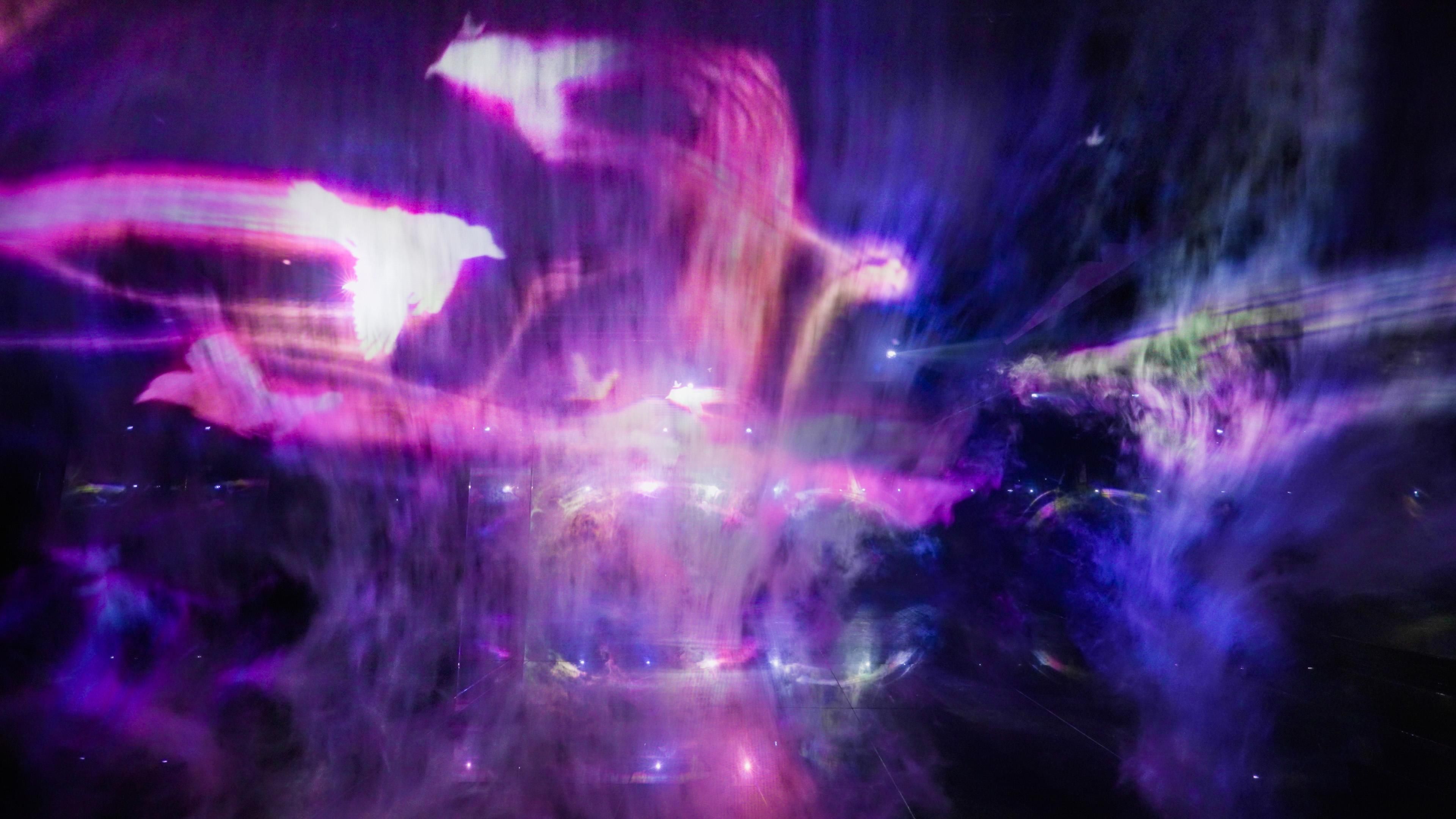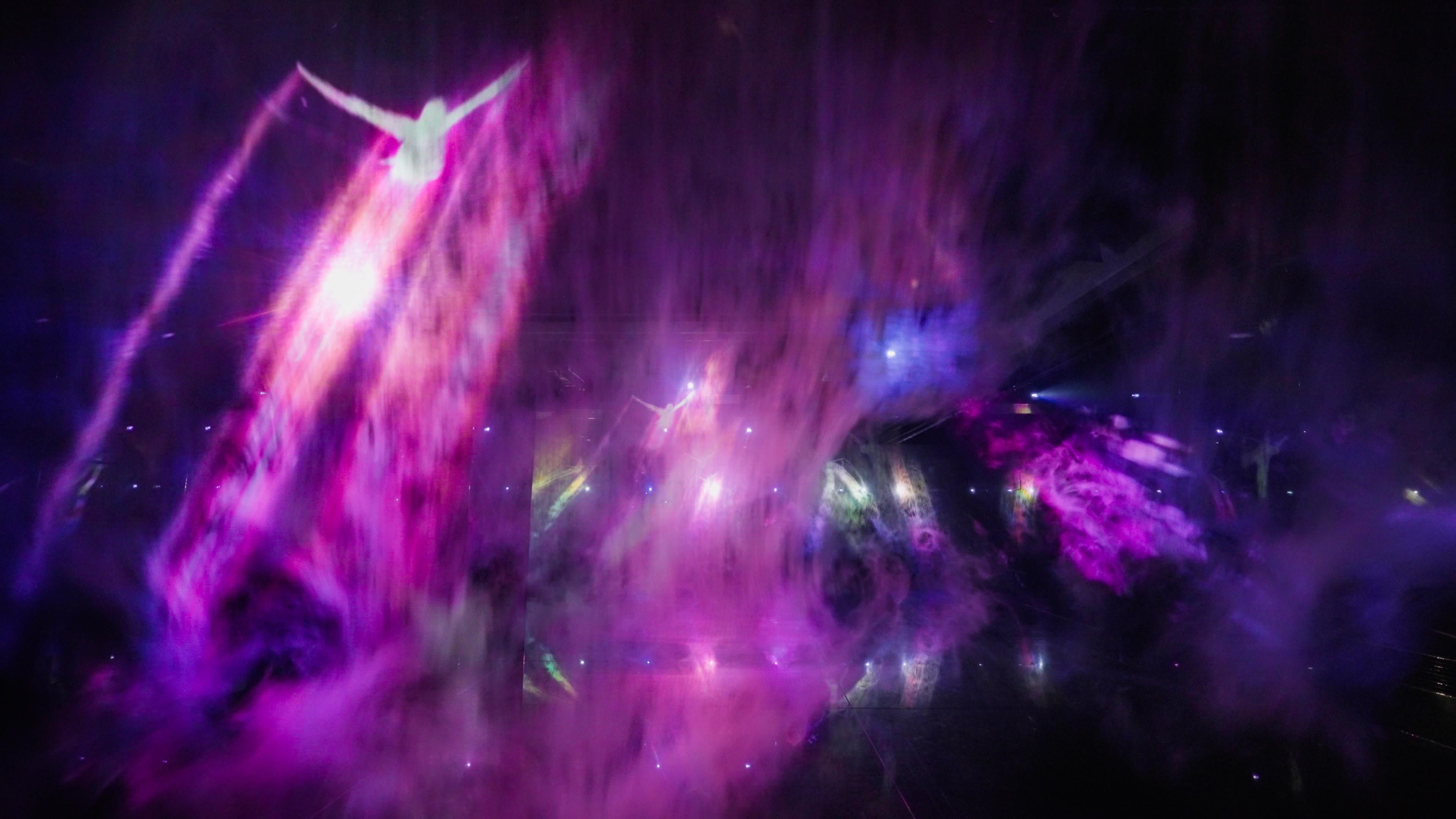 Flocks of mythical crows (Yatagarasu) rendered in light fly around the space leaving trails in their wake and forming Spatial Calligraphy. The chasing crows are eventually chased themselves, and form flowers when they crash into each other, scattering their petals.
