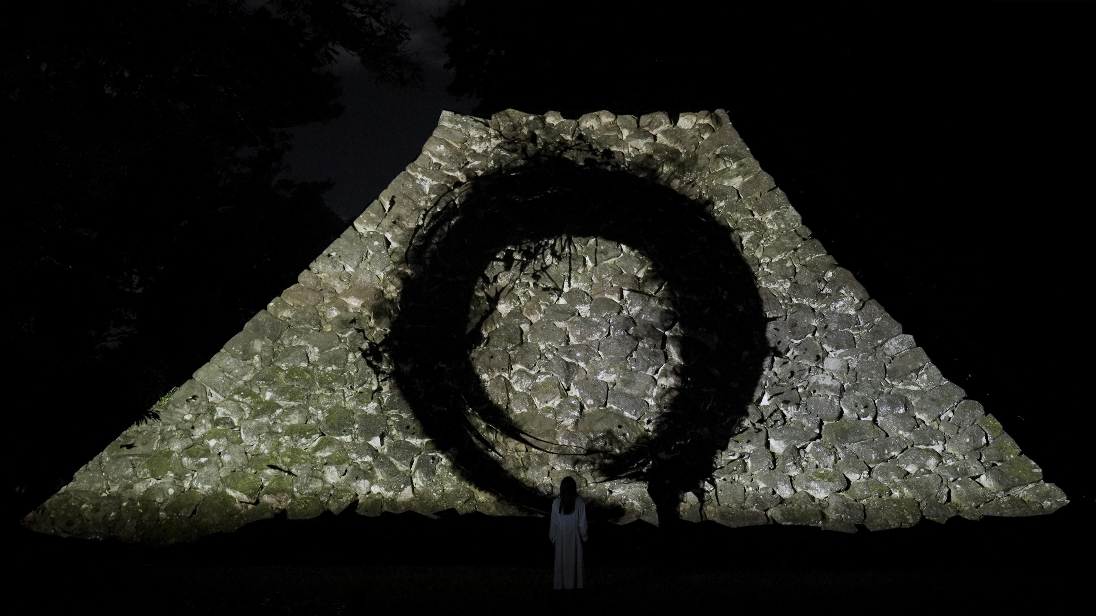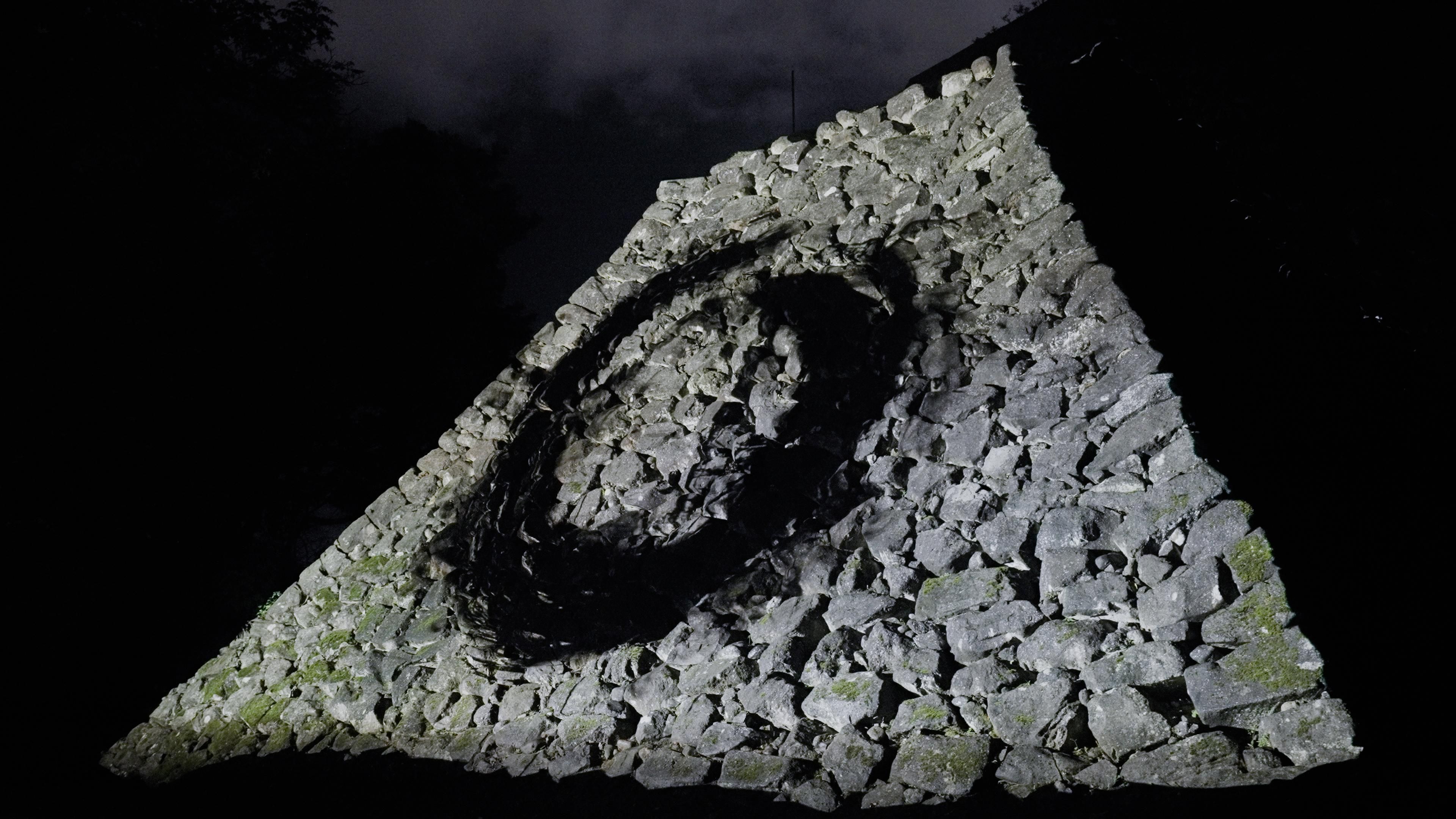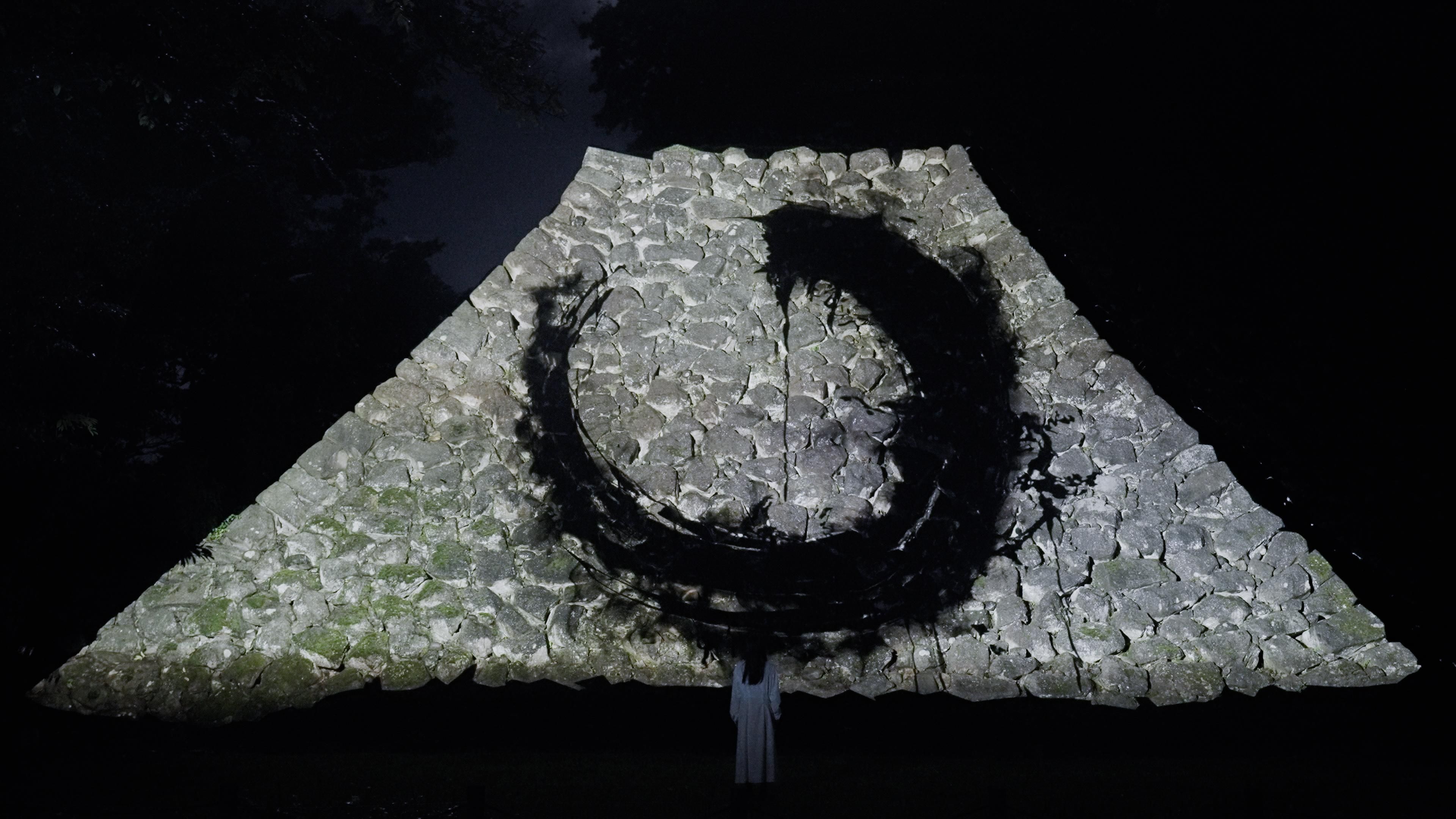 The black lines drawn with light express the absence of light, and cannot be distinguished from the shadows of the stone walls that have been weathered over the past several hundred years. The black calligraphy and the black shadows created by the long passing of time become one, infinitely drawing Enso on the stone walls.