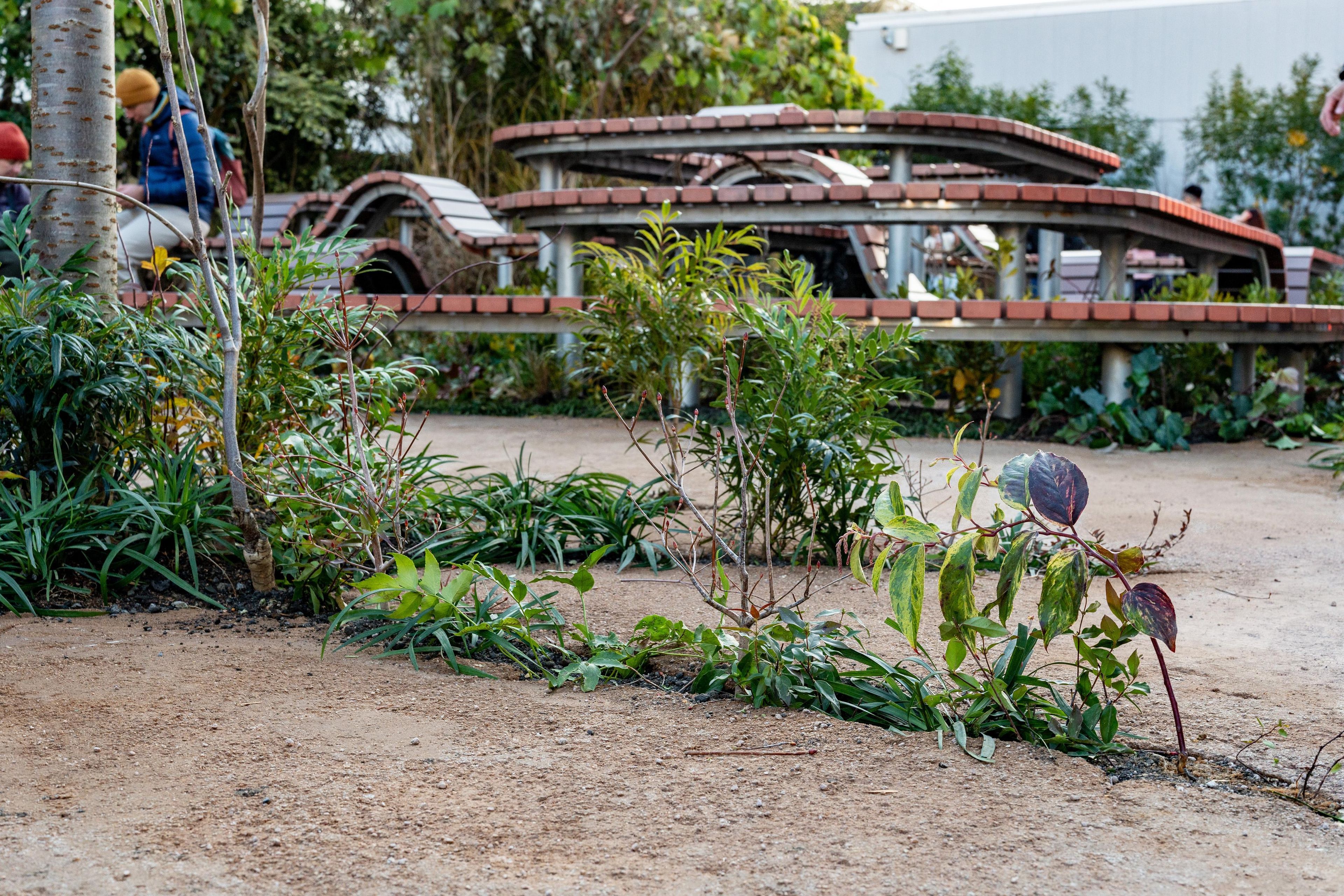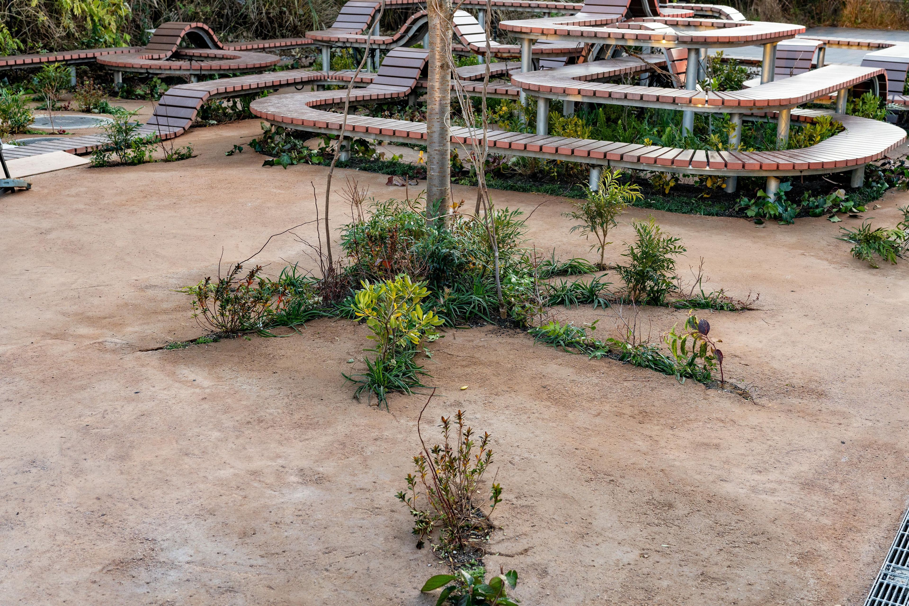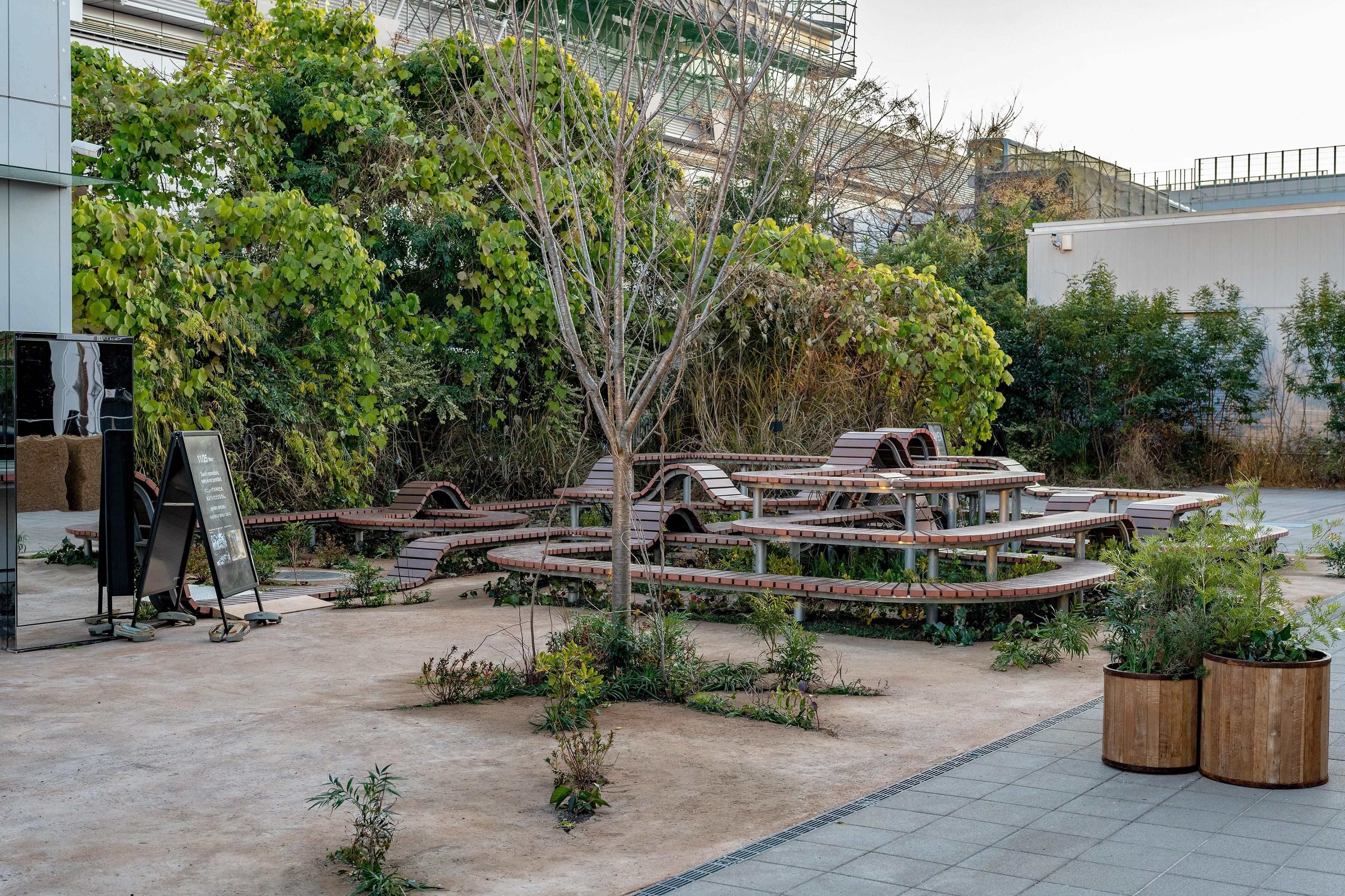 Within this group of pocket gardens, there is a single, continuous One Stroke Bench, formed from one continuous stroke. The continuous bench wraps around the building, and within the building, it functions as a counter. The bench and the building seamlessly connect, creating a landscape with organic continuity.