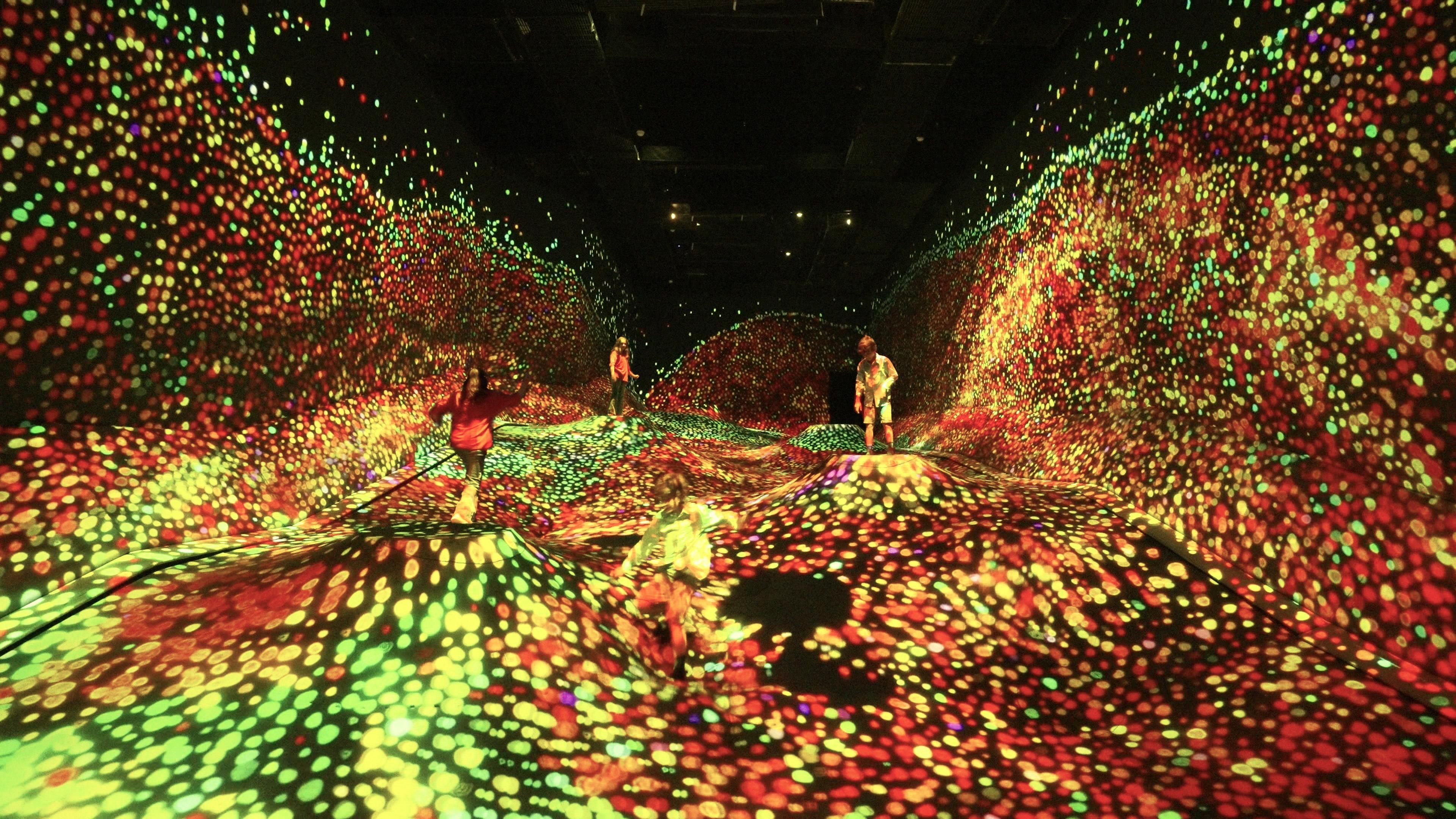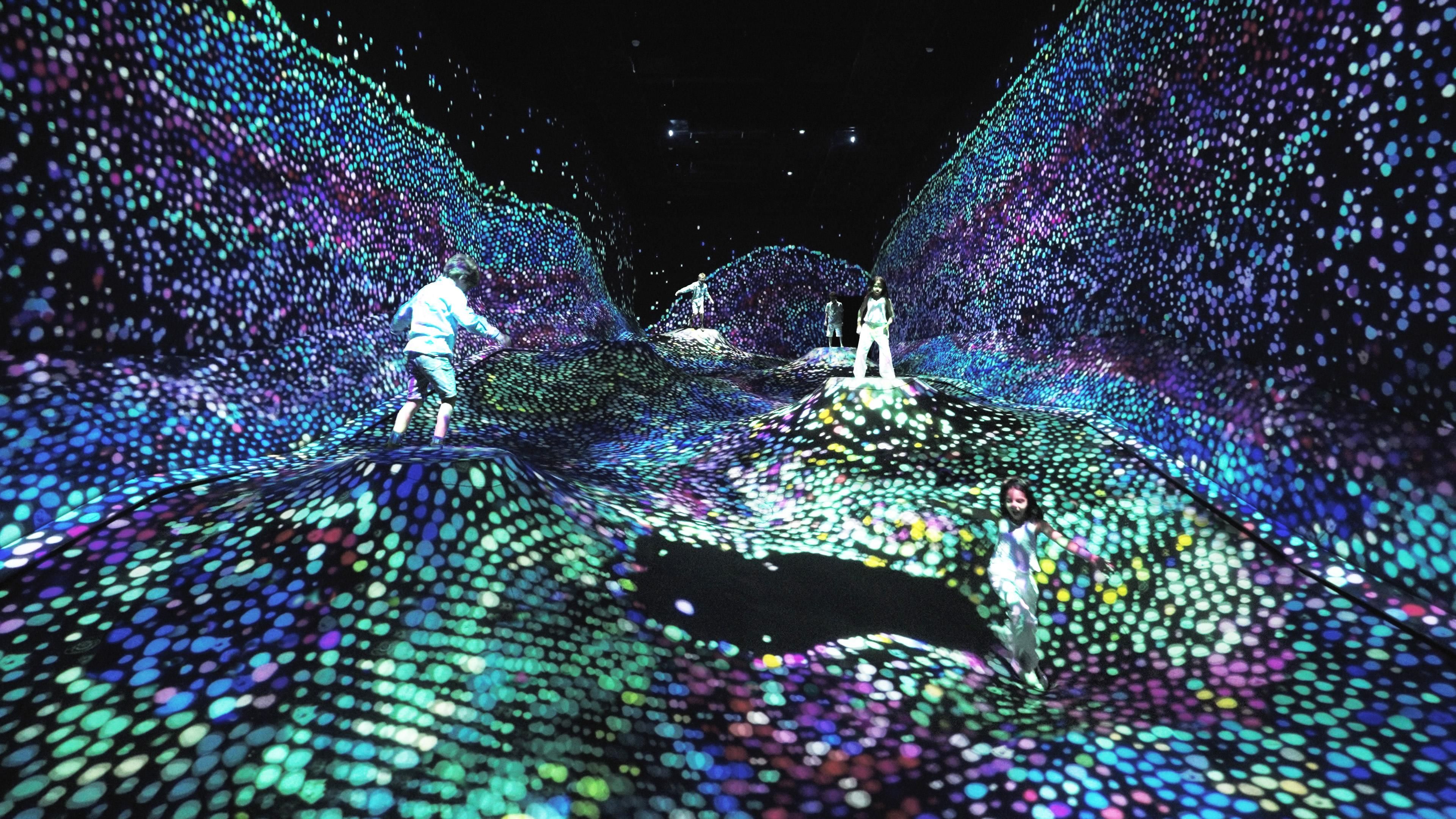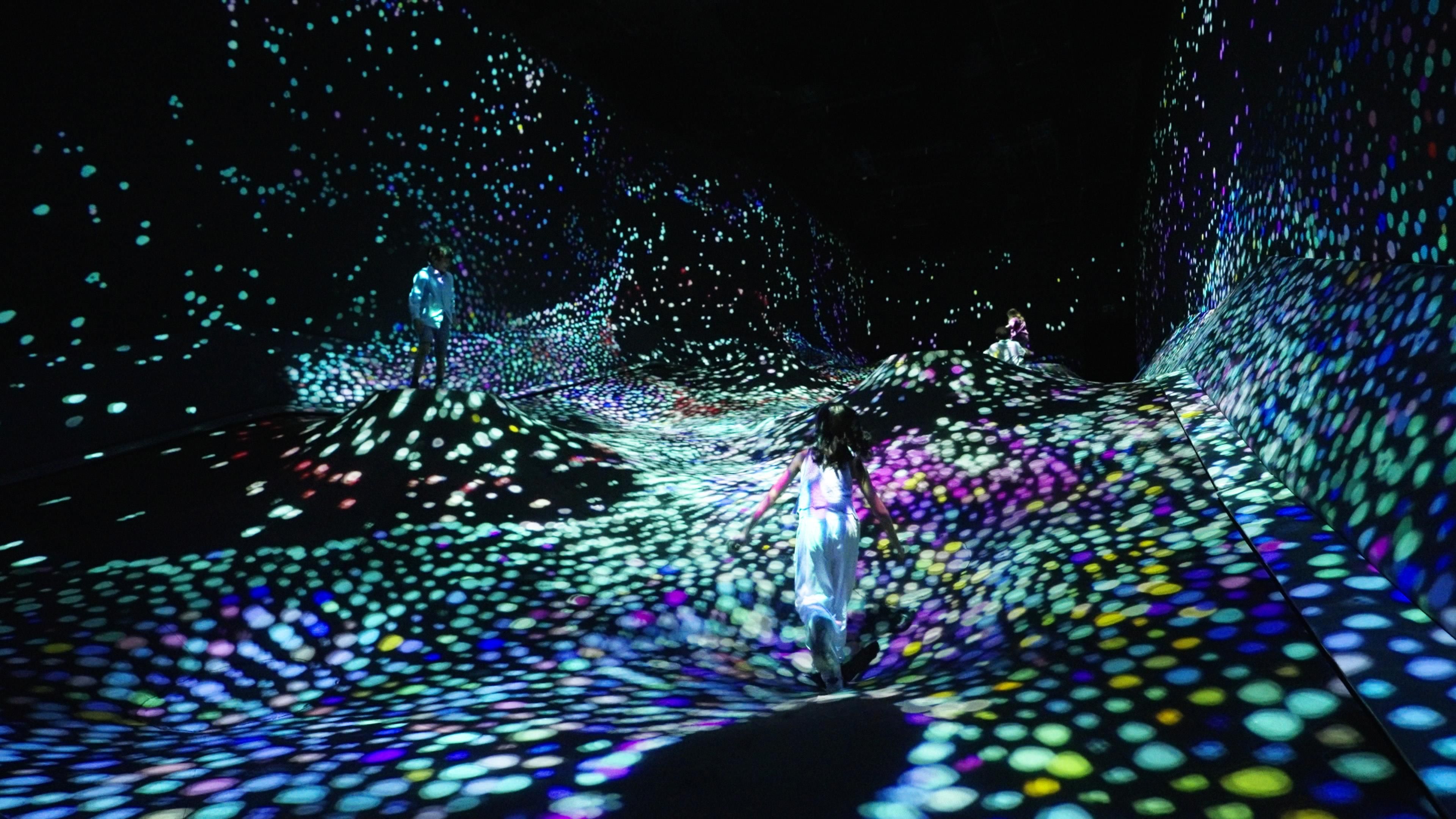 The ground sinks beneath people, and granules of light gather in these sunken areas. As people walk, the granules burst out and intermix, changing the stratum pattern.