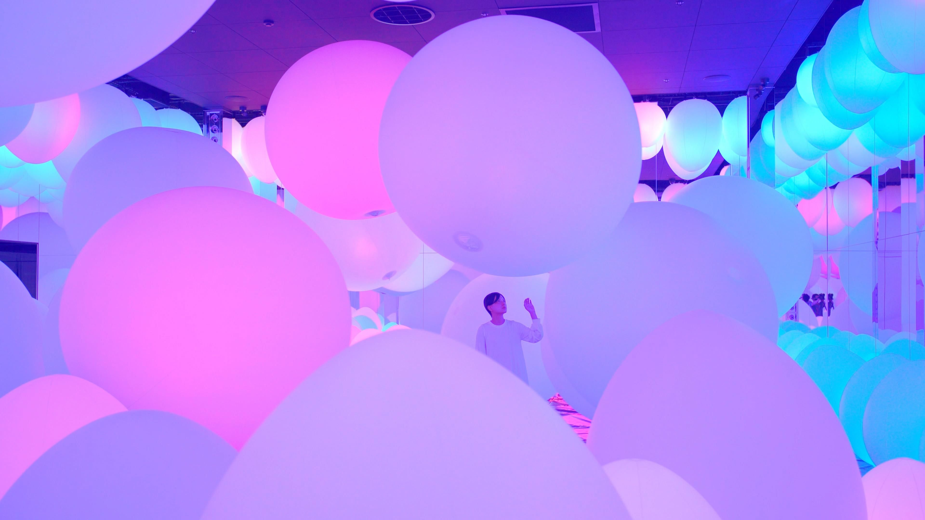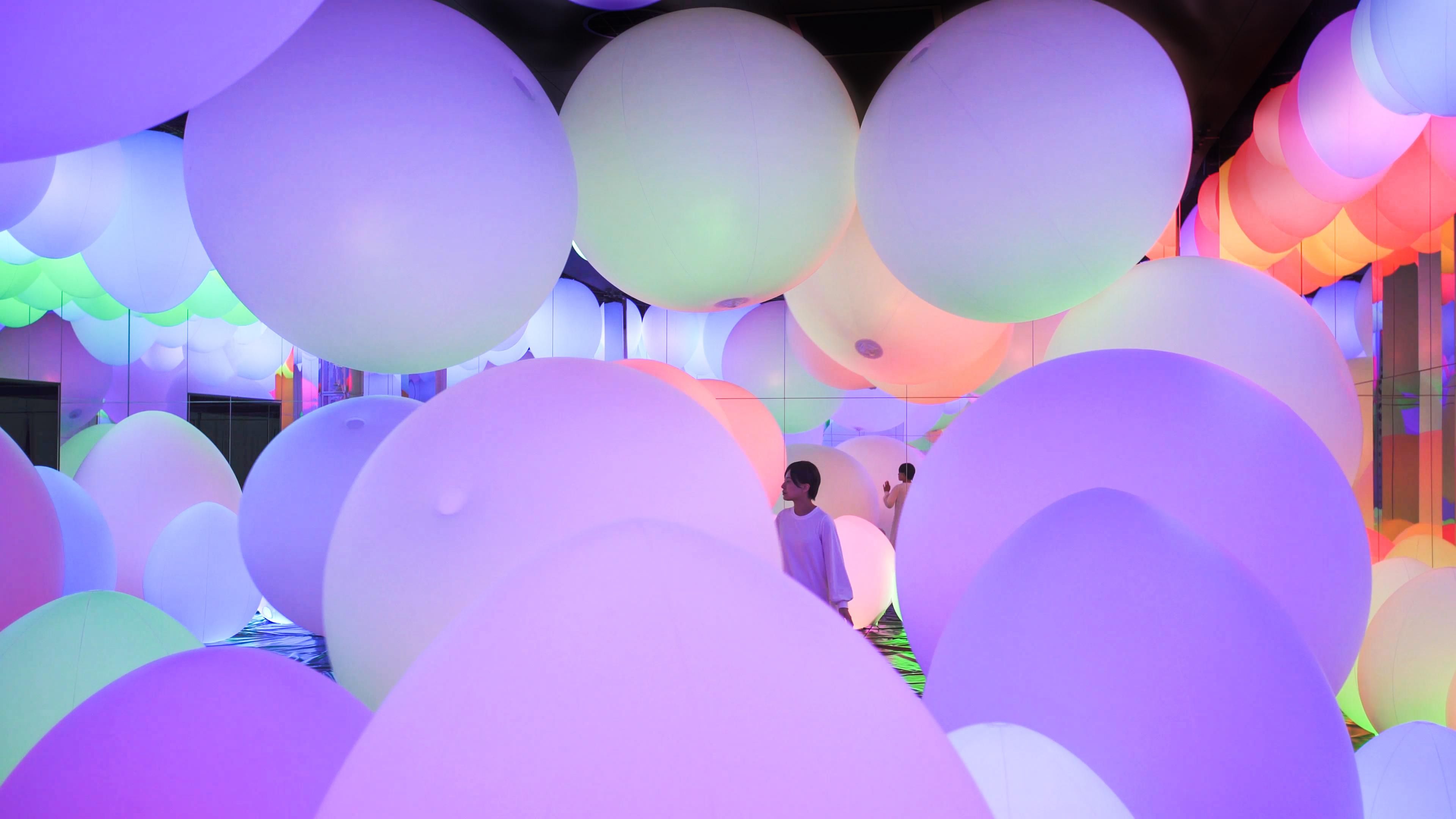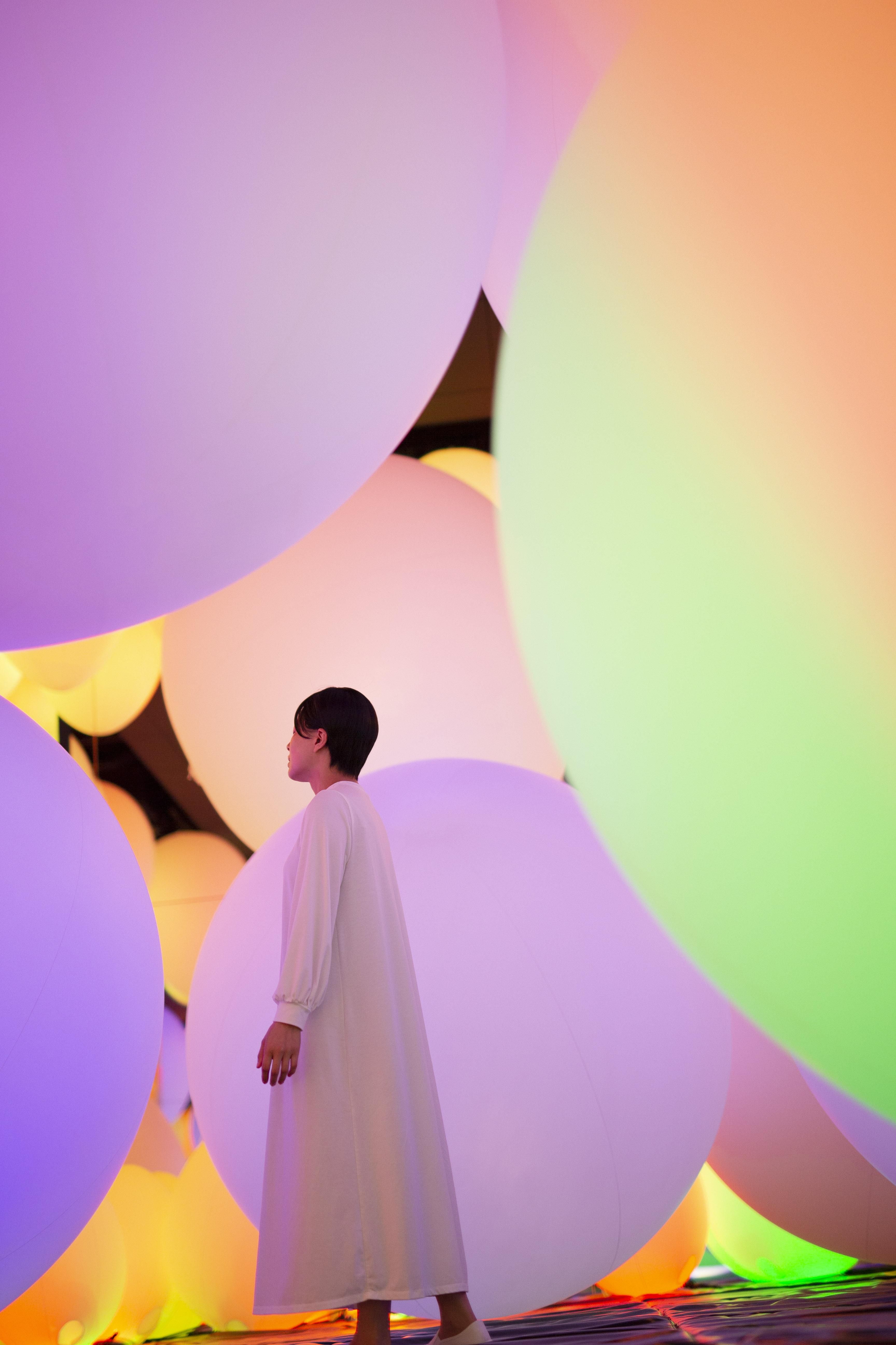 Typhoon Light Balls are a group of giant balls that float, sink, and continuously turn. When they are pushed by a person or receive an impact, they change color and produce a tone unique to that color. The surrounding spheres respond one after another, changing to the same color and sounding the same tone in succession.