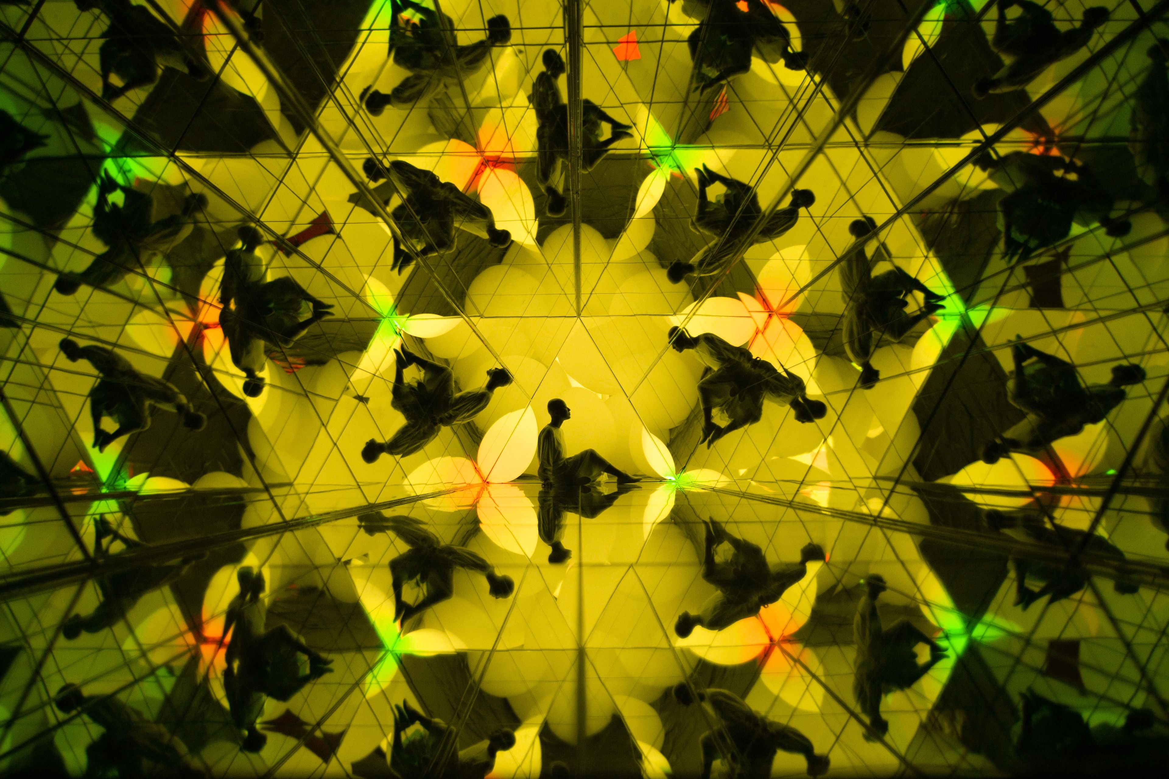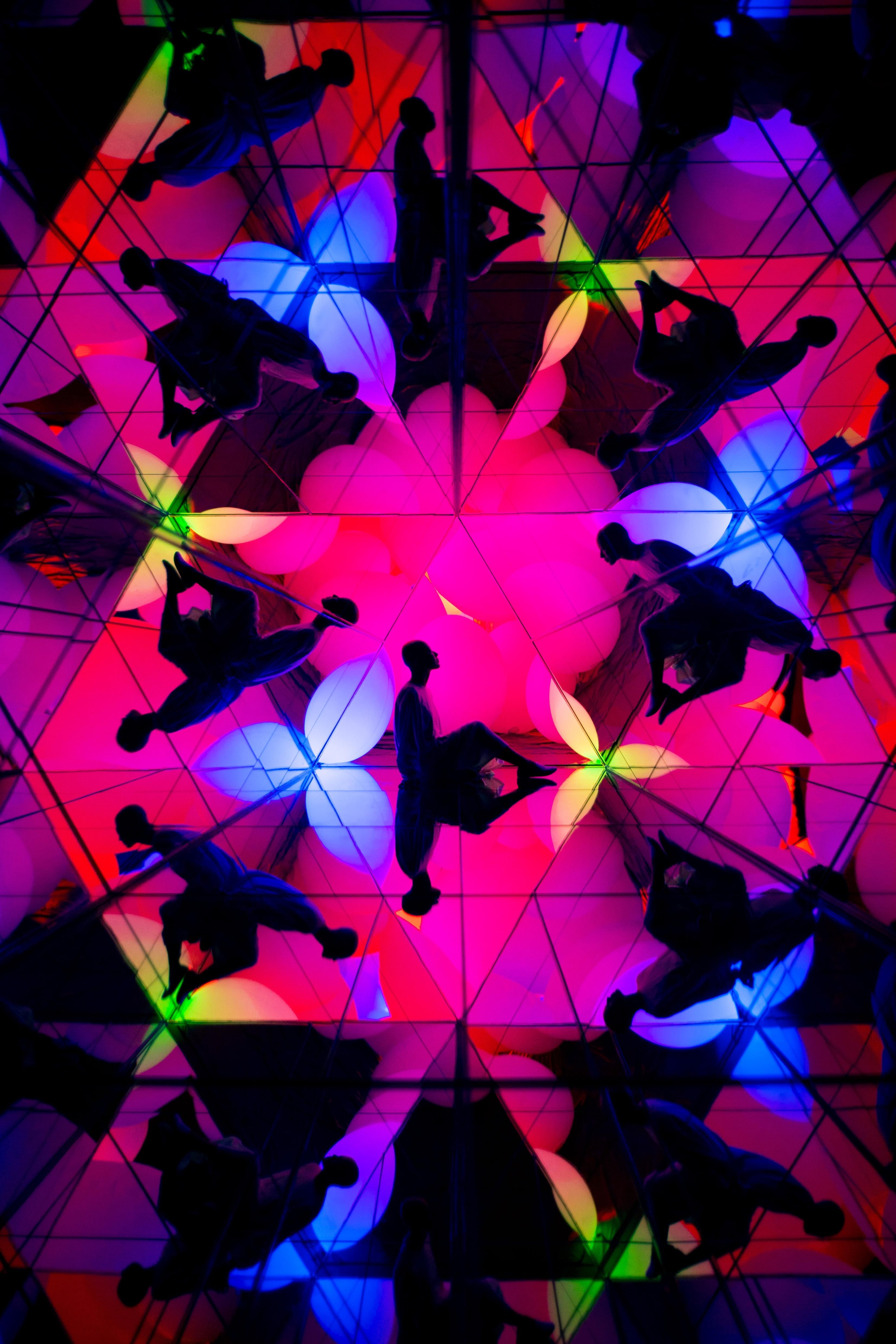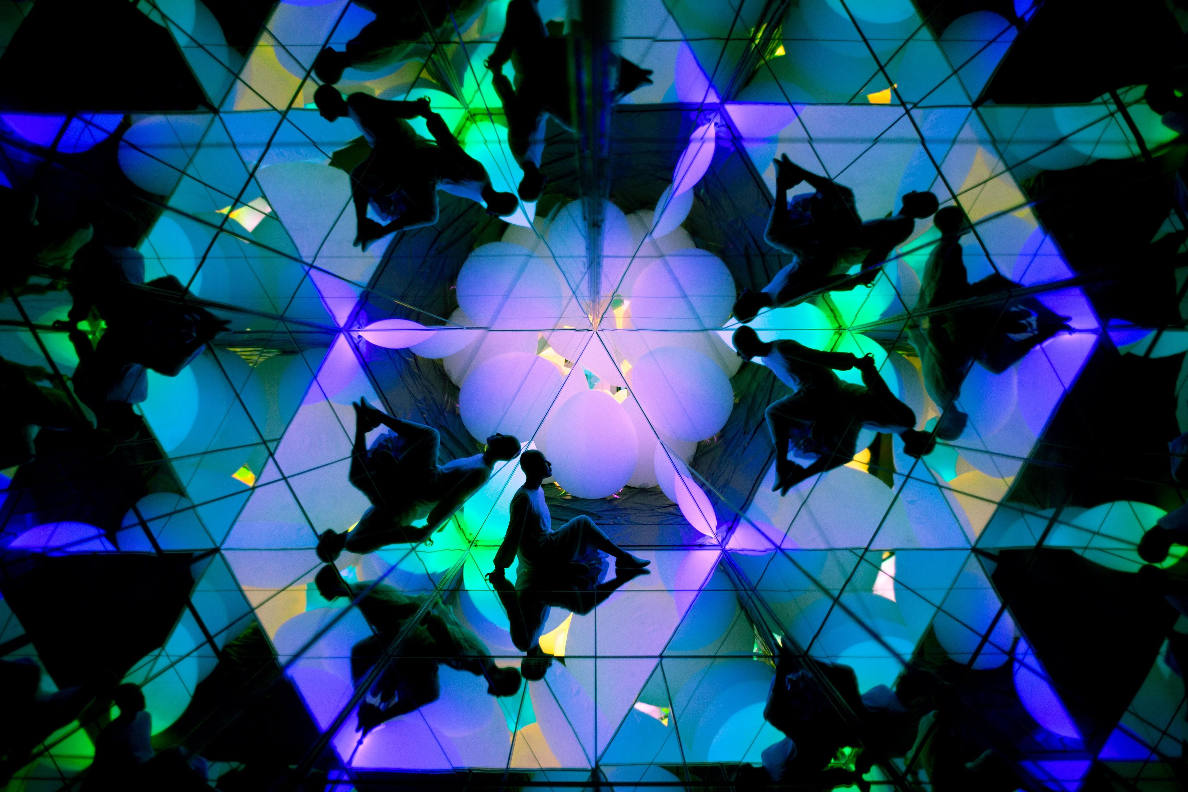 Typhoon Light Balls are a group of giant balls that float, sink, and continuously turn. When they are pushed by a person or receive an impact, they change color and produce a tone unique to that color. The surrounding spheres respond one after another, changing to the same color and sounding the same tone in succession.