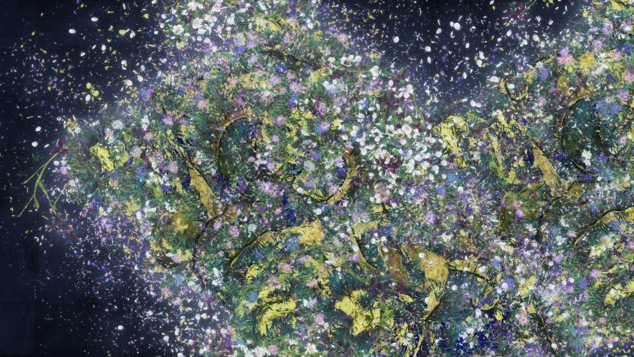 This one appears across four digital monitors hung together as panels, with a sensor on the floor that picks up movement. As the viewer approaches, flowers start to release tiny petals in a swirling snowstorm effect, and gradually bright patches appear on the screen, like a glowing galaxy of stars. The flowers in these patches wither and die before regenerating. Complex programming algorithms responding to the sensors mean the artwork is never the same.