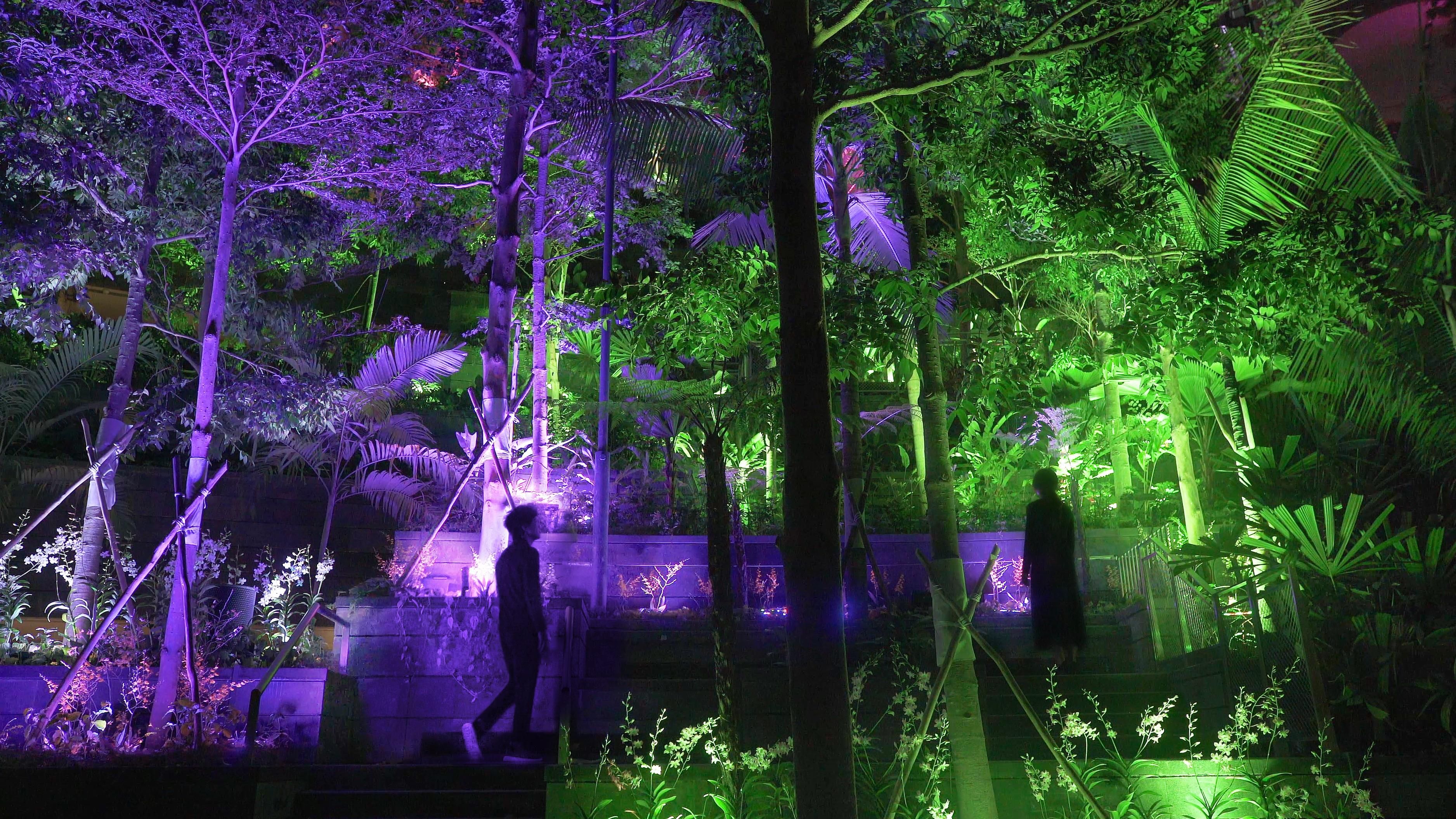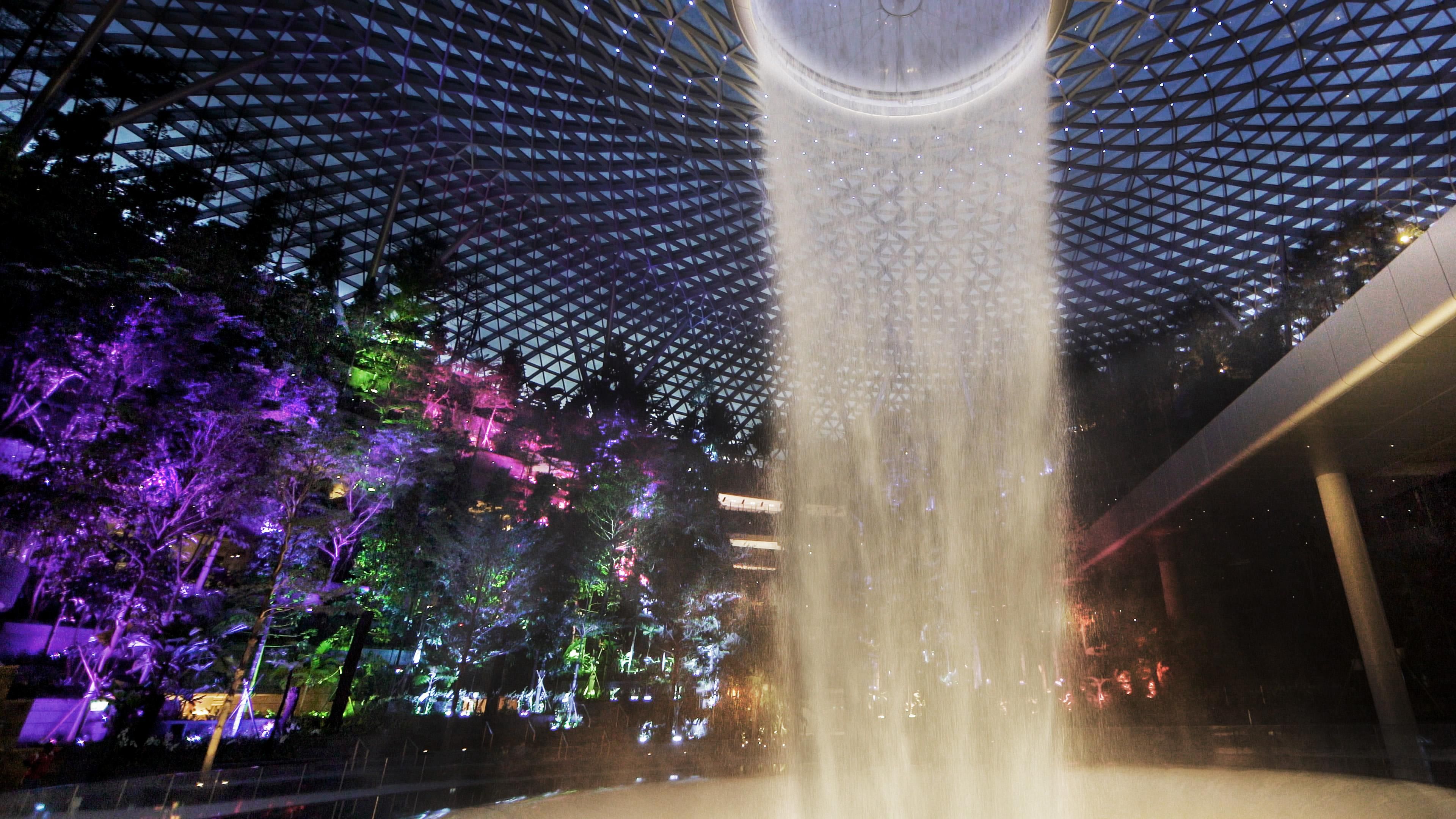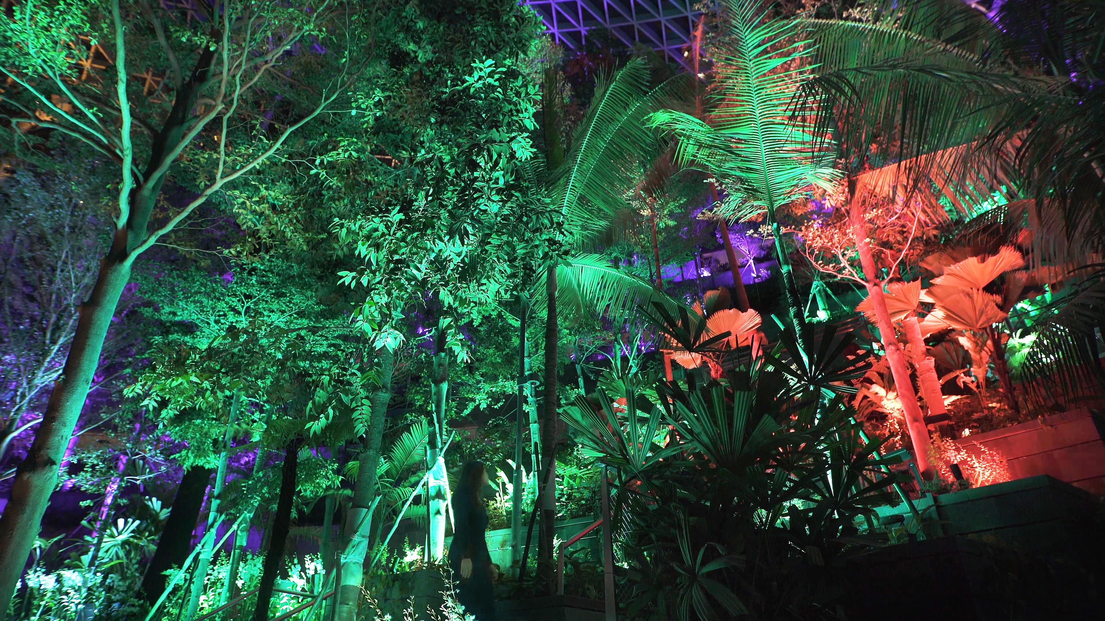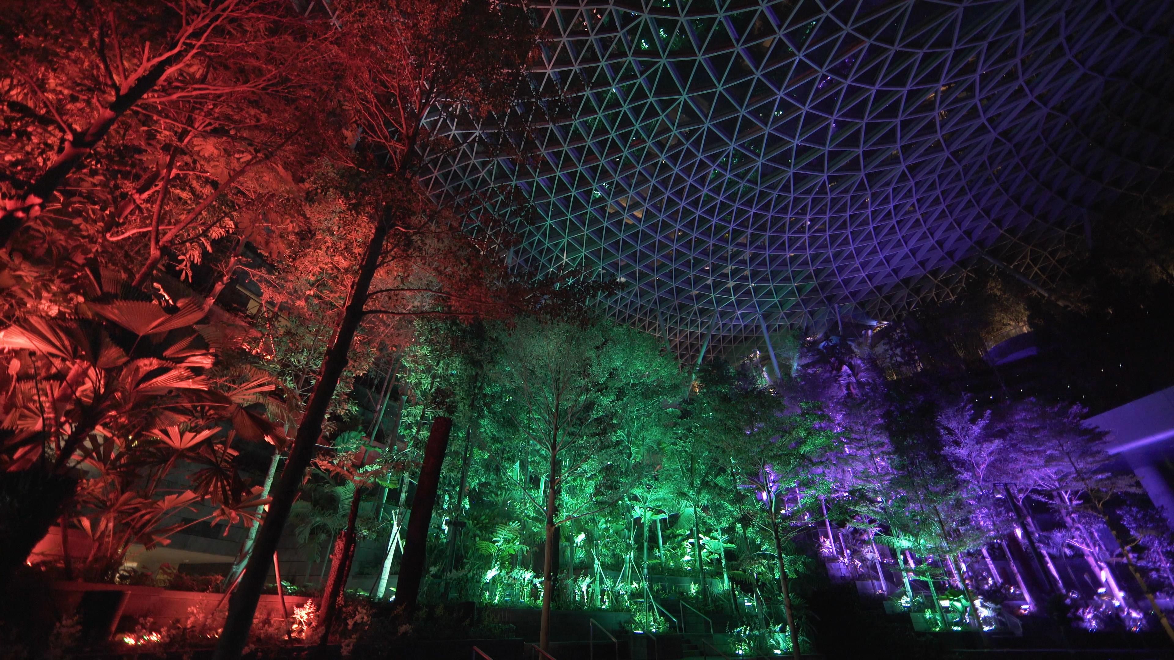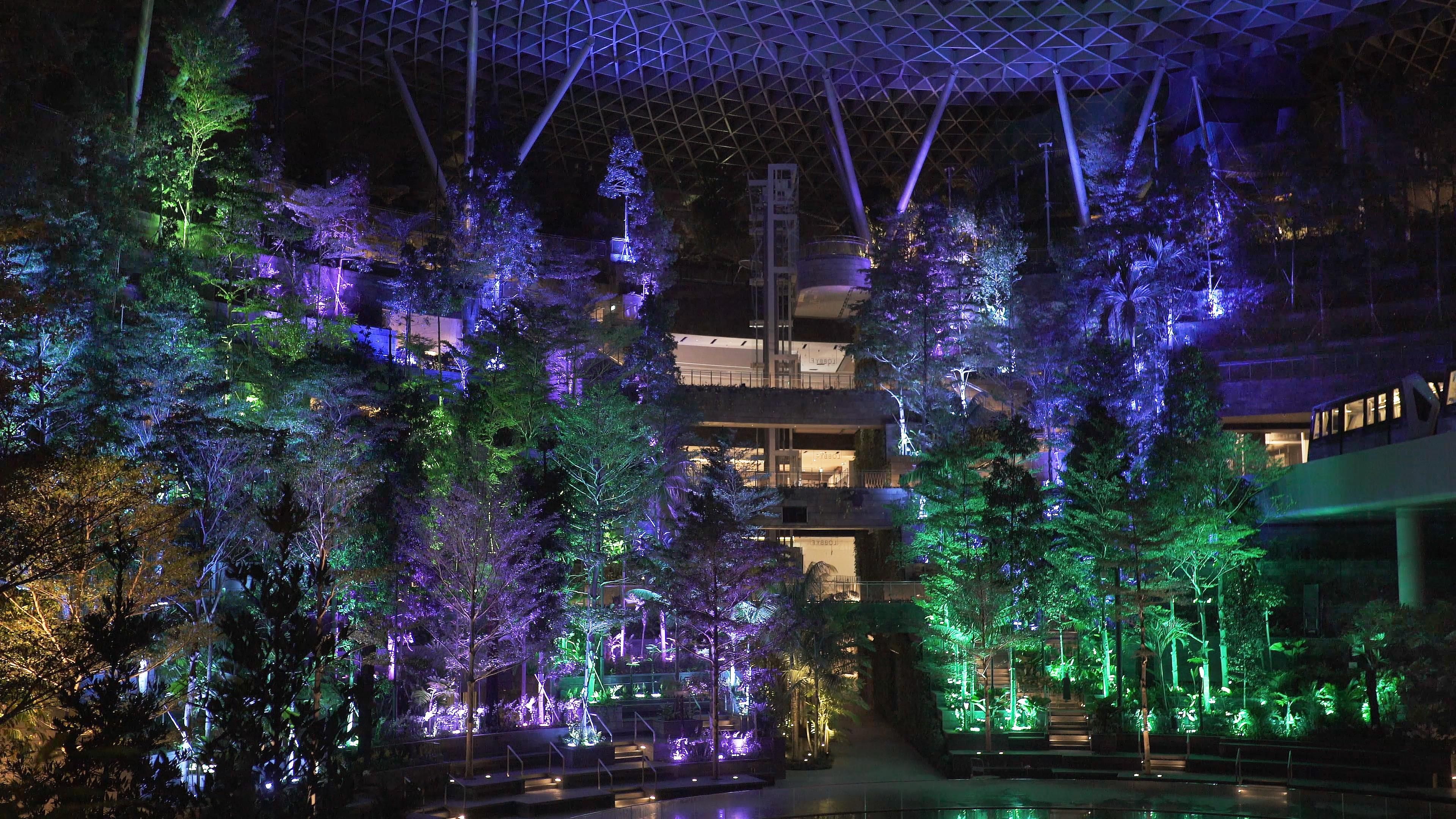 The trees of the Shiseido Forest Valley at Jewel Changi Airport shine brightly. Each tree’s light is autonomous, shining brightly and then fading as if it’s breathing.