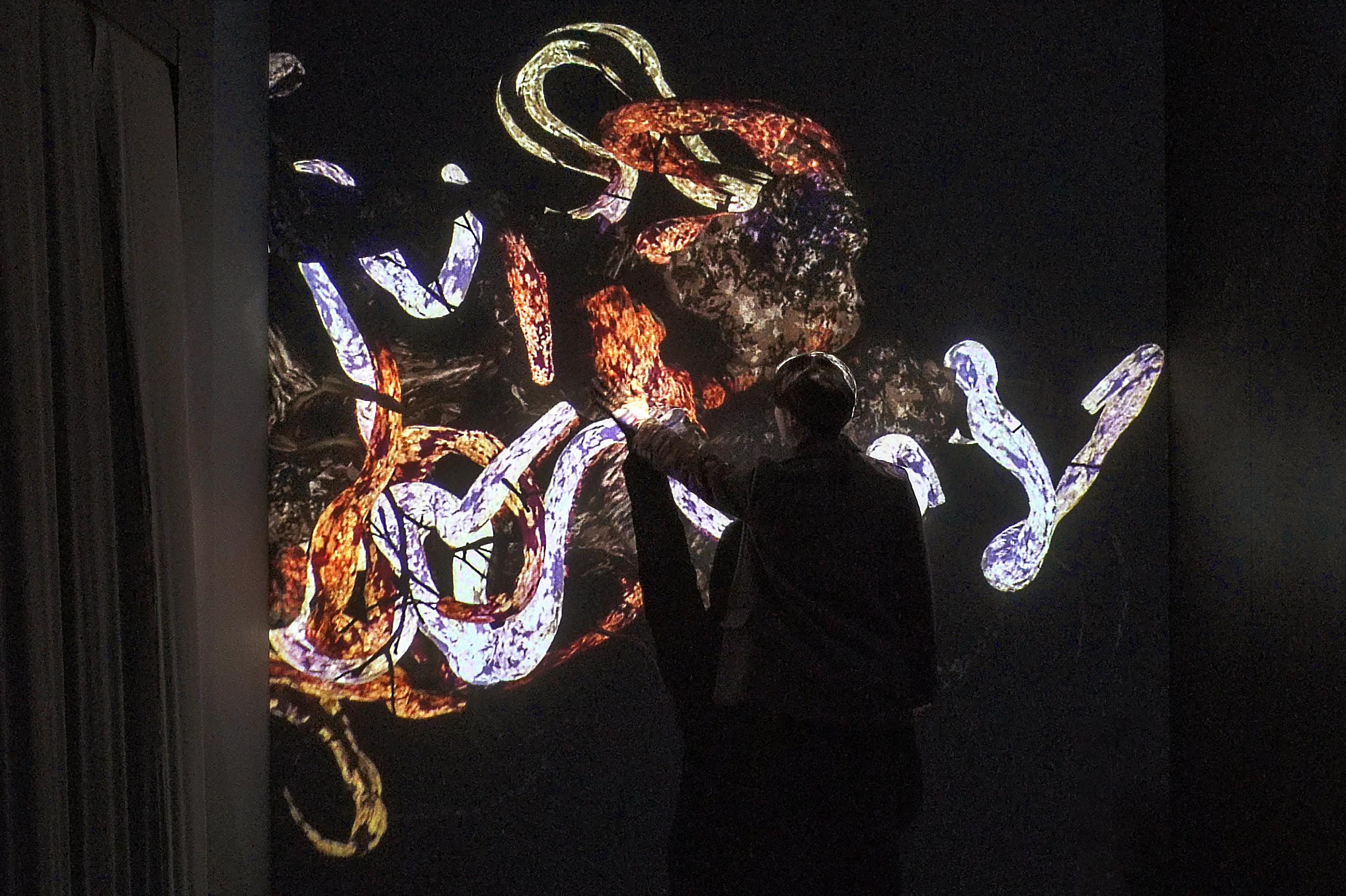 The rock mass leaves the space, floats through the passage, and sinks into the wall. The sinking part transcends physical space and appears in a Borderless World in another part of the world.