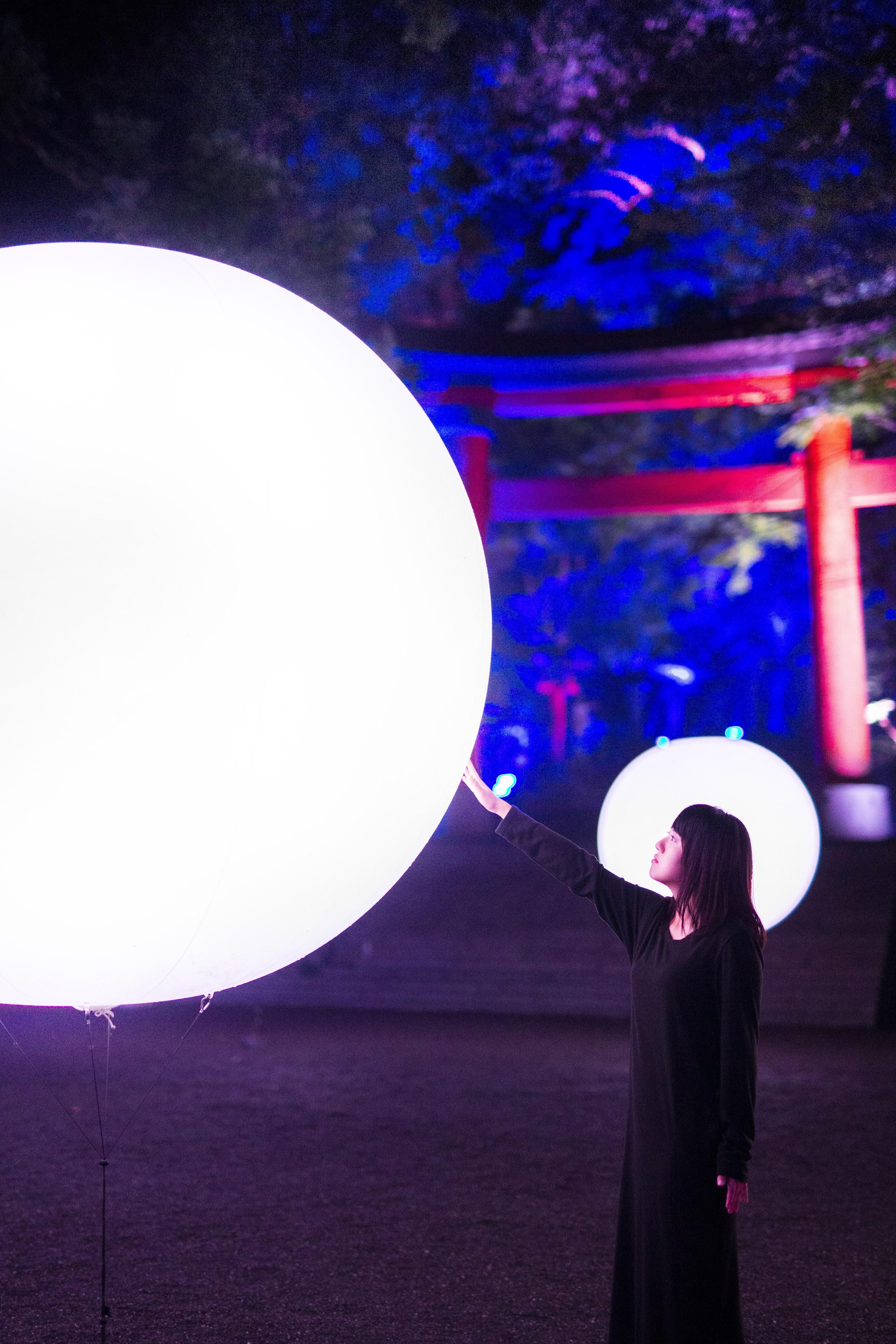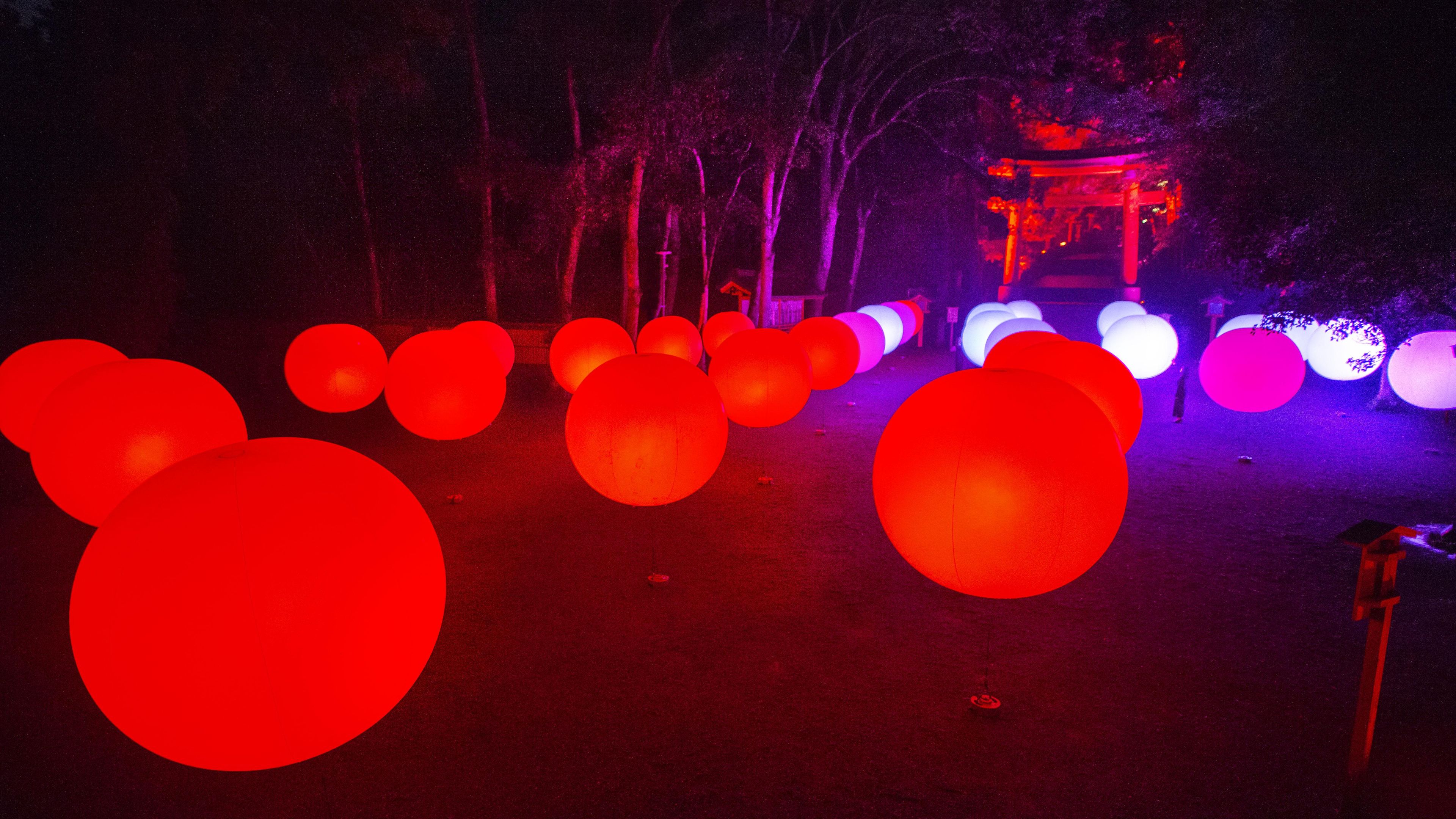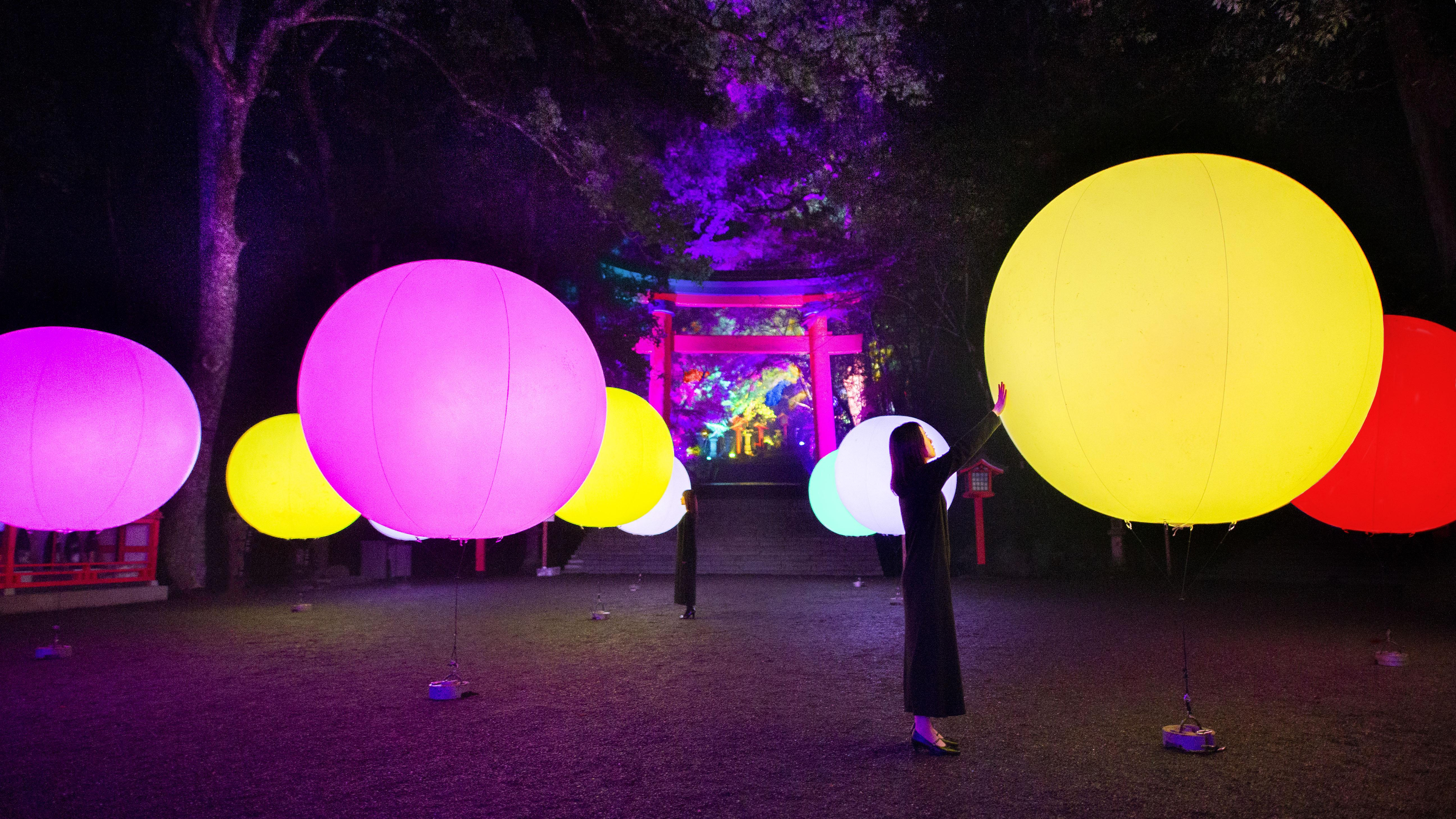 In teamLab: Digitized Usa Shrine, Floating, Resonating Spheres and Resonating Trees are on display. The forest surrounding the grounds and the path leading to the shrine are transformed into an interactive digital art space that changes due to the presence of people.