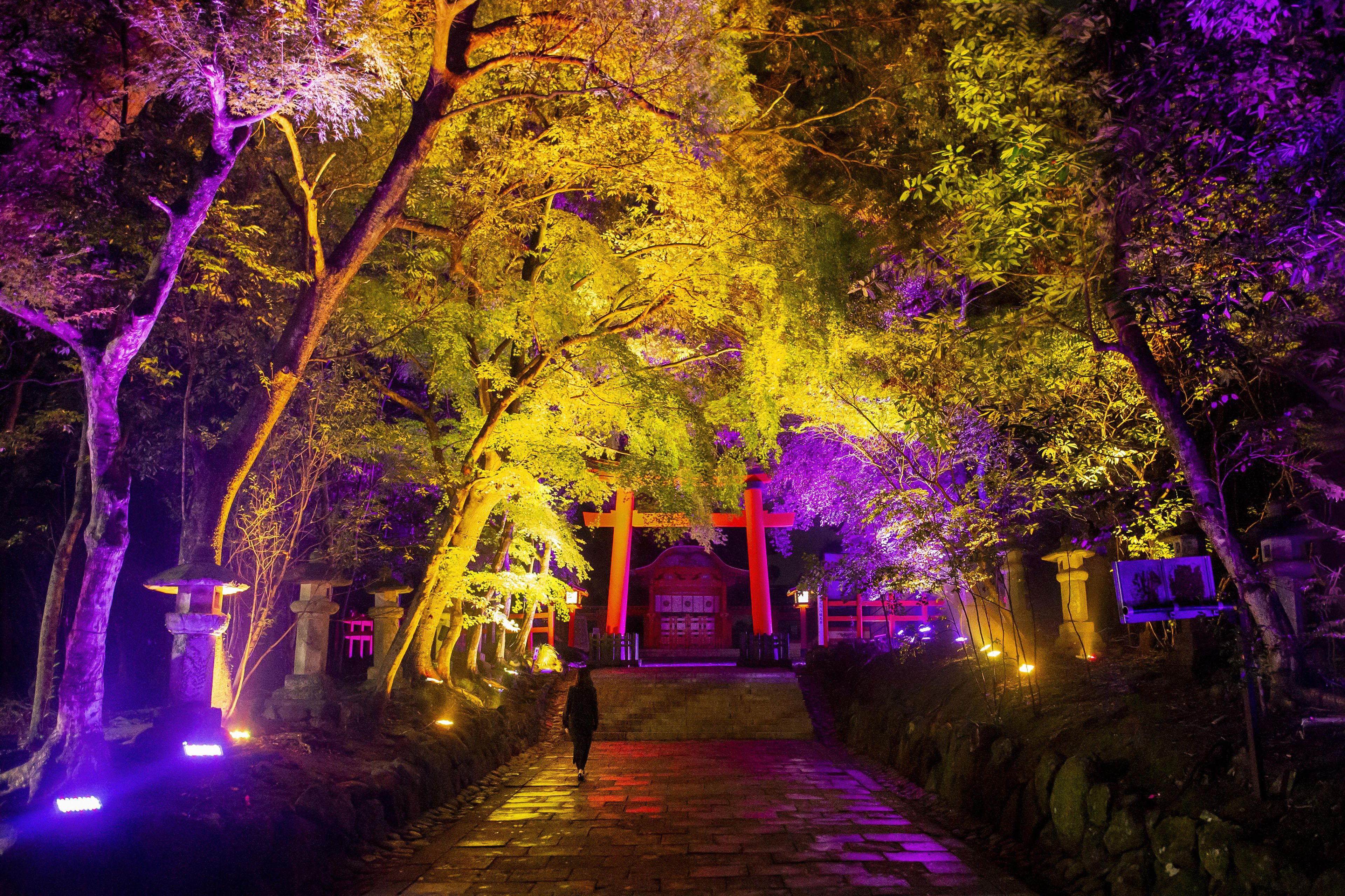 大分県宇佐市の宇佐神宮境内を光のアートで彩るイベント「光の祭 Art by teamLab(アート・バイ・チームラボ)」が開かれている。7日まで。(Excerpt from the text)