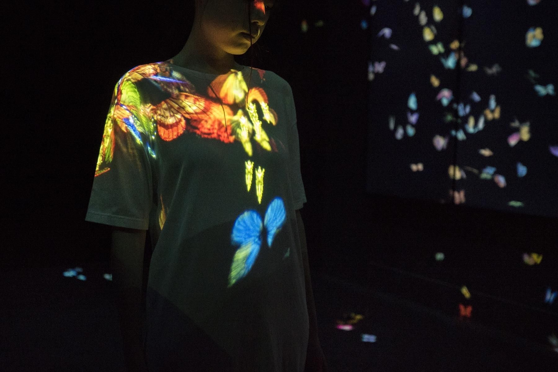 When people enter the space and stand still, butterfly chrysalises appear on their body, and butterflies emerge and fly from their feet. The artwork is born from a person, but they themselves may not realize it. Instead, they will notice the butterflies being born on other people before realizing that they too are creating the artwork.