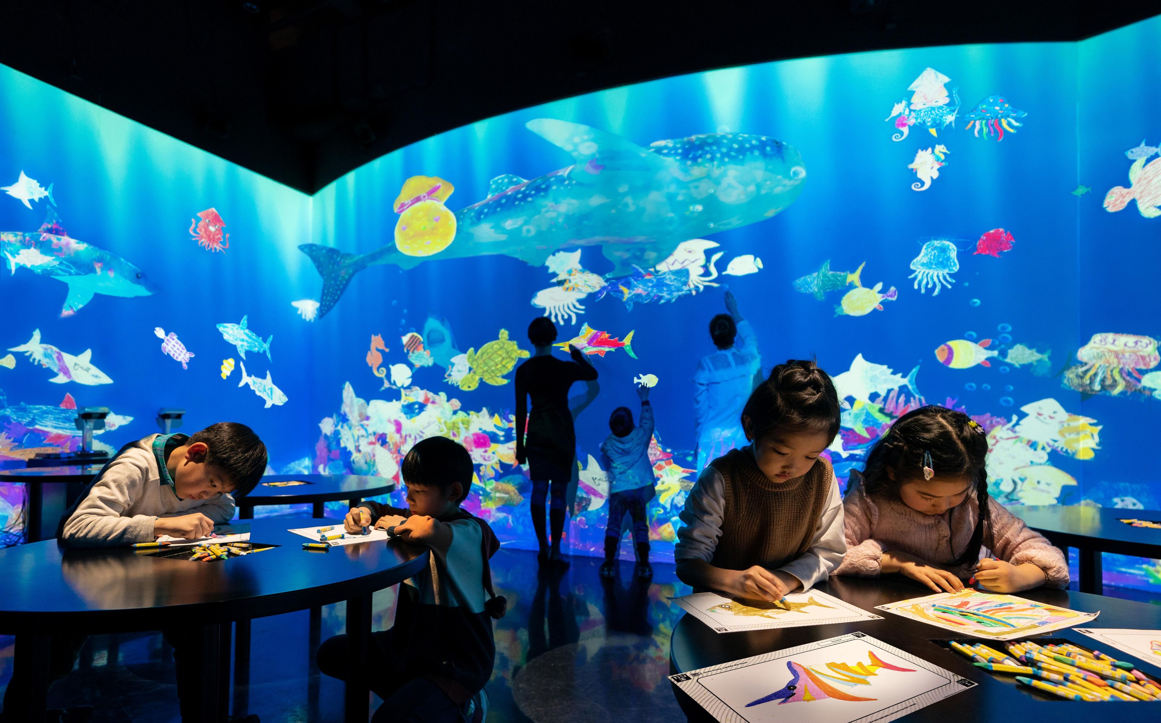 All the various fish drawn by everyone swim around in this ocean.