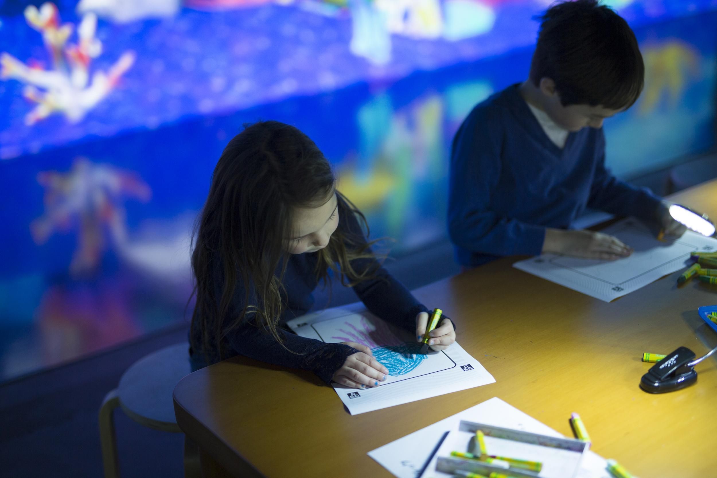 Color in a fish on the paper provided and see the picture you have colored come to life, swimming out into the ocean in front of you together with fish drawn by other people. If you touch the fish, they will swim away. You can also feed the fish by touching the food bags.