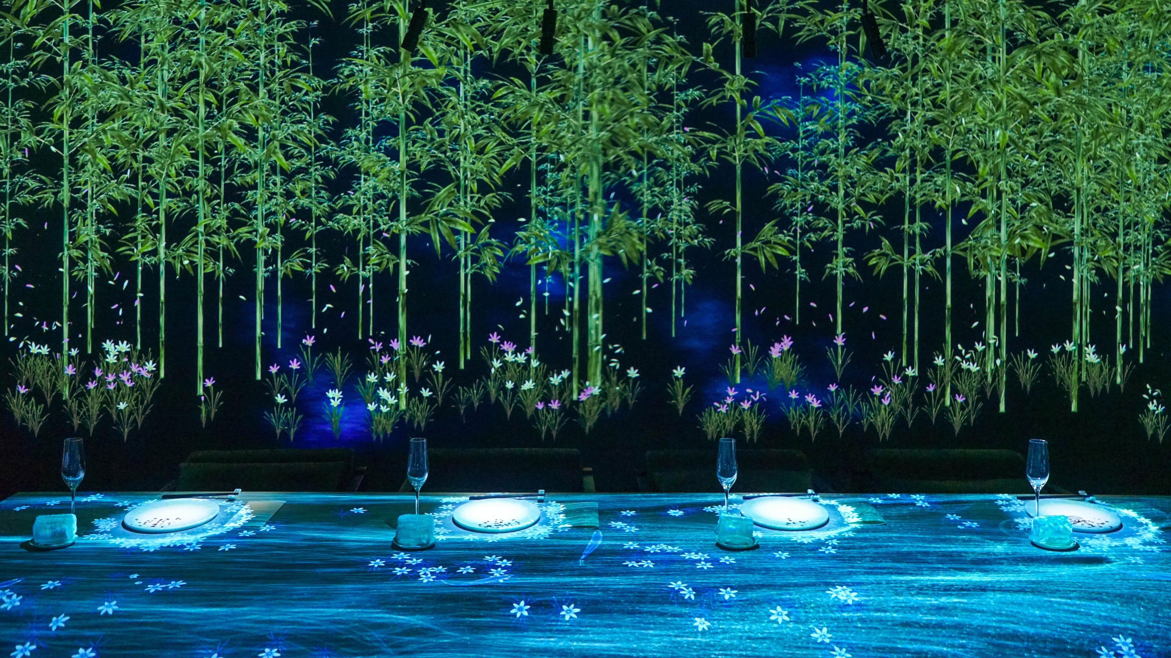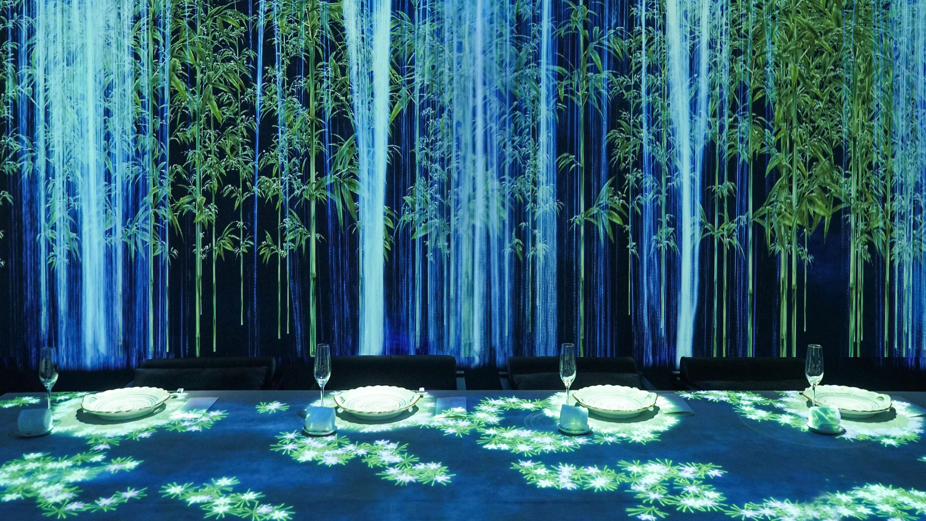 For example, a bird released from one dish can perch on the branch of a tree unleashed from another. The trees that grow from each dish are not identical; their sizes and shapes are affected by the worlds unleashed by the other dishes on the table. These unleashed worlds are also affected by your behavior. If you stand still, a tiny bird might alight on your hand; if you move suddenly, it might fly away. The worlds unleashed from the dishes on the table influence each other, react to the actions of visitors, and combine to create one single continuous world. The world is constantly changing from movement to moment and no two moments are alike.