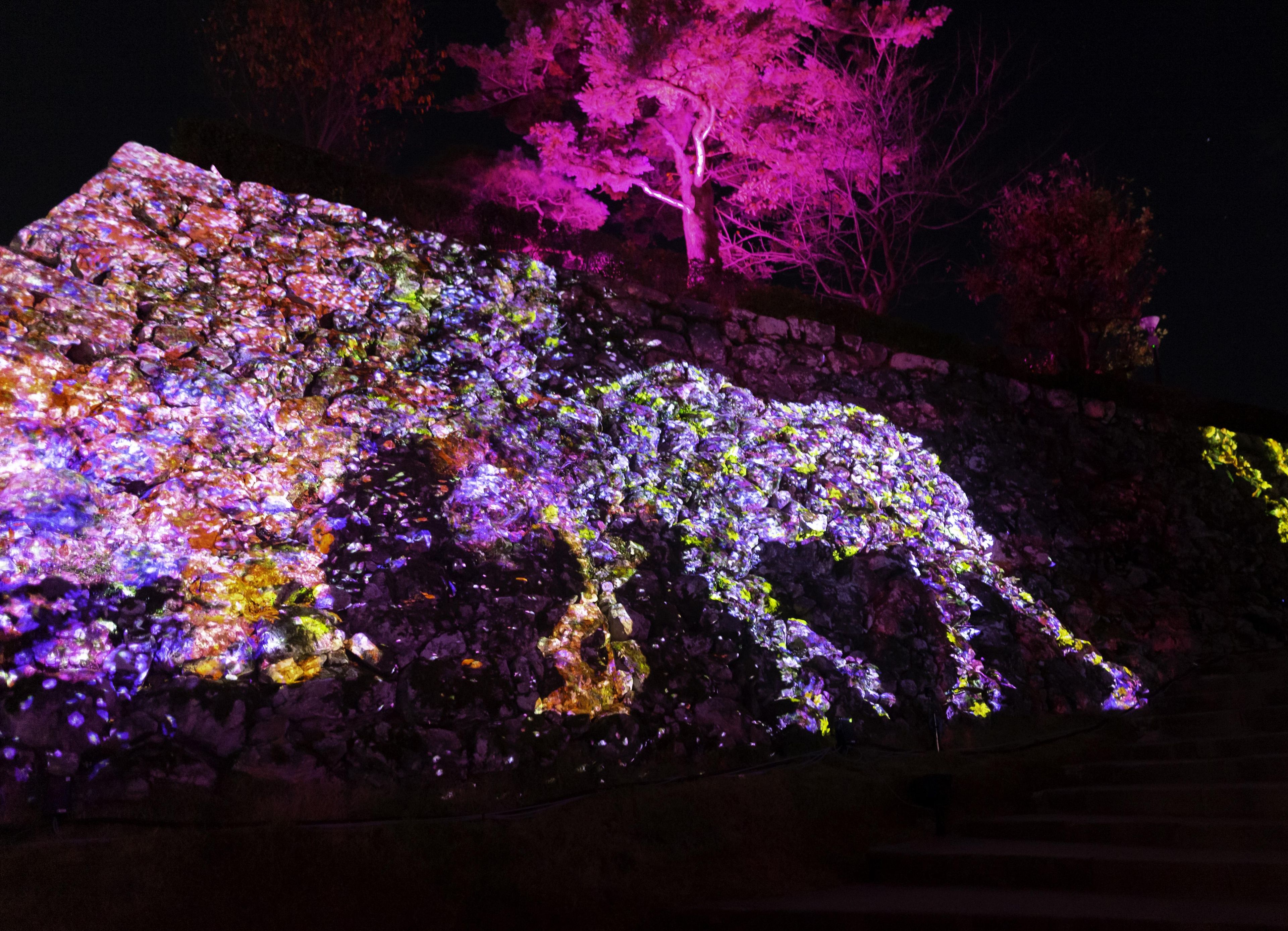 Flowers grow from the bodies of animals that inhabit the stone walls of Kochi Castle. The walls themselves are built on top of the undisturbed natural rock landscape.