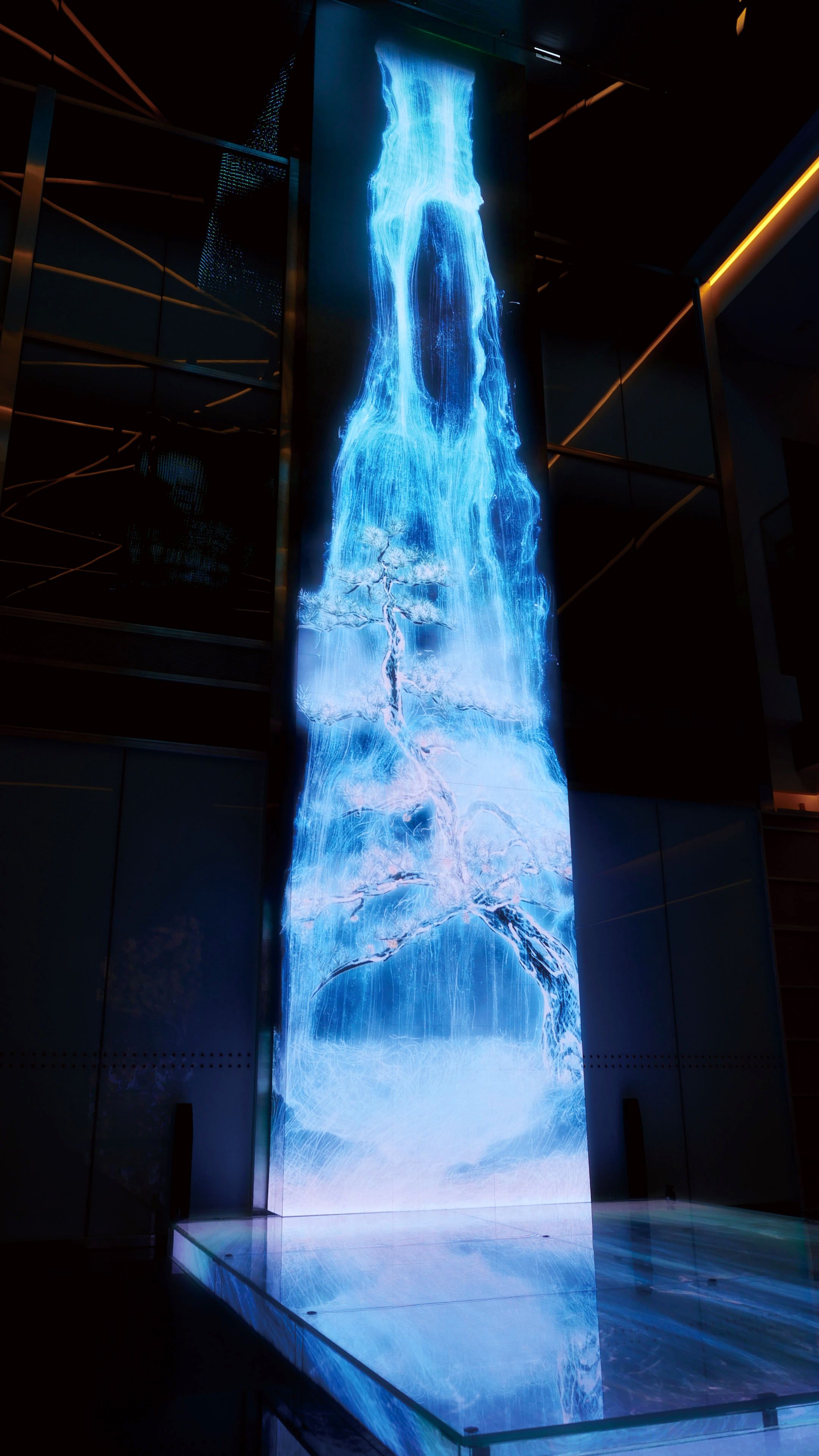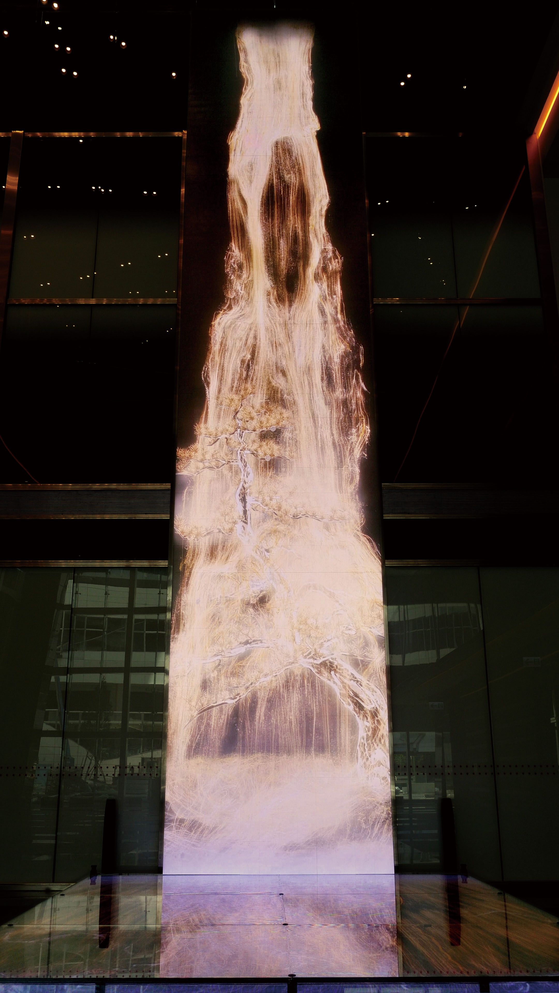 Dynamic, hued landscapes controlled by different factors, like viewers’ movements, or the temperature outside, emerge in “ultra-technologists group” teamLab’s magnificent interactive art installation at the CTBC Financial Park in Taipei. In a video released on their YouTube channel yesterday, the towering LED sculpture in the shape of ChinaTrust’s “Double-C Logo” cycles through a collection of visuals, including long strings of neon blue water with the consistency of angel hair trickling down a giant screen wall. The waterfall cascades down through a tall cherry blossom bonsai tree and onto a stage of glass panels, warping around the viewer’s stance. “Everything is connected in a cycle, but no events are ever repeated in exactly the same way,” teamLab explains in Circulum Formosa’s video description, channeling the complexity of the natural forces the piece imitates.