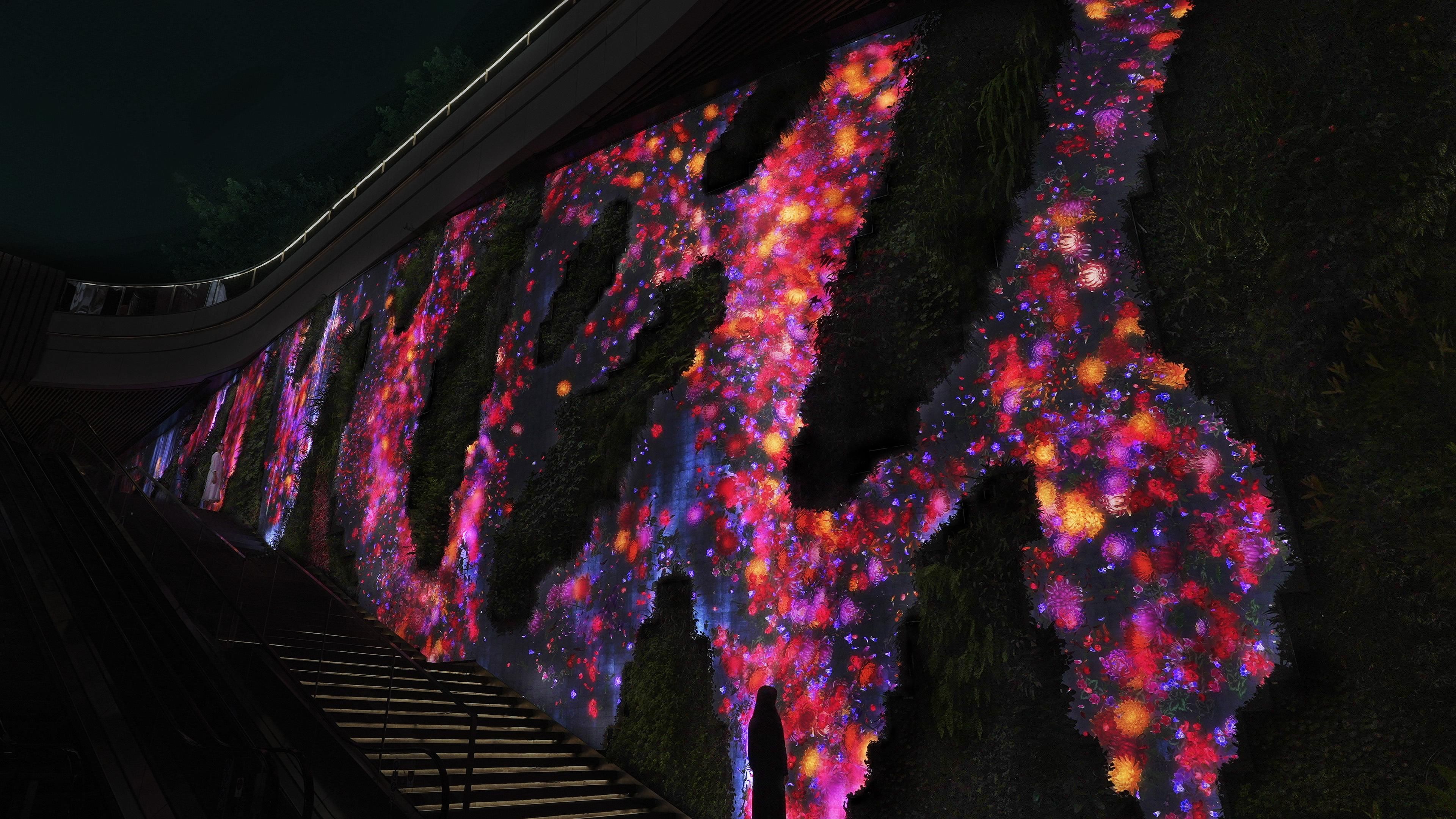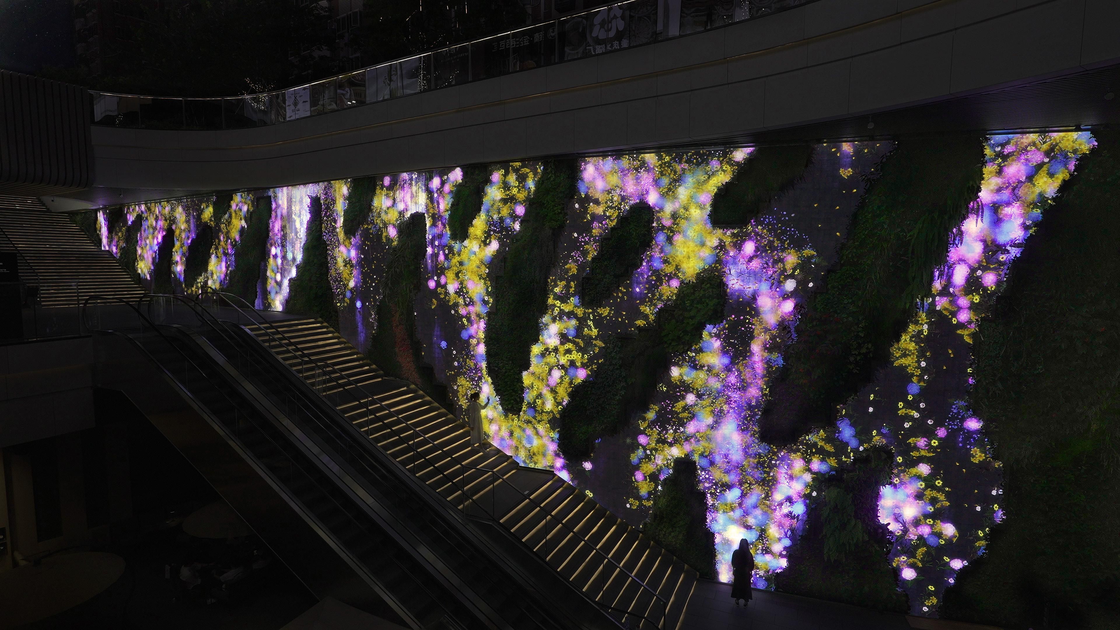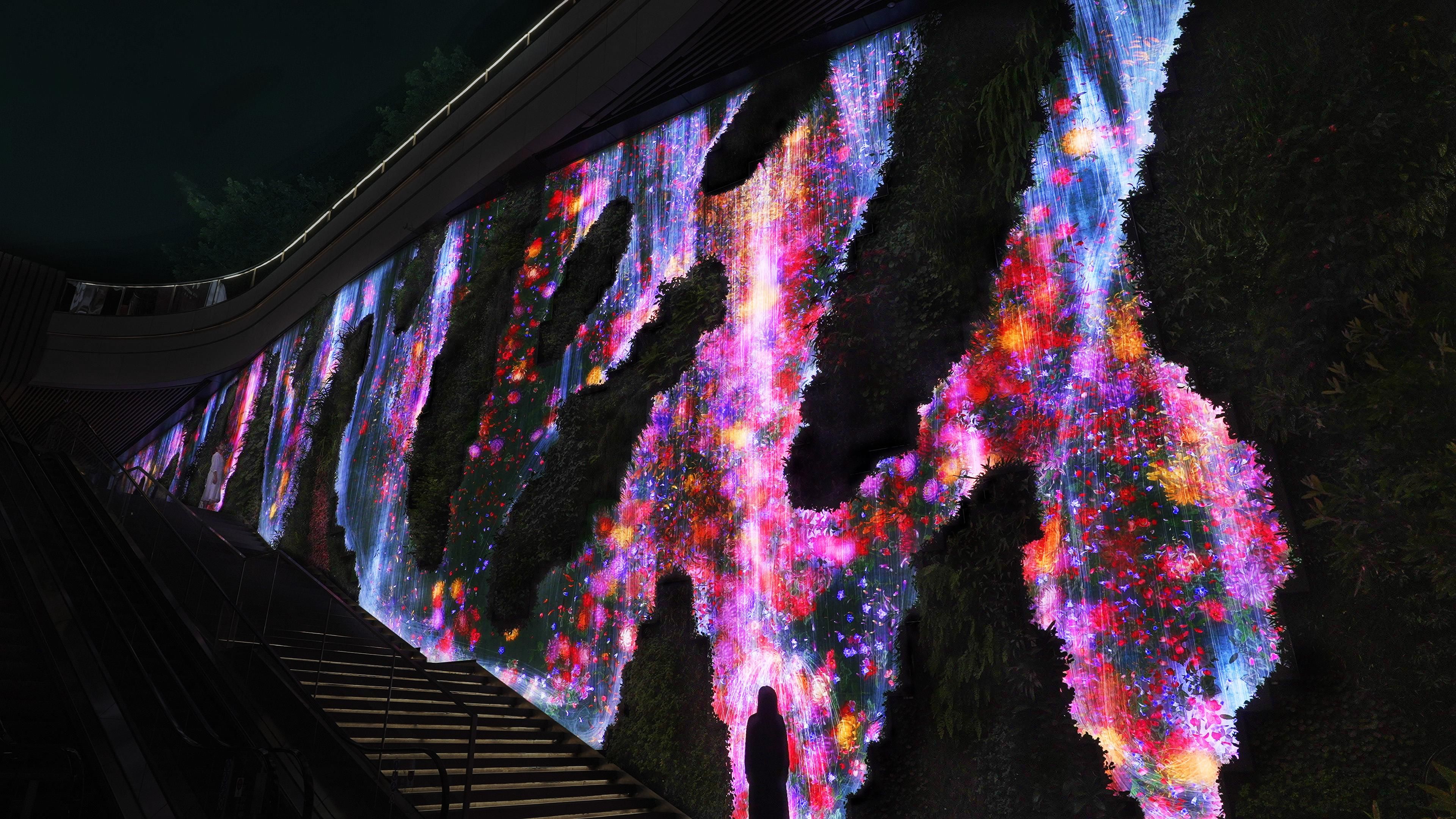 teamLab's waterfall flows and flowers bloom in Patrick Blanc's vertical garden.