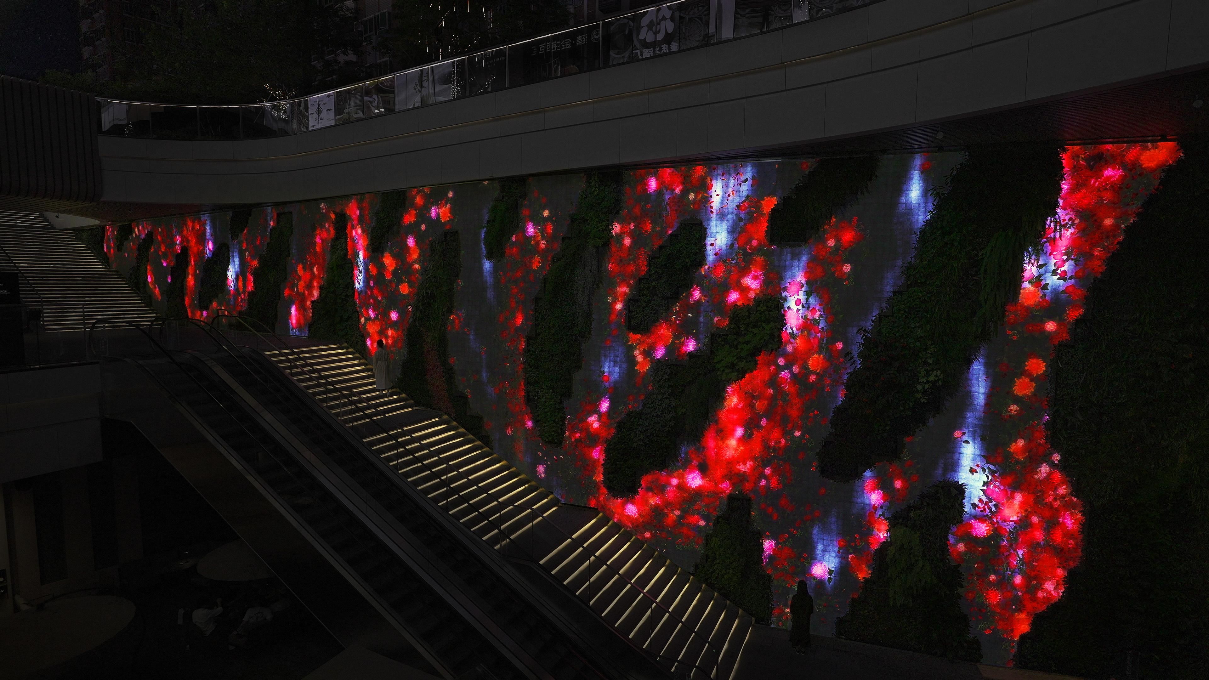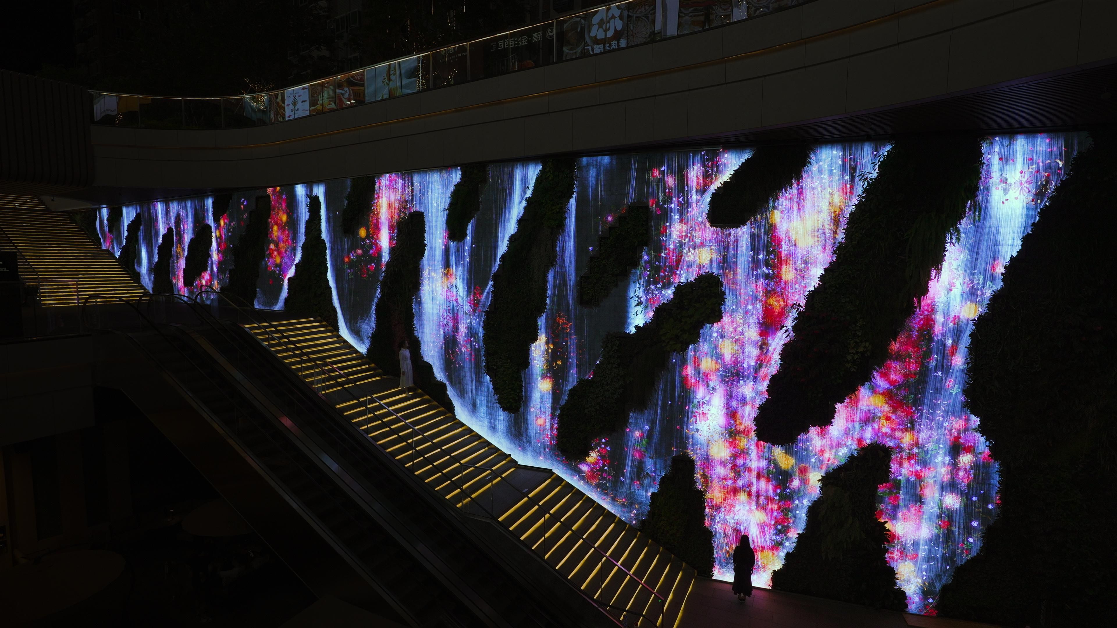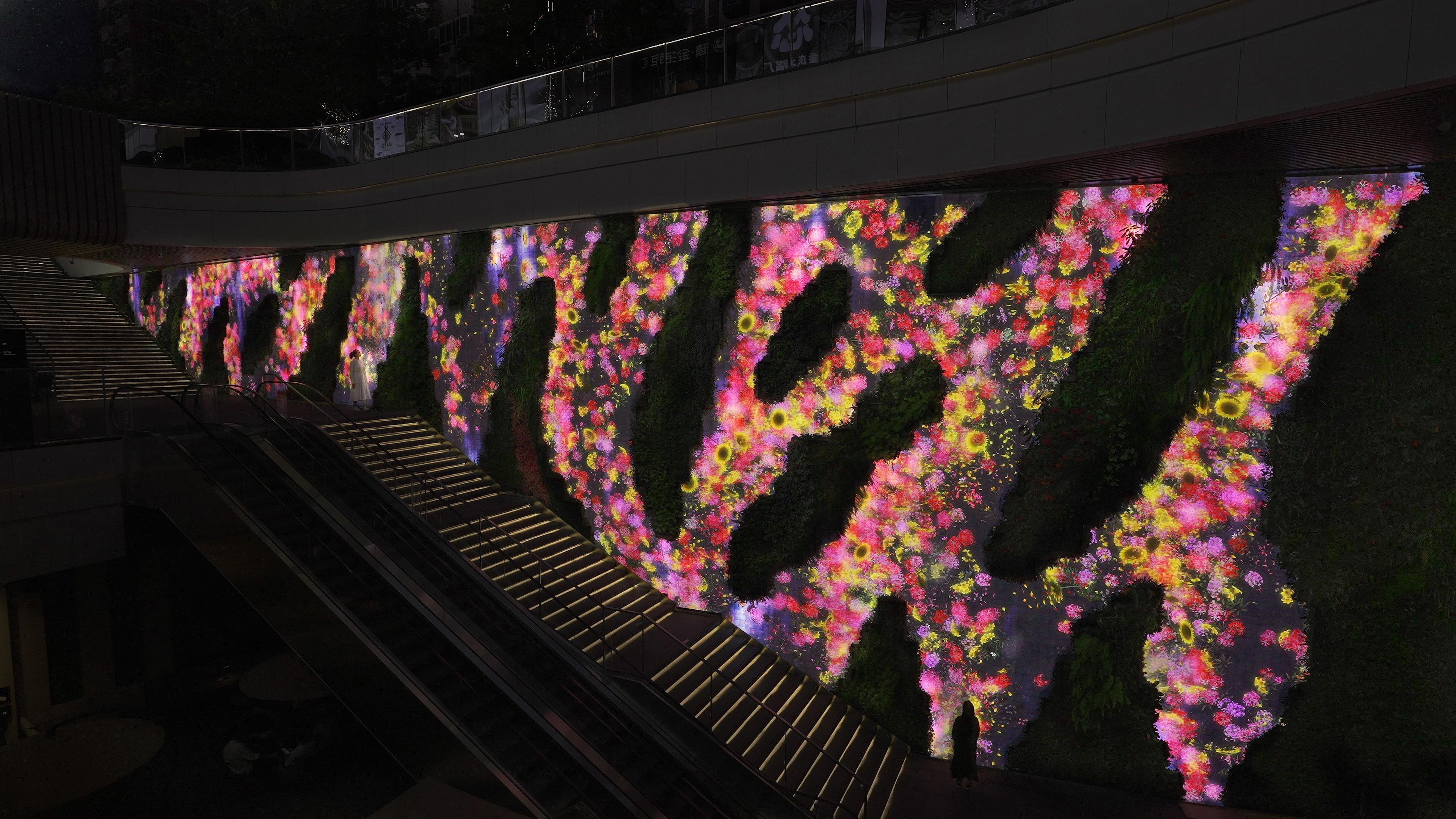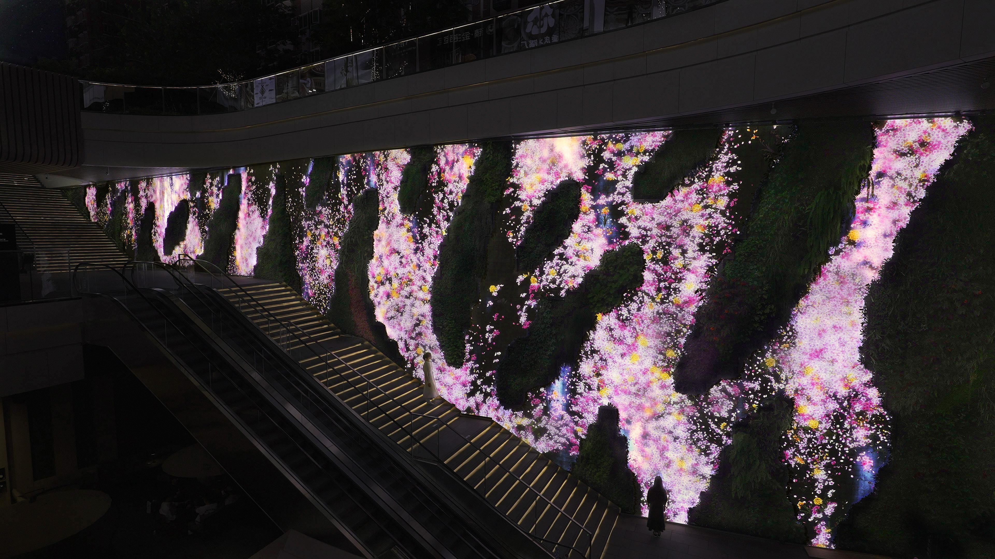 teamLab's waterfall flows and flowers bloom in Patrick Blanc's vertical garden.