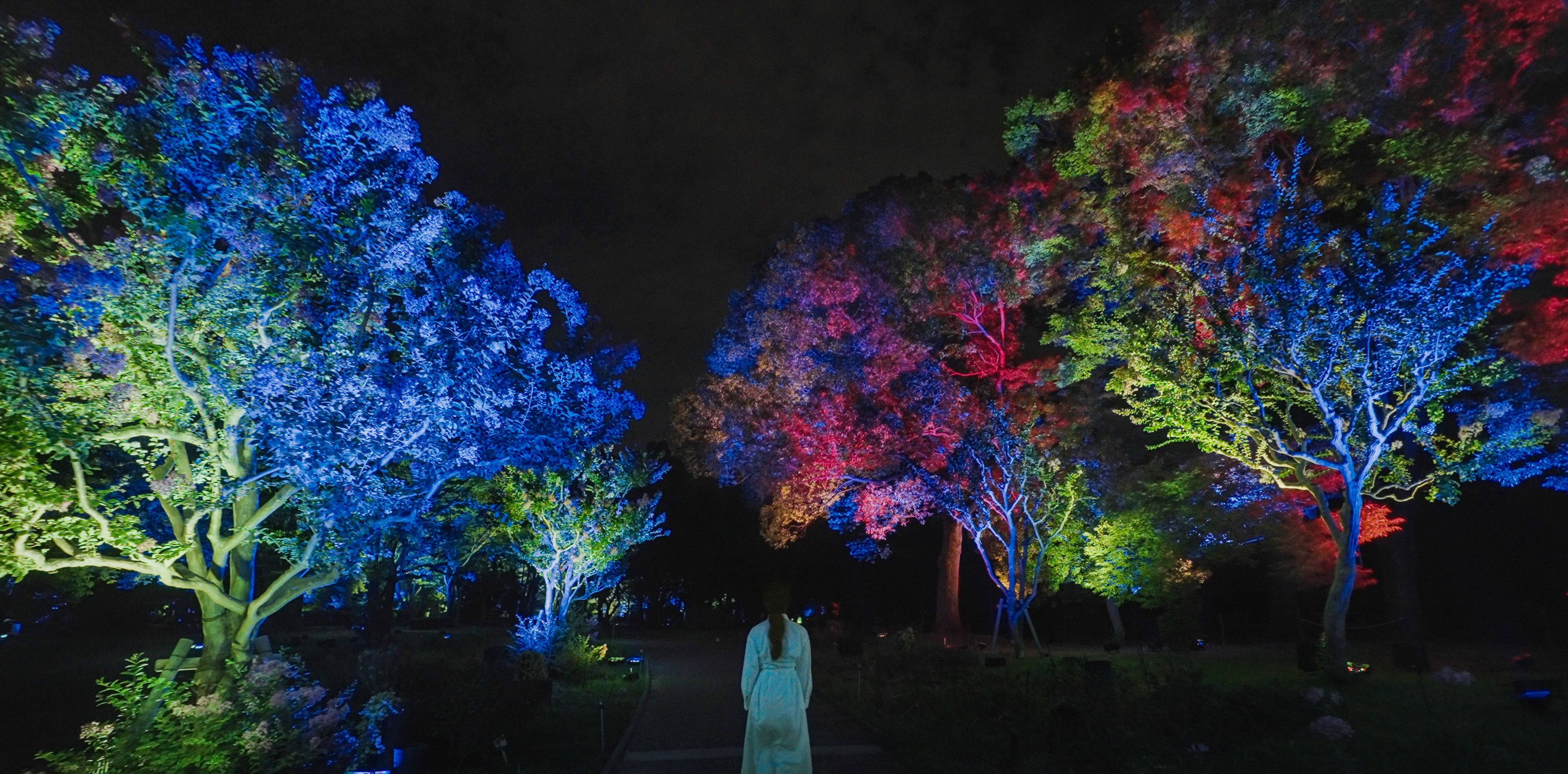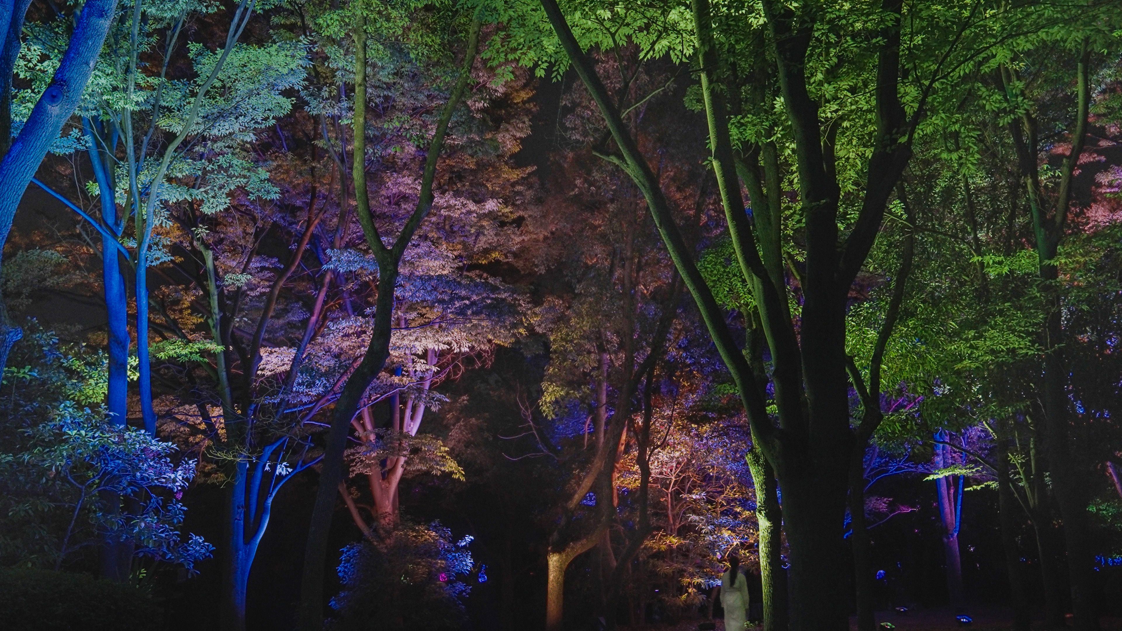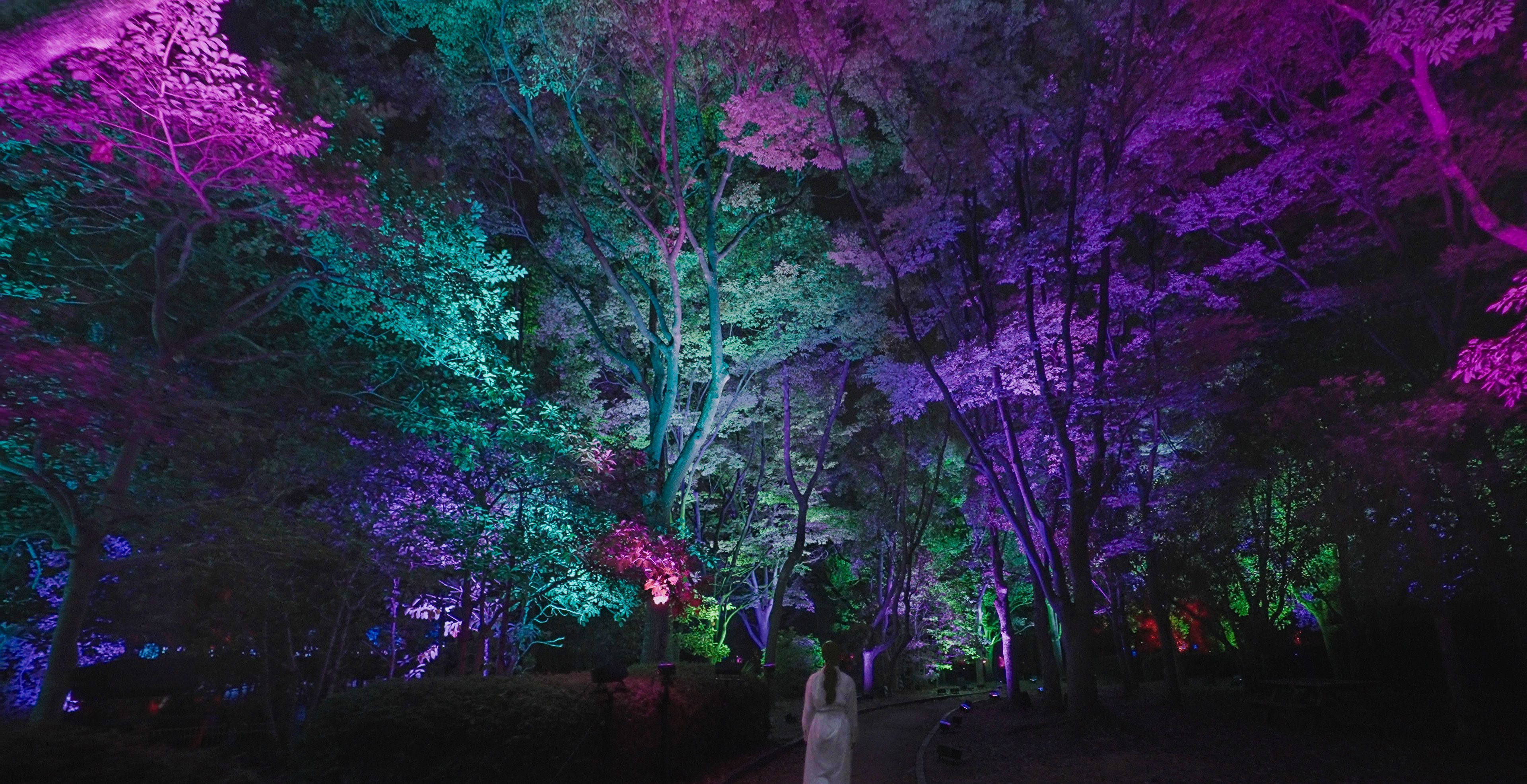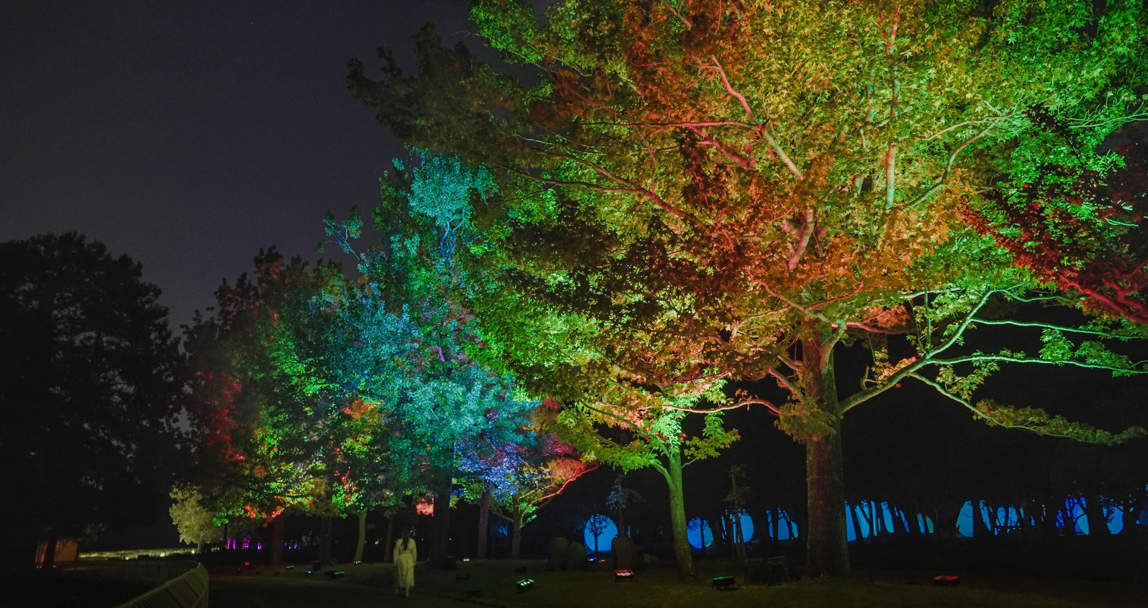 When people pass close to the trees, the light changes color, and a tone specific to that color resonates out. The light of the tree is transmitted to the surrounding trees one by one, continuously emitting the same tone.