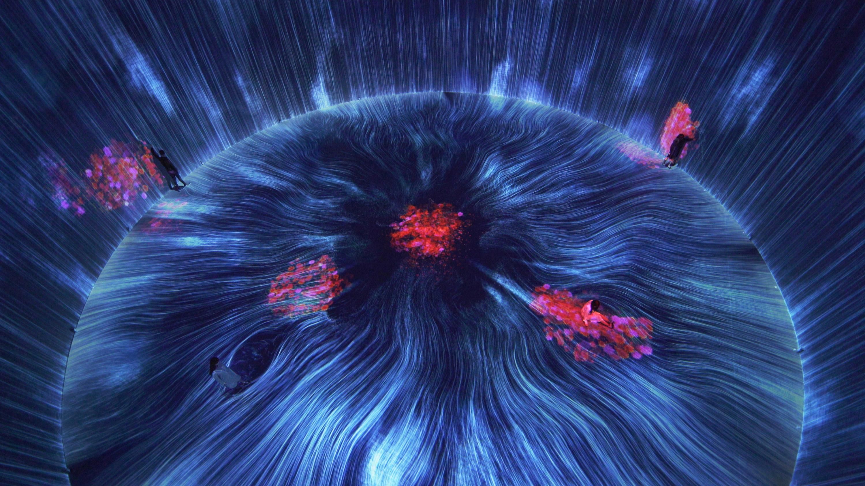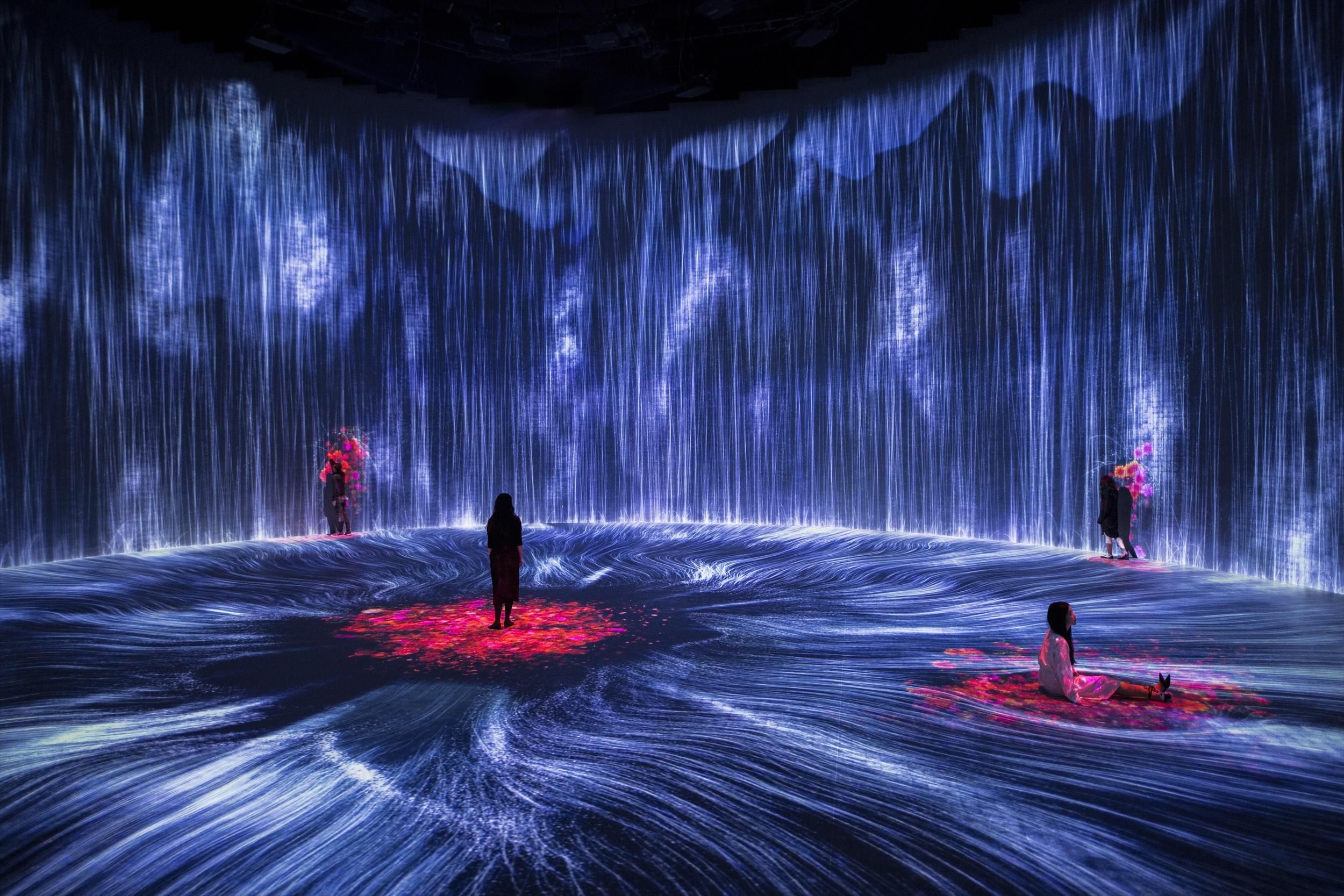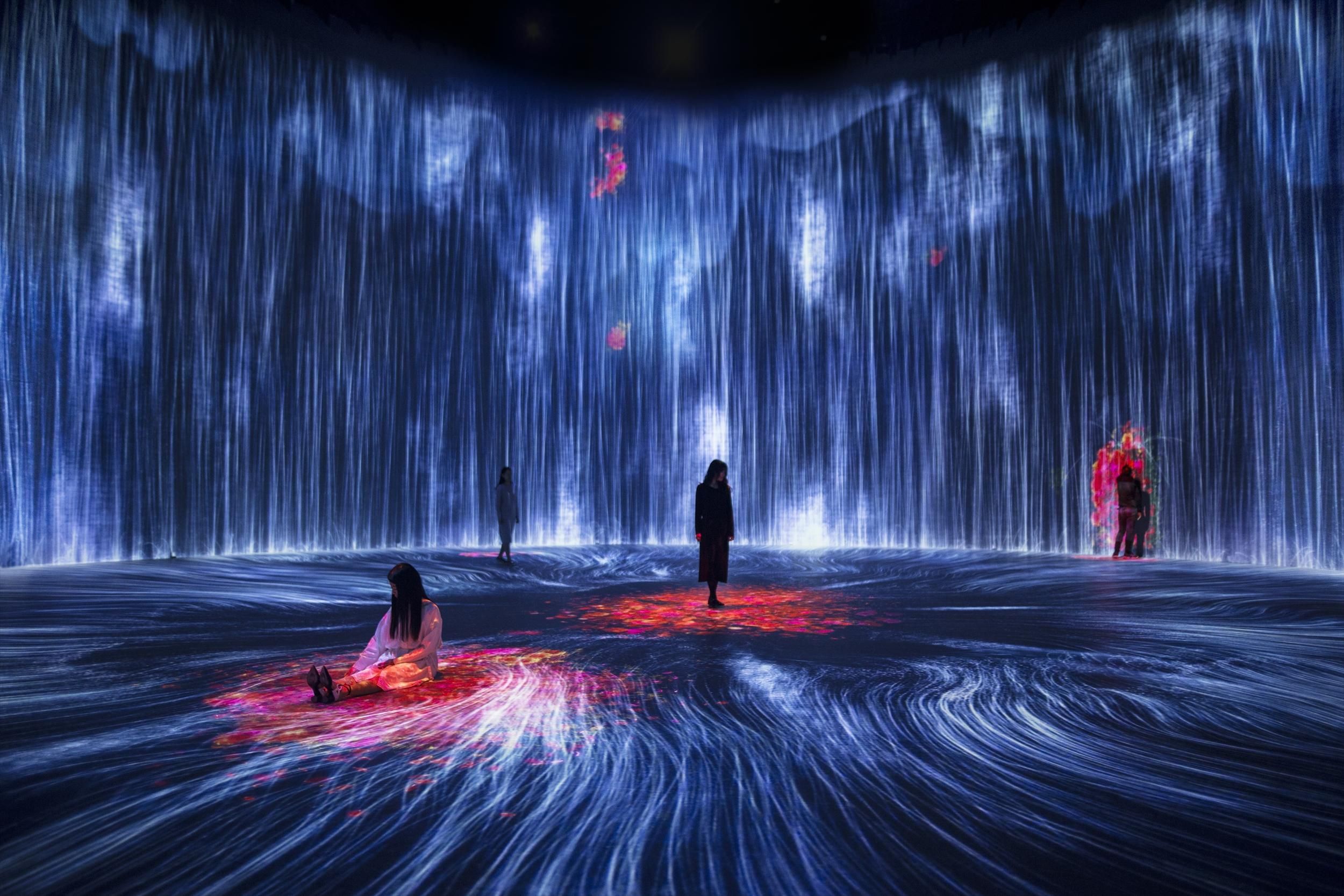 Water is represented by a continuum of numerous water particles. The interaction between the particles is calculated and then lines are drawn in relation to the behavior of the water particles. The lines are “flattened” using what teamLab considers to be ultrasubjective space.