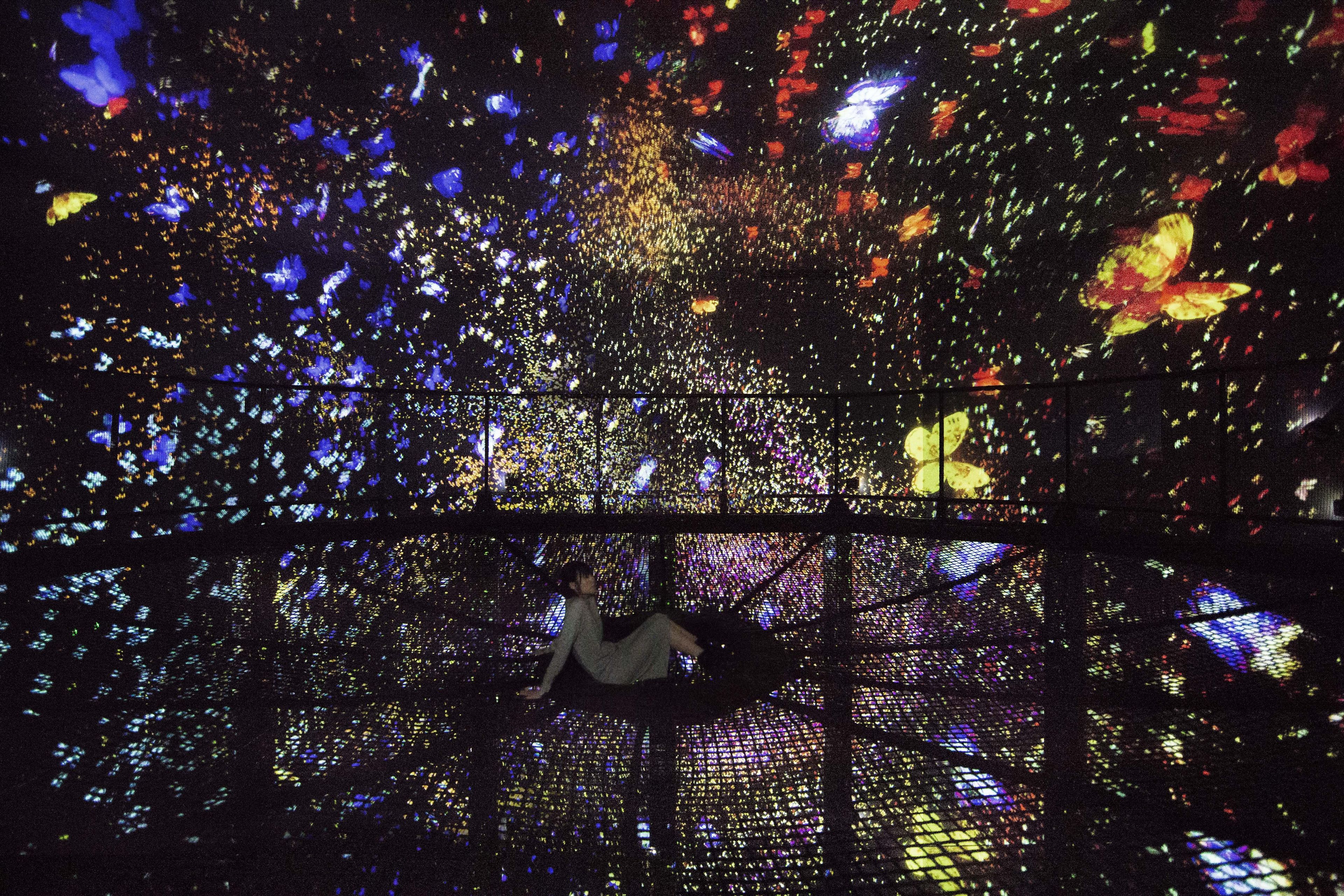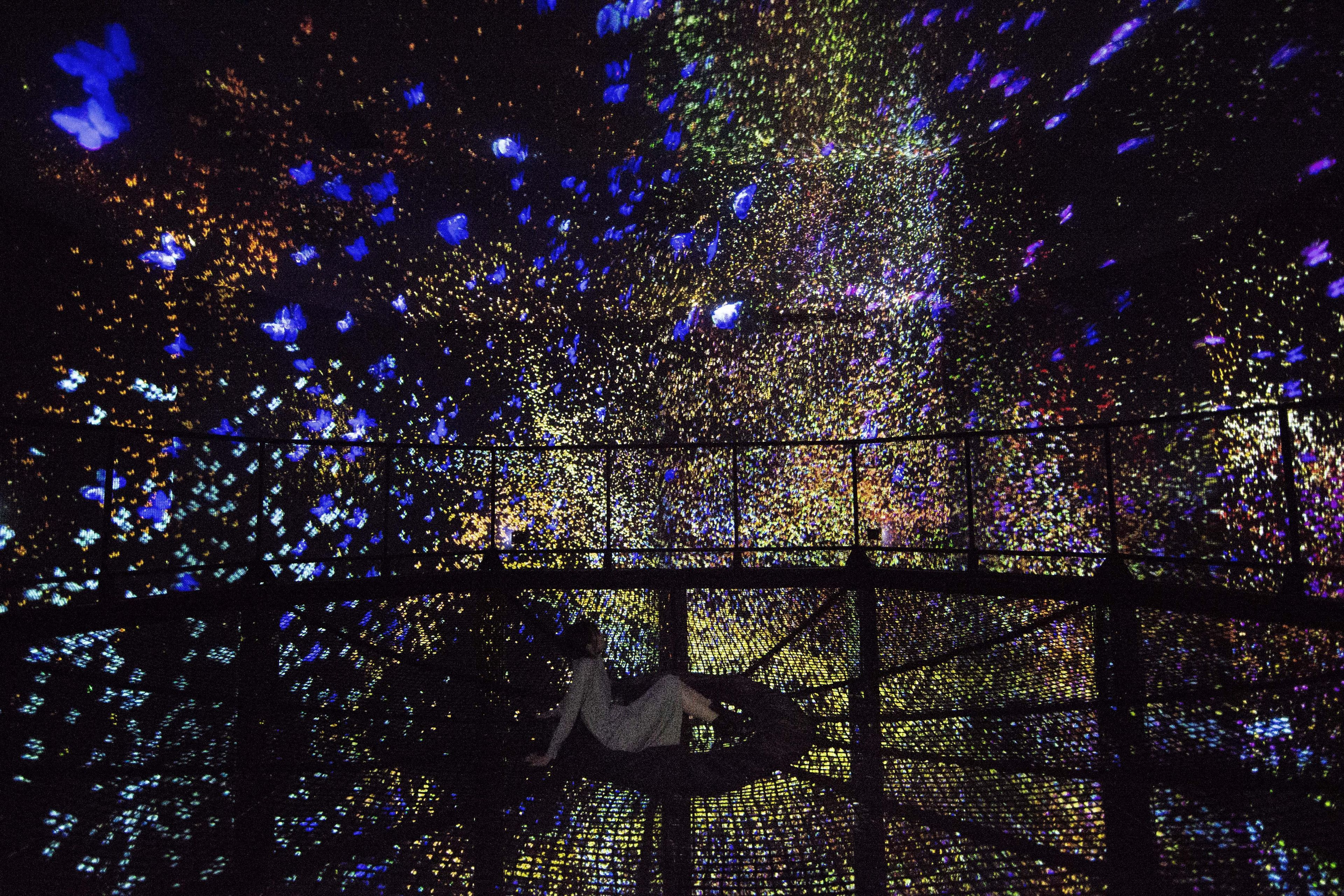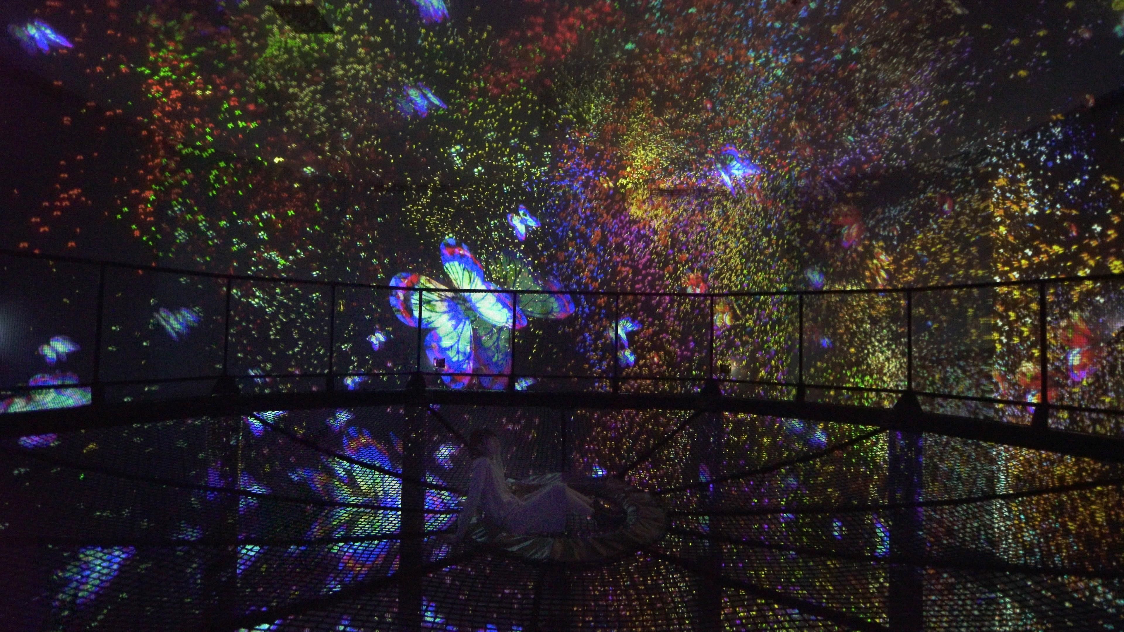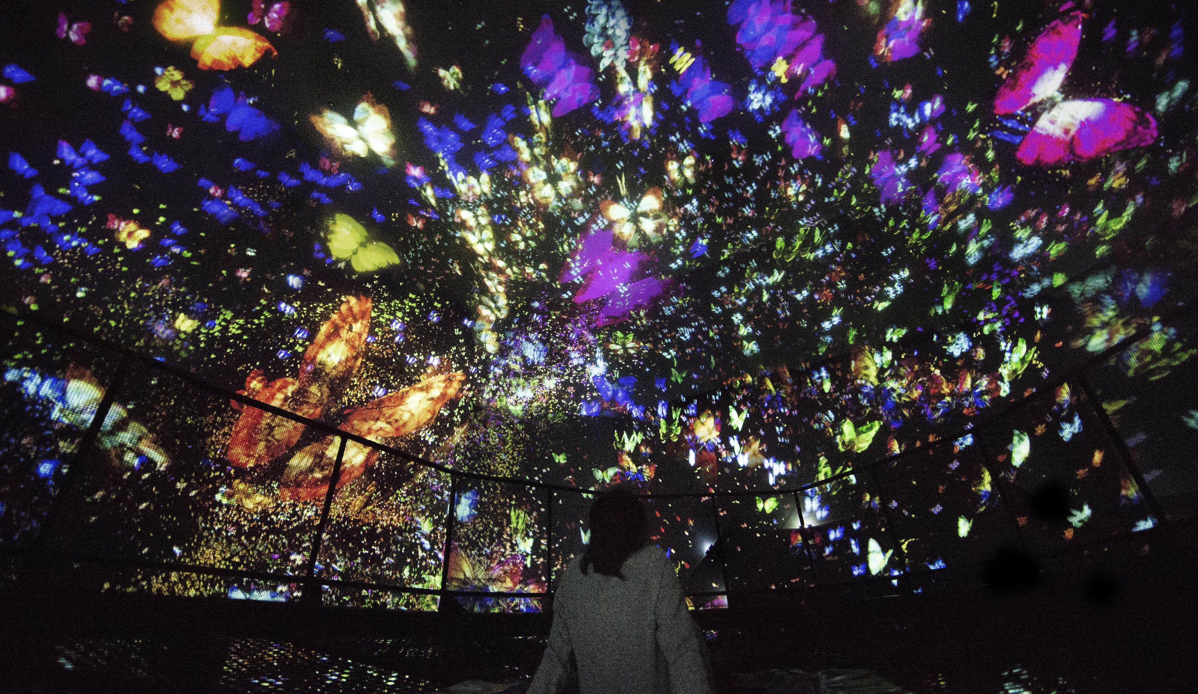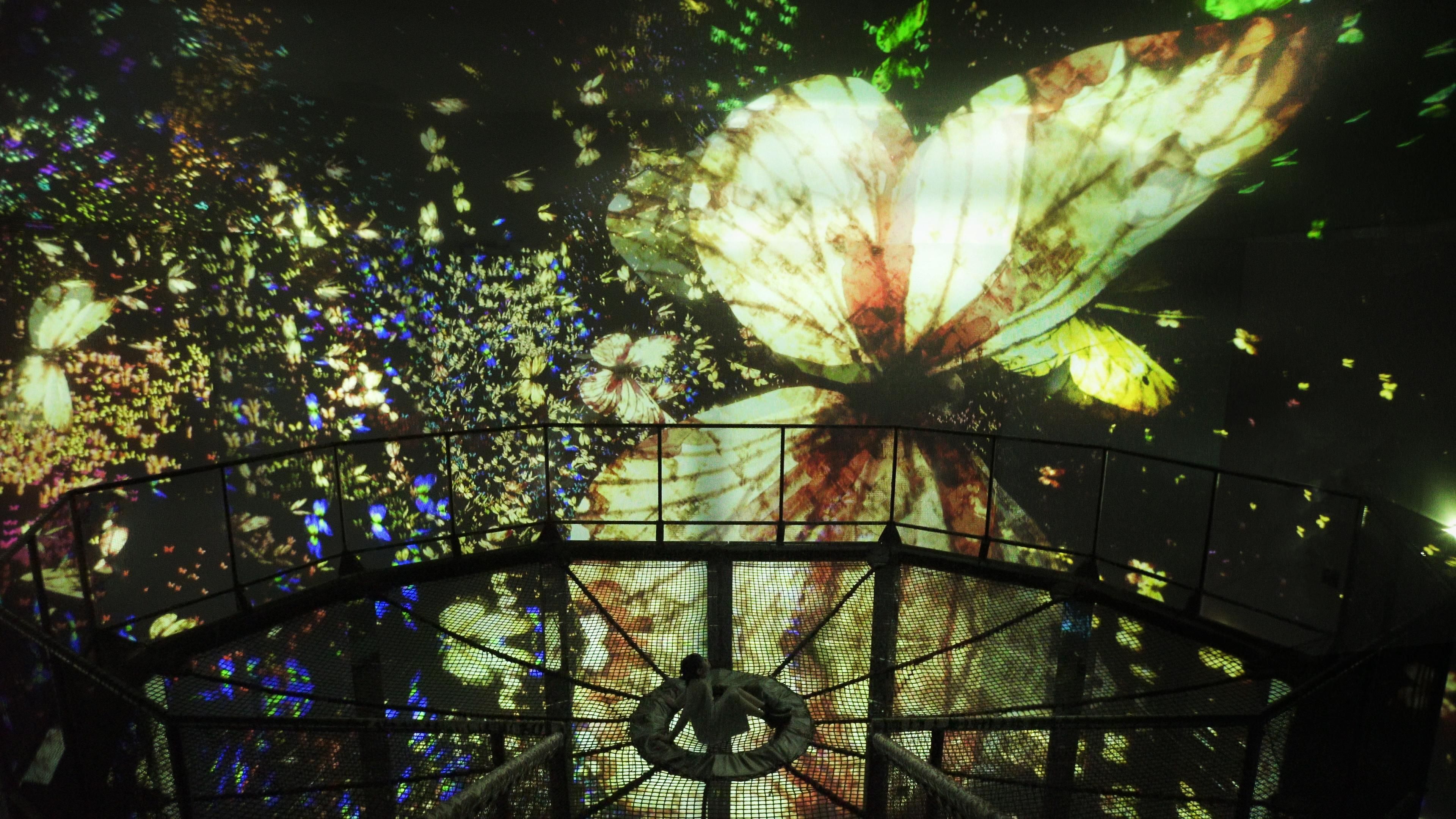 The group of butterflies that come into this space are those from the Flutter of Butterflies Beyond Borders (a group of butterflies born from other artworks, such as the butterflies born from people’s bodies in the Butterfly House). These butterflies release art from the concept of the frame, removing boundaries from the artwork space, the butterflies seamlessly fly inside other artworks.